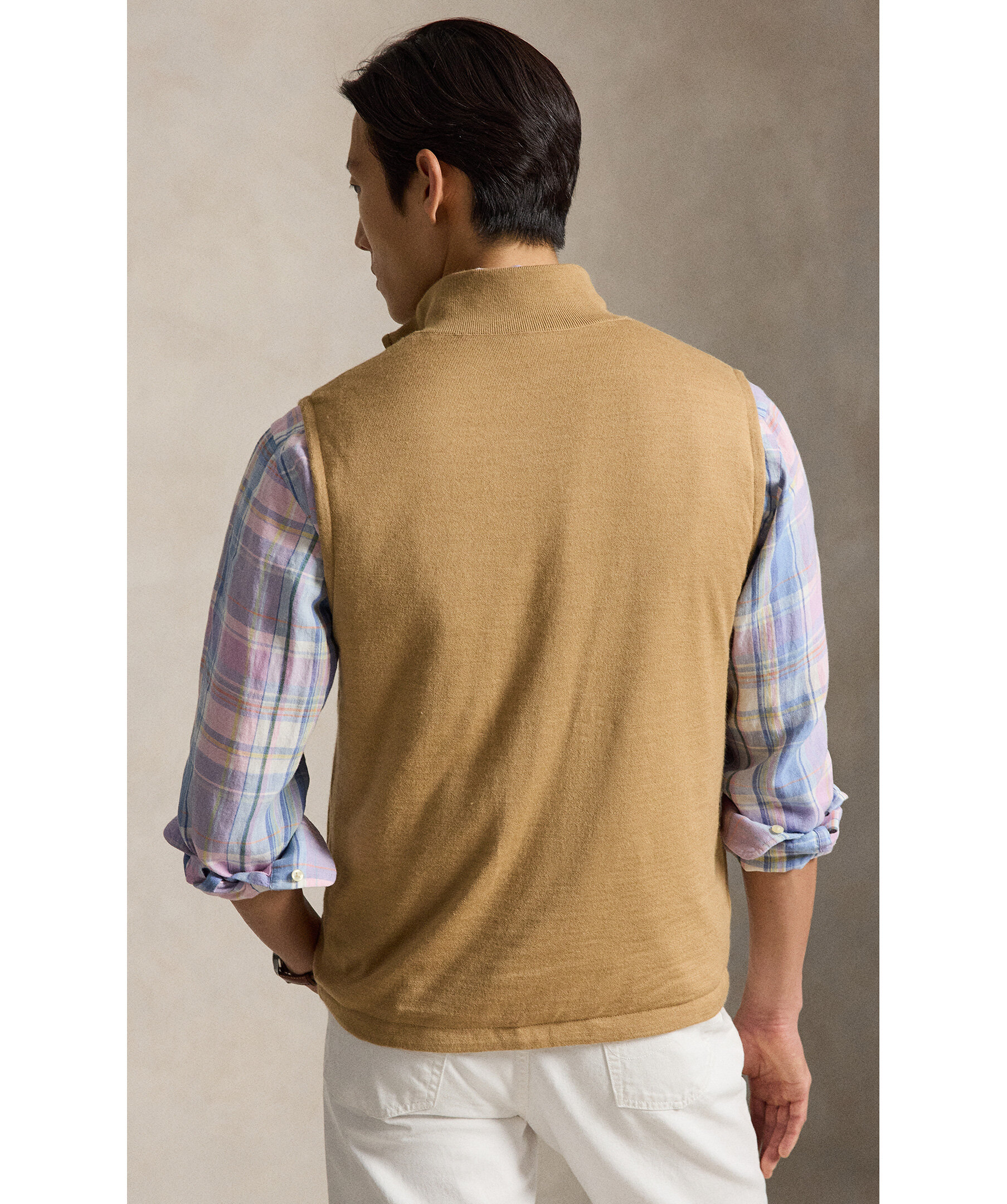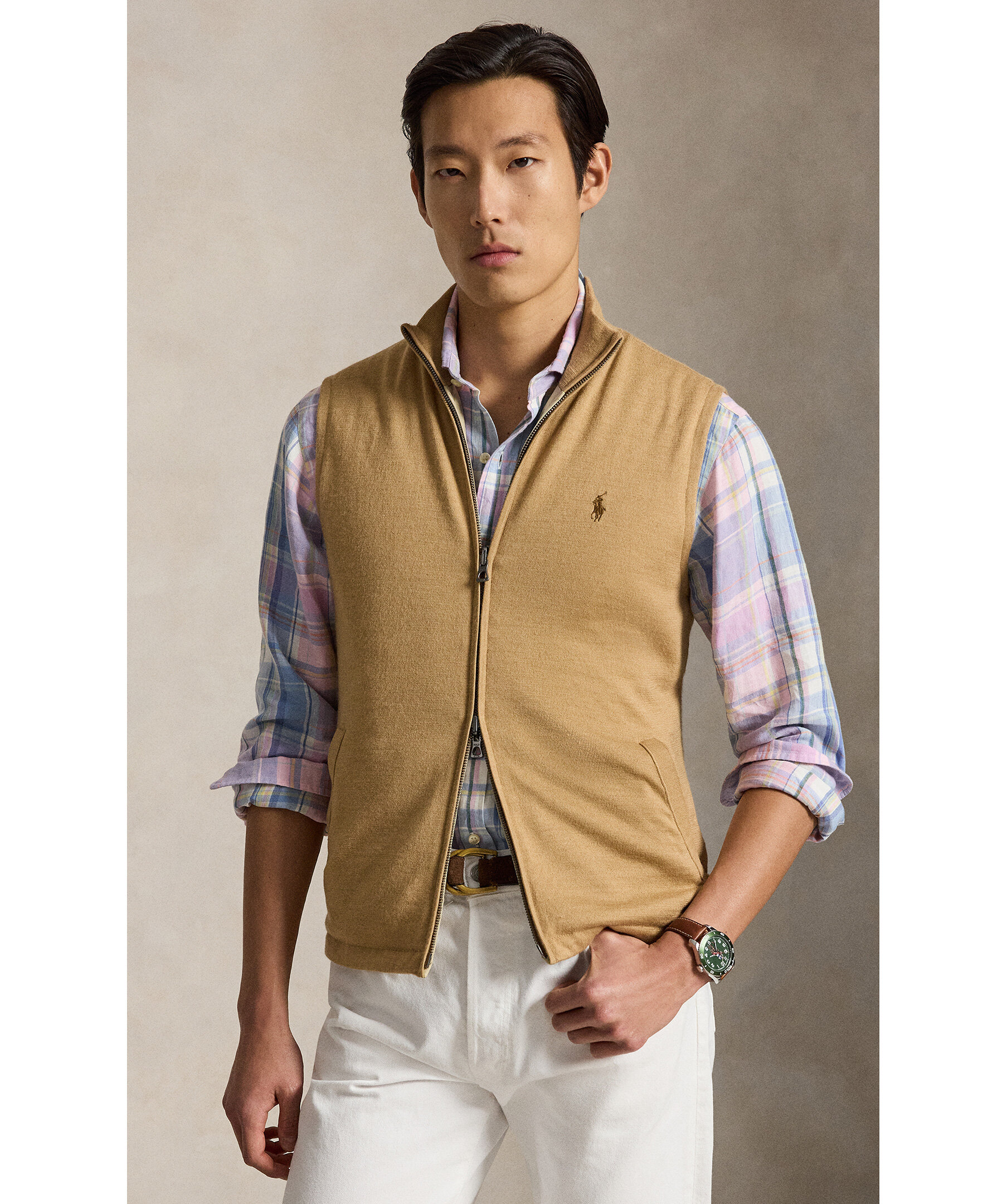 Reversibel väst från Ralph Lauren. Plagget har en normal passform och erbjuder två olika looks i ett tack vare sin innovativa reversible‑design, på ena sidan en klassisk stickad yta och på den andra en slät, vävd finish som ger en modern och funktionell stil. Den är stickad med COOLMAX®‑fibrer som hjälper till att hålla dig sval, torr och bekväm under dagen, och varje sida har en ton‑i‑ton version av den ikoniska logotypen för subtil brand‑identitet.