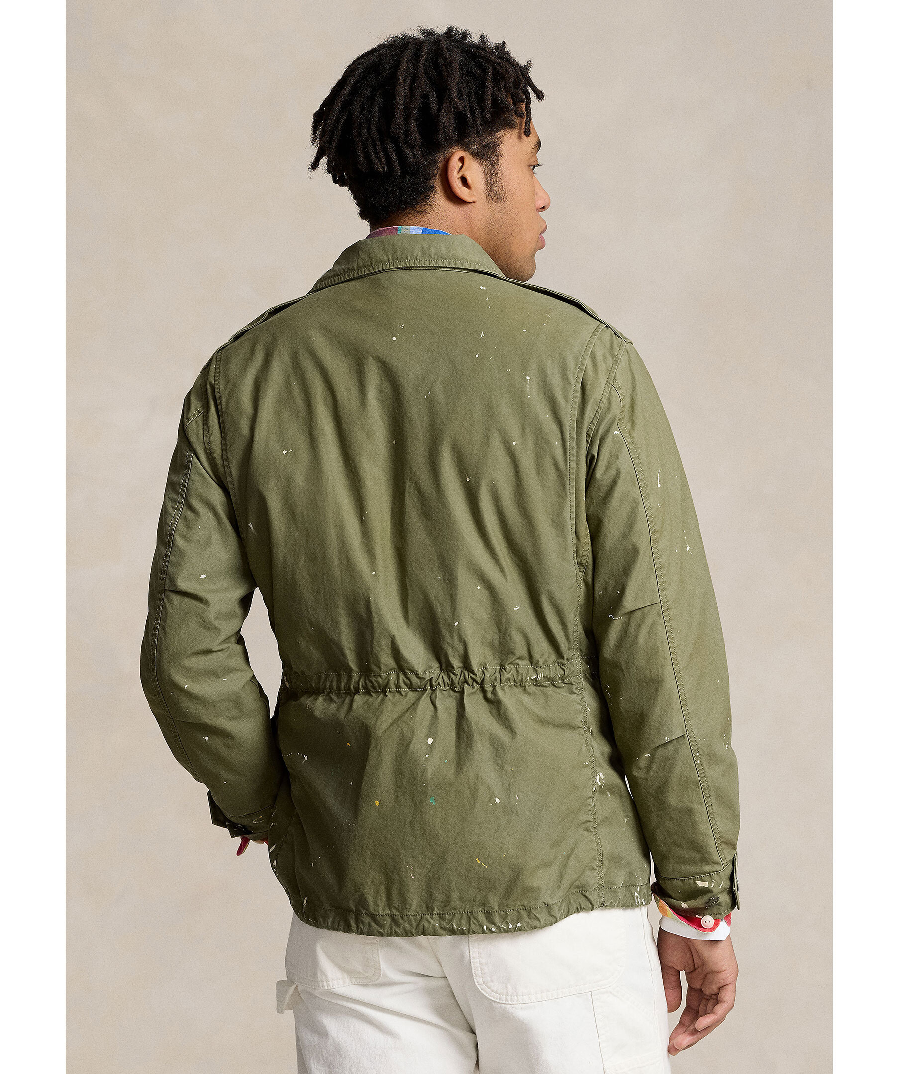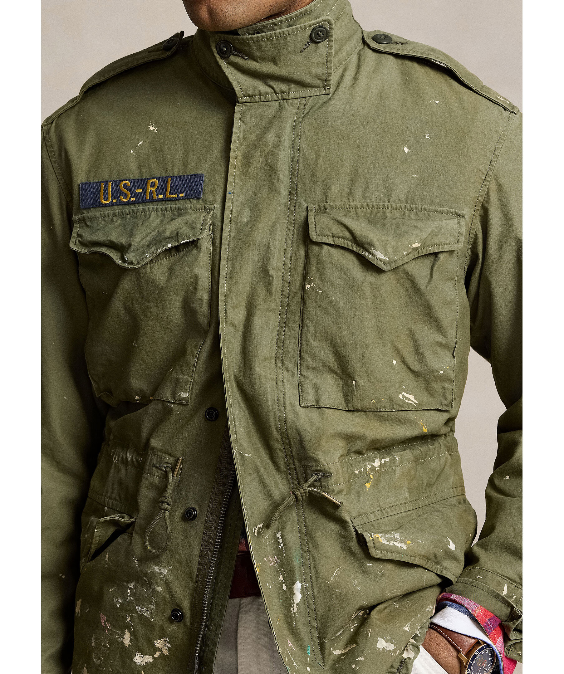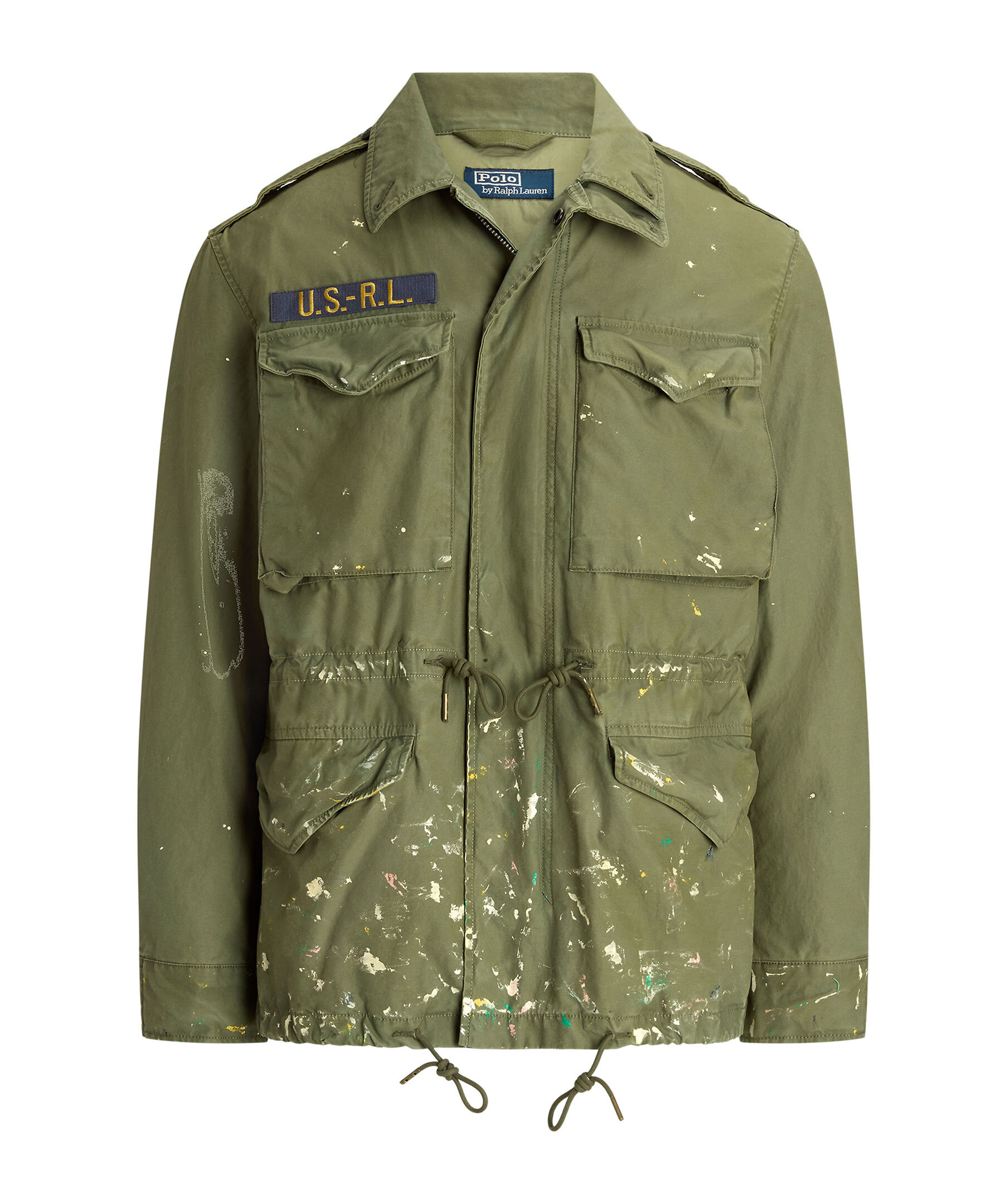 Grön militärjacka med medvetet färgstänk från Polo Ralph Lauren. Stängs med dold tvåvägsdragkedja och tryckknappar. Dragsko i midjan och vid plaggslut, den har fyra fickor med lock, U.S R.L logotyp på höger bröstficka. Tillverkad i bomull.