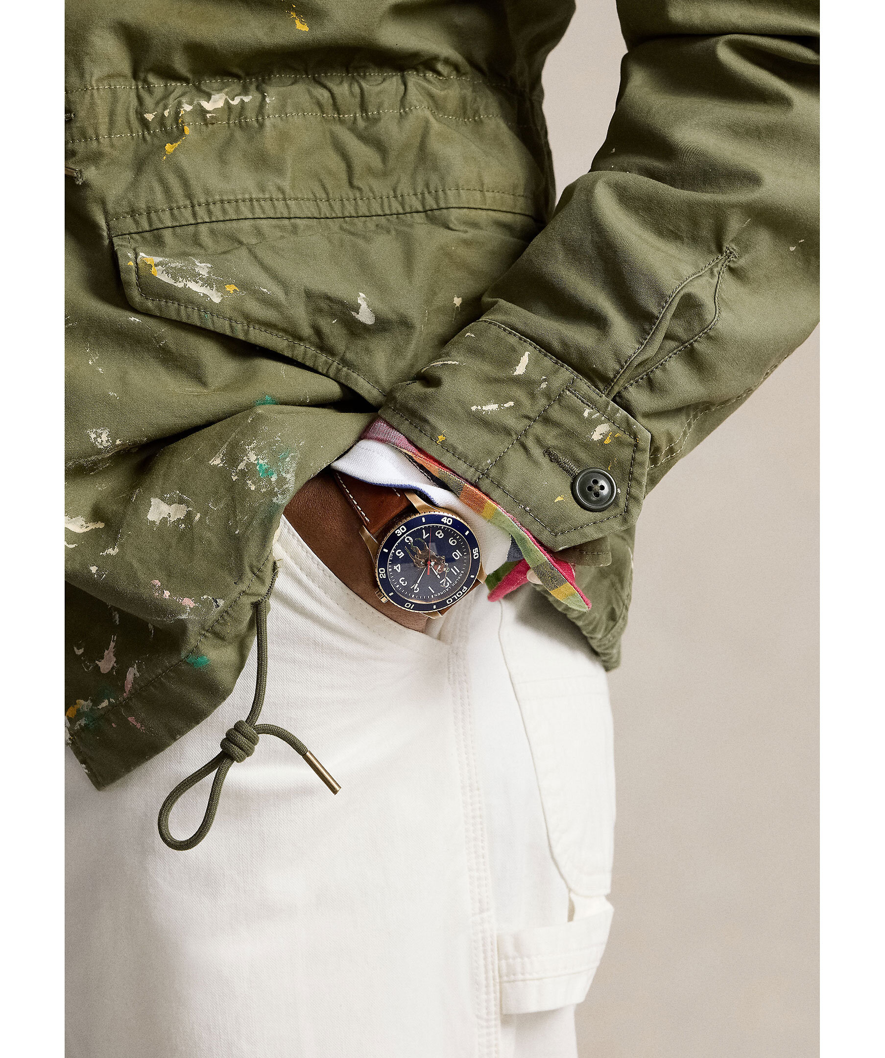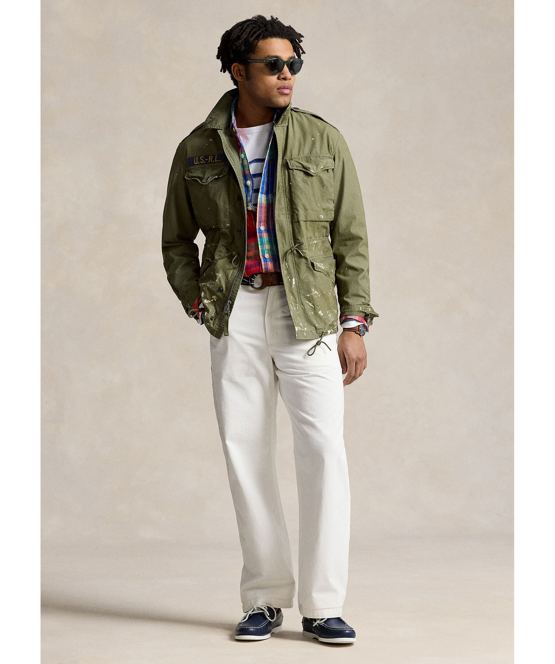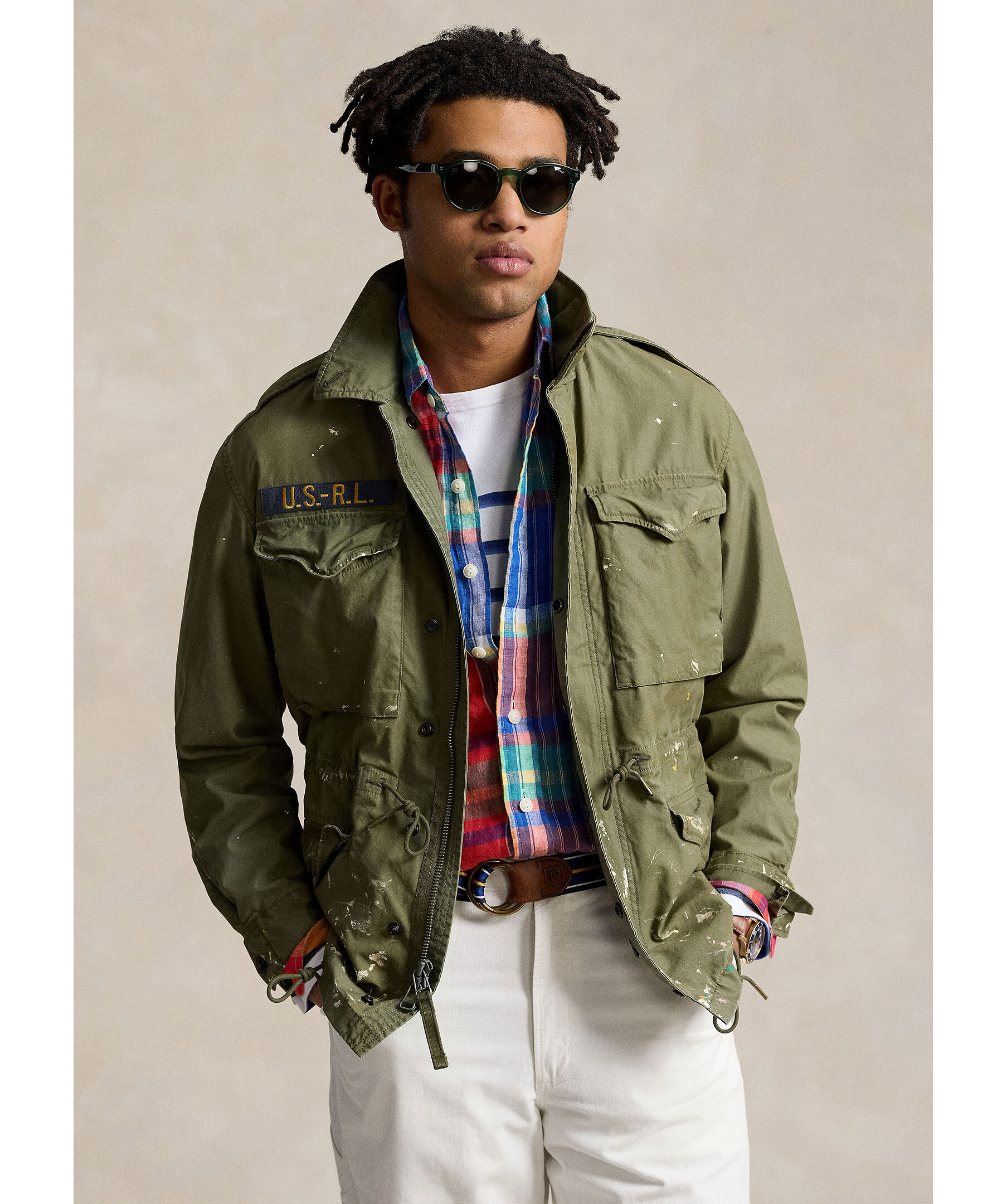 Grön militärjacka med medvetet färgstänk från Polo Ralph Lauren. Stängs med dold tvåvägsdragkedja och tryckknappar. Dragsko i midjan och vid plaggslut, den har fyra fickor med lock, U.S R.L logotyp på höger bröstficka. Tillverkad i bomull.