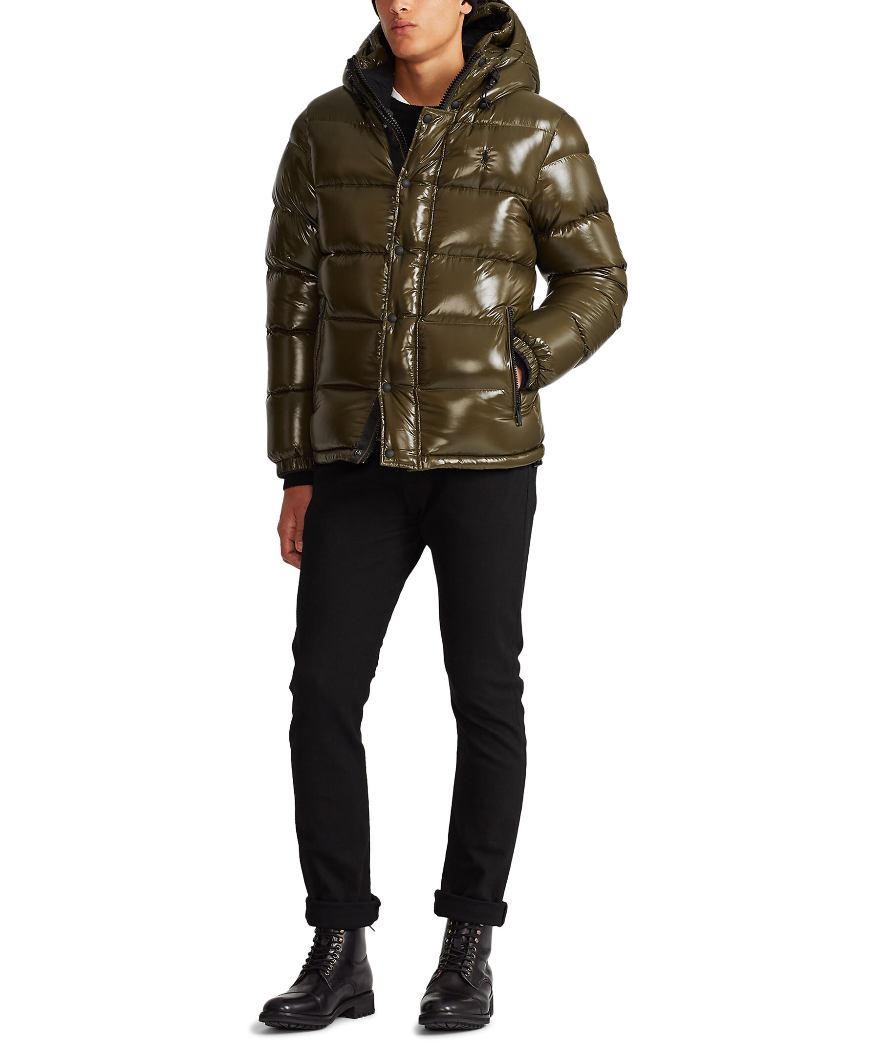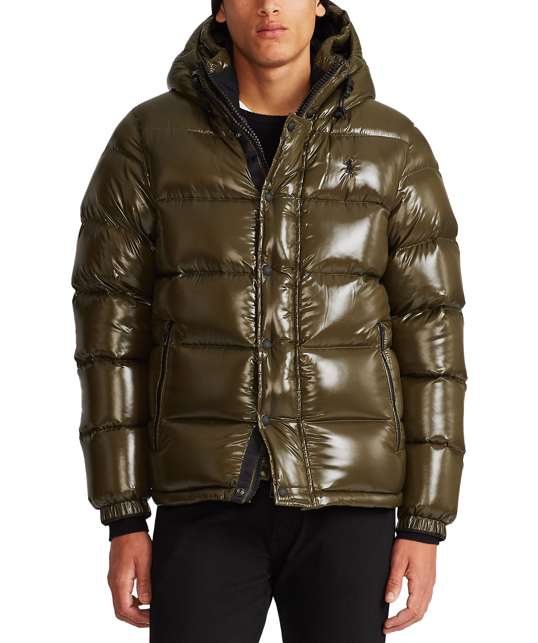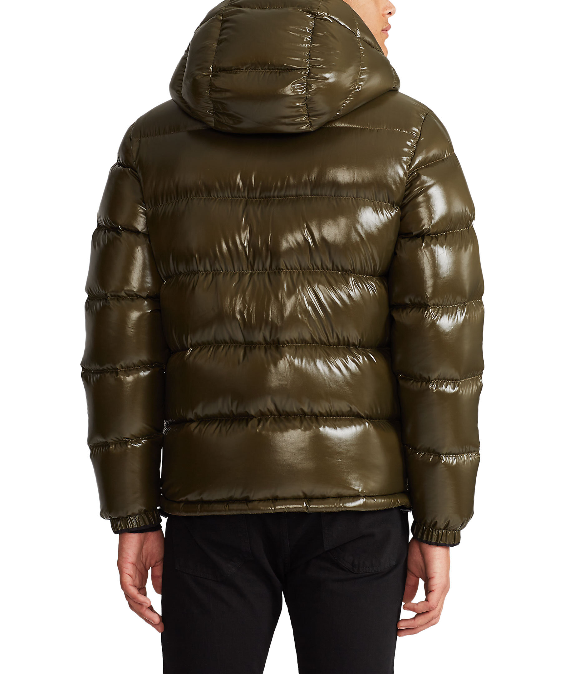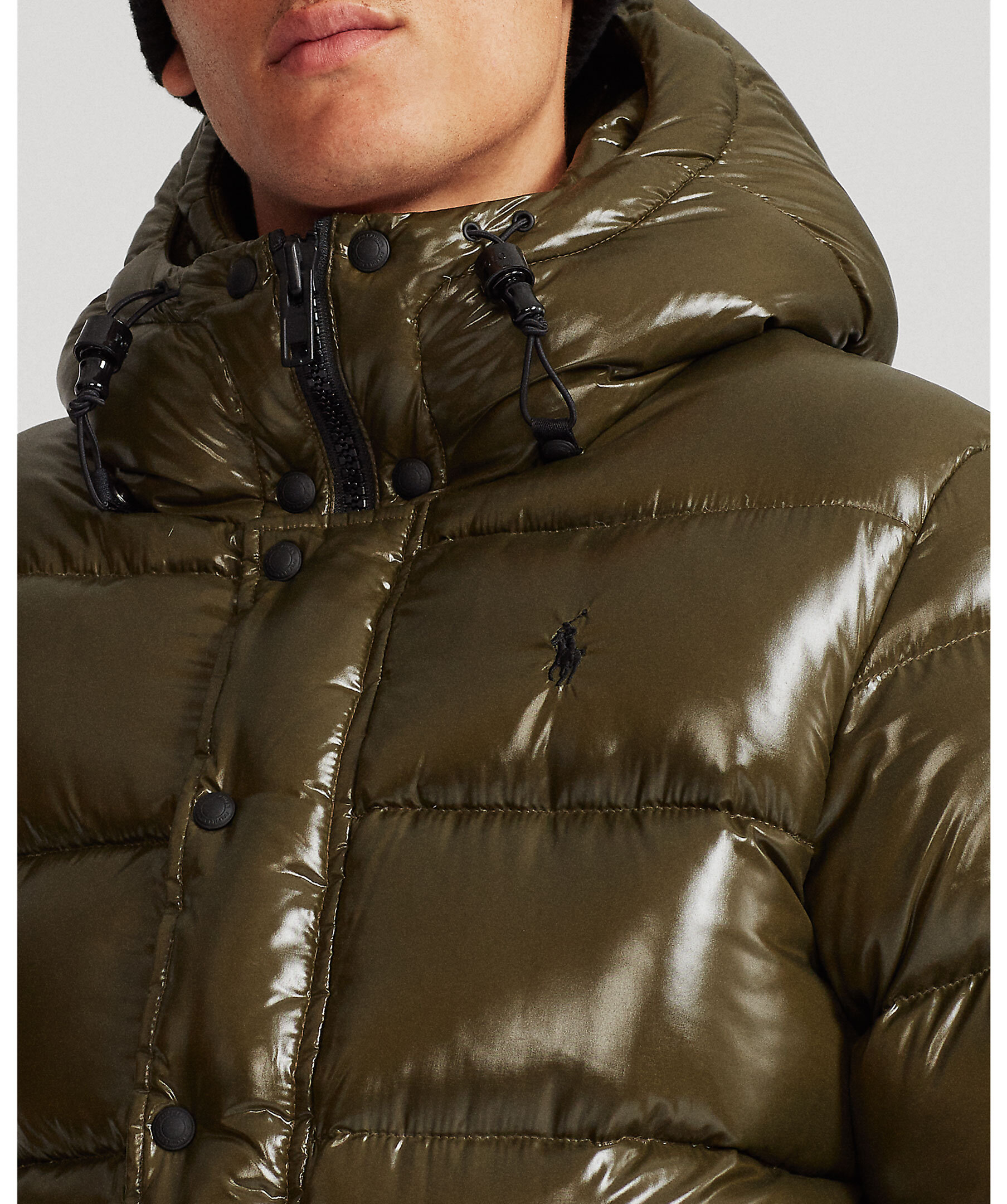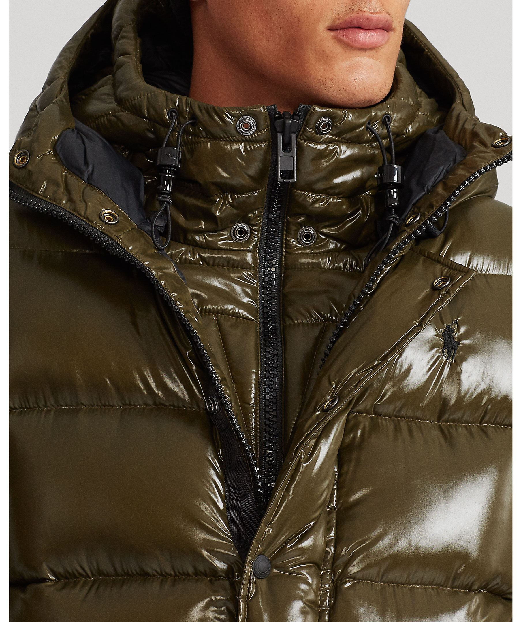 Mörkgrön, glansig dunjacka från Polo Ralph Lauren i kort modell. Yttermaterial i glansigt nylontyg. Stängs med tvåvägsdragkedja och tryckknappar samt har ett till framstycke under dragkedjan som också stängs med dragkedja som gör det ser ut som att man har dubbla jackor när man har öppnat första dragkedjan öppen. Har två framfickor med dragkedja, en innerficka med dragkedja samt luva med dragsko och hög krage. Grå logotyp på vänster sida av bröstet och smala muddar vid ärmslut och dragsko i plaggslut.