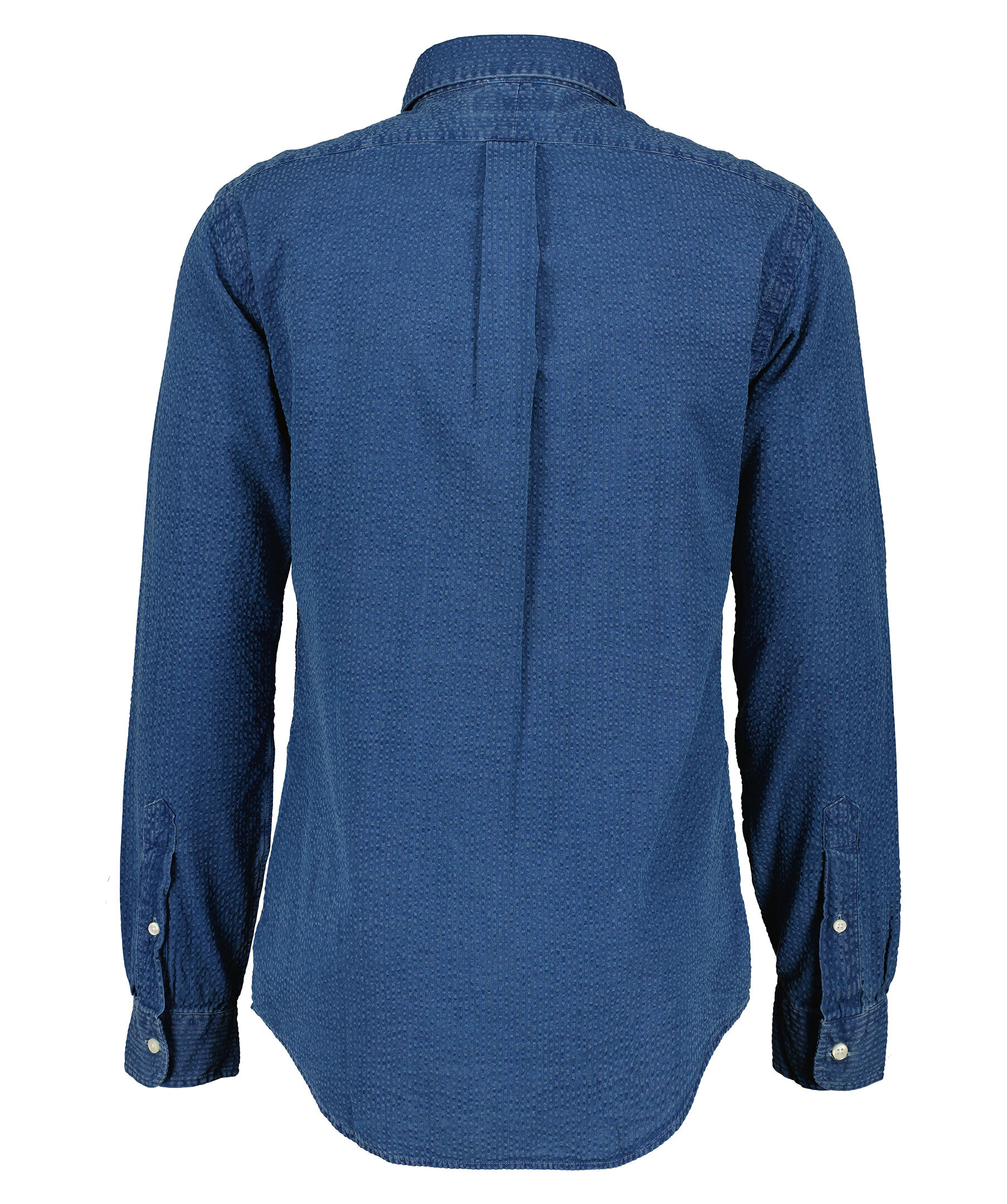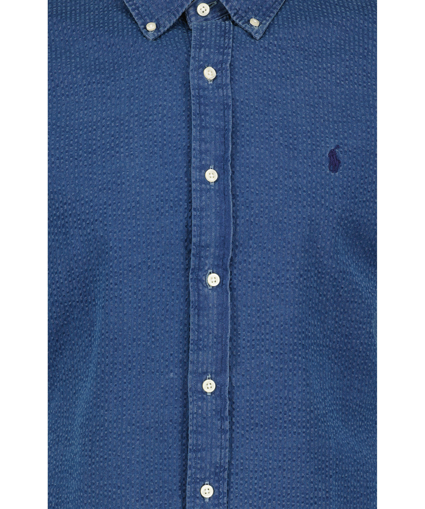 Blå skjorta i bomull-seersucker textur från Polo Ralph Lauren. Klassisk krage, långa ärmar med manschetter med knäppning, broderad signaturpony motiv på vänster bröst. Box-pleat. Böjd nederkant, button-down krage. Normal passform.