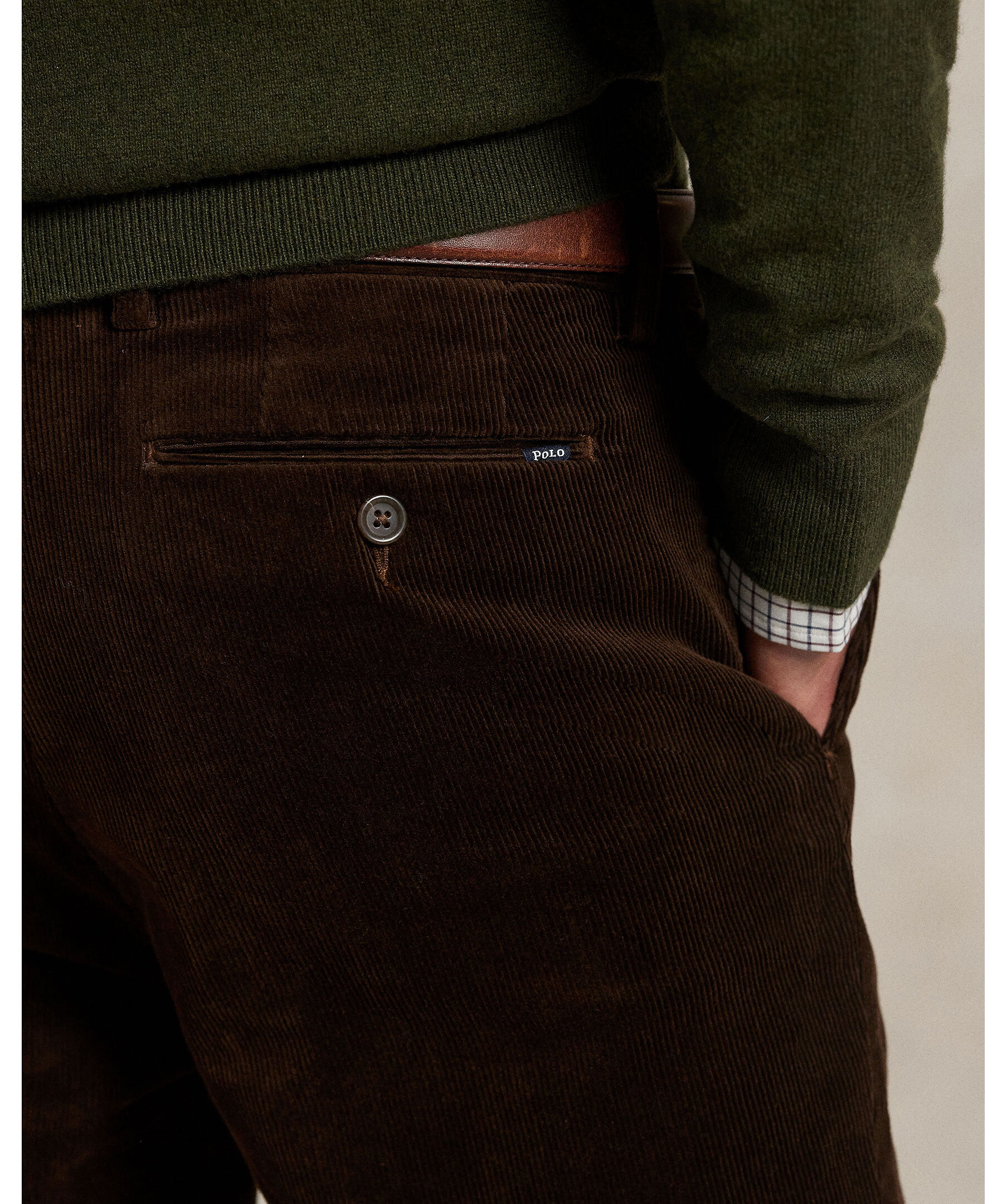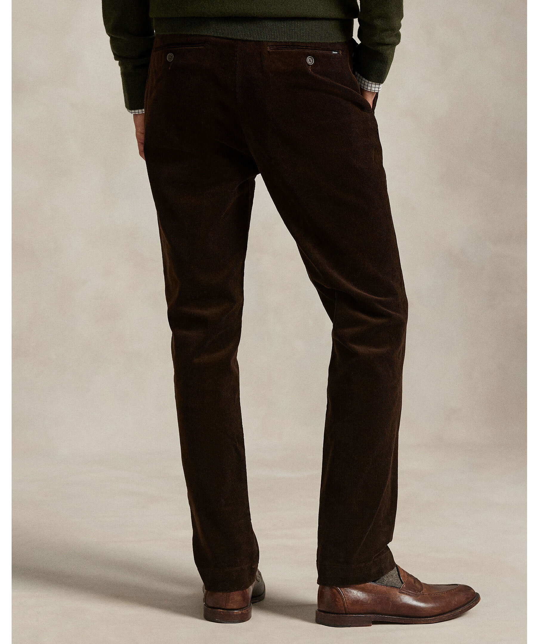 Mörkbruna, finspåriga manchester byxor från Polo Ralph Lauren. Byxorna har en smal passform och manchestertyget ger en lyxig känsla och en aning stretch för komfort. Designade med låg midja, smal passform genom benet, klassiska fickor och knappstängda bakfickor.
