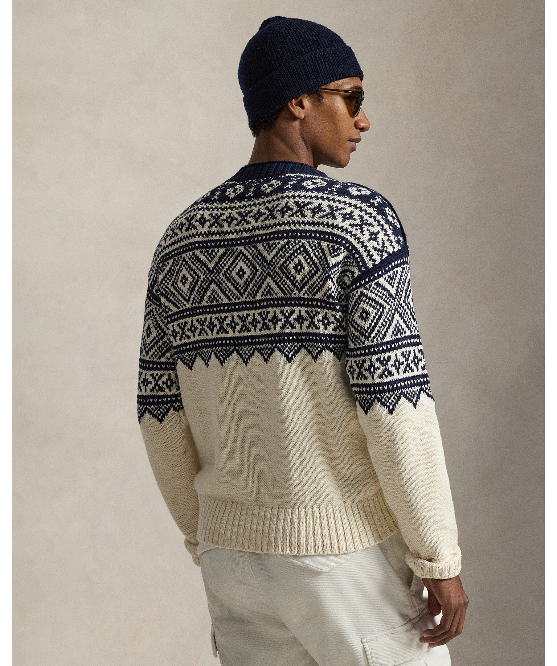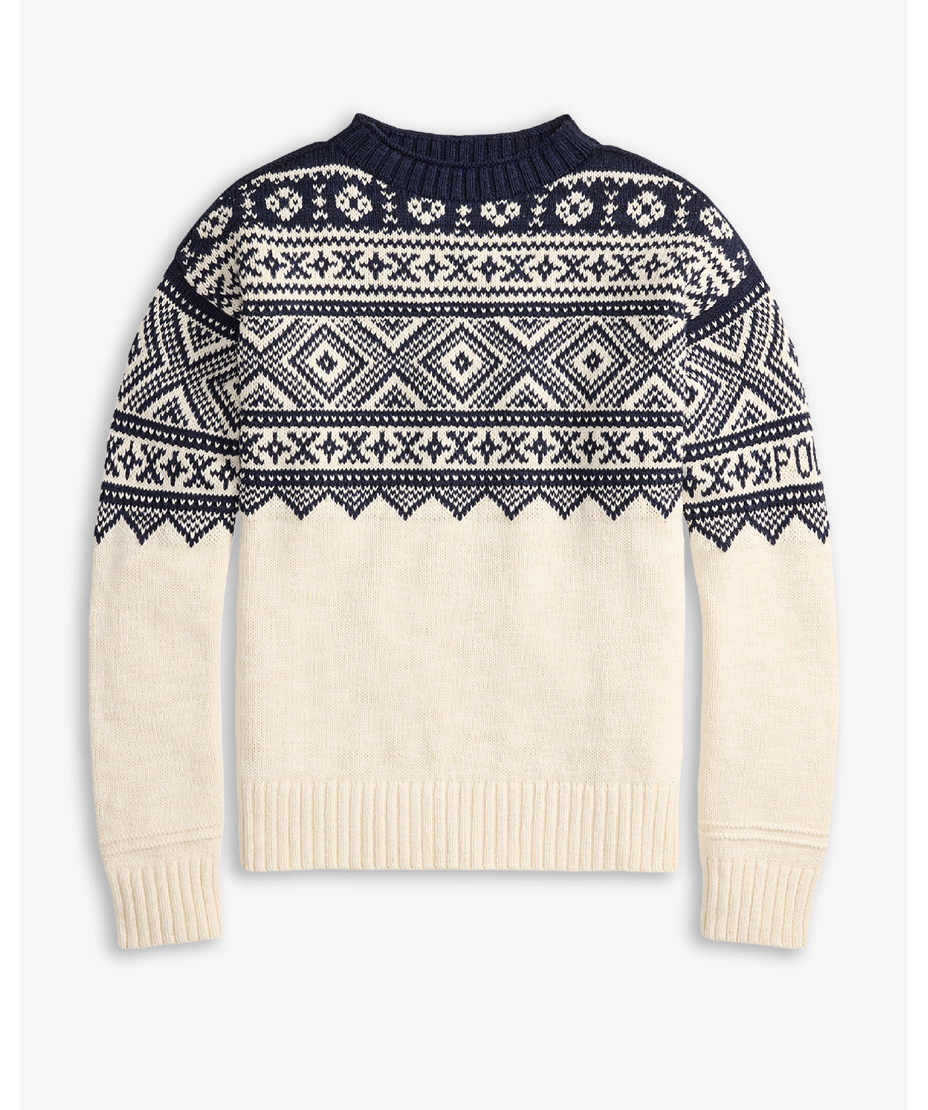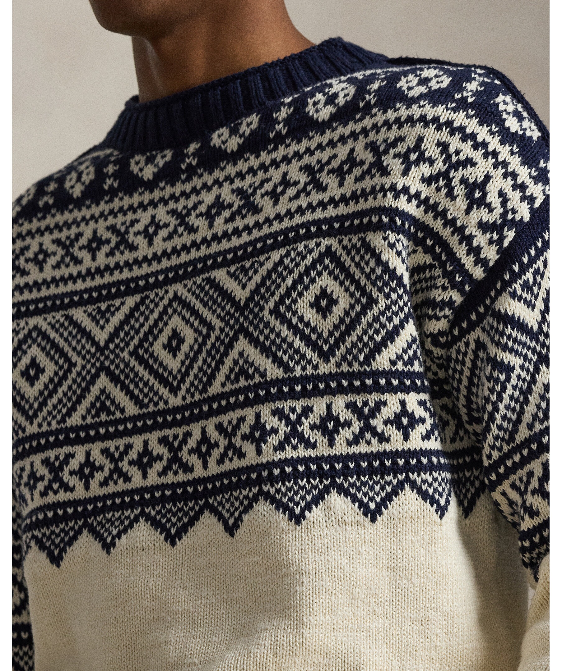 Mönstrad tröja från Polo Ralph Lauren i en lätt och mjuk blandning av bomull och kashmir för både komfort och andningsförmåga. Tröjan har ett geometriskt mönster inspirerat av nordiska sticktraditioner och en subtil Polo‑logga på ärmen, vilket ger en tidlös, preppy look som passar perfekt till jeans eller chinos