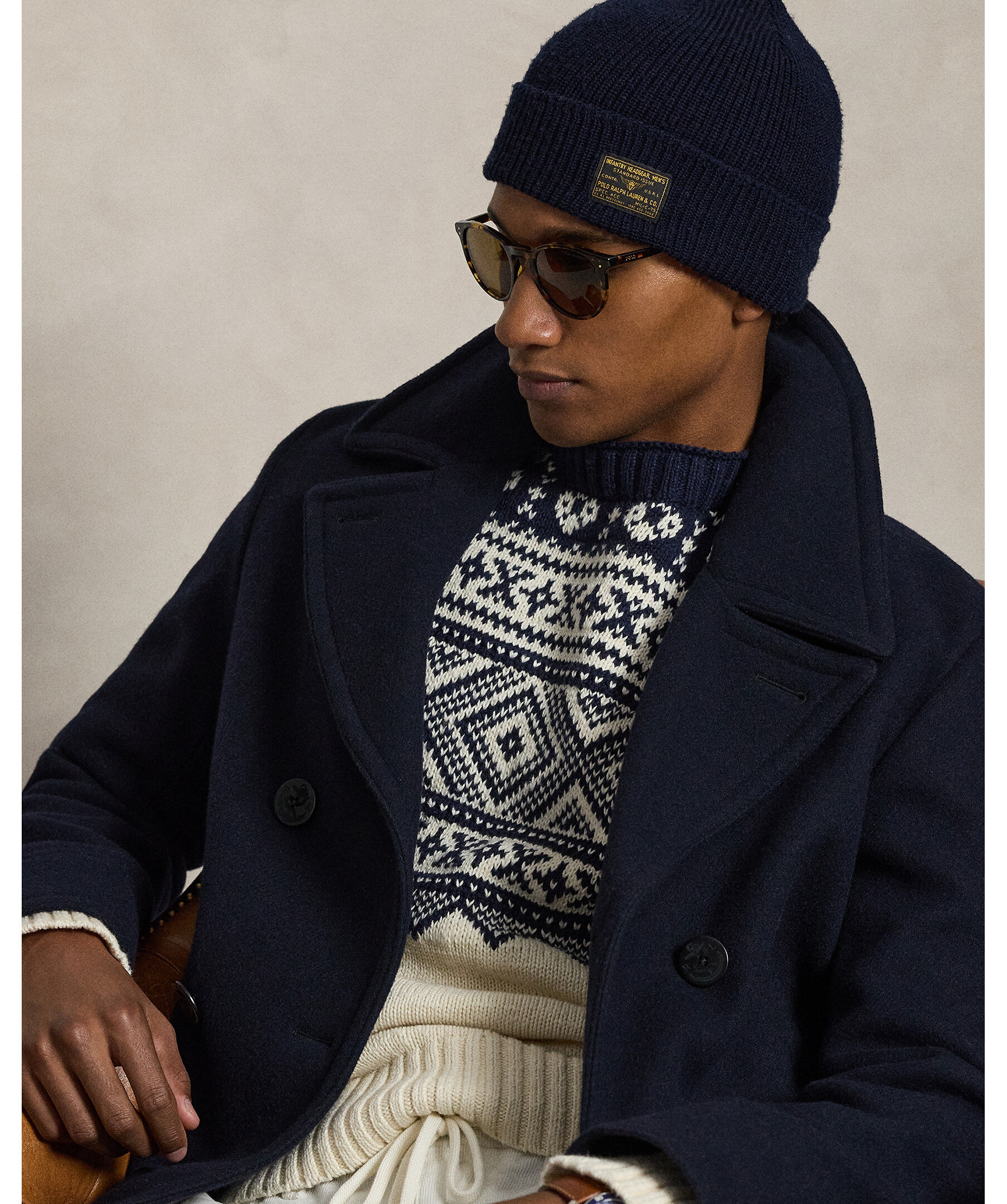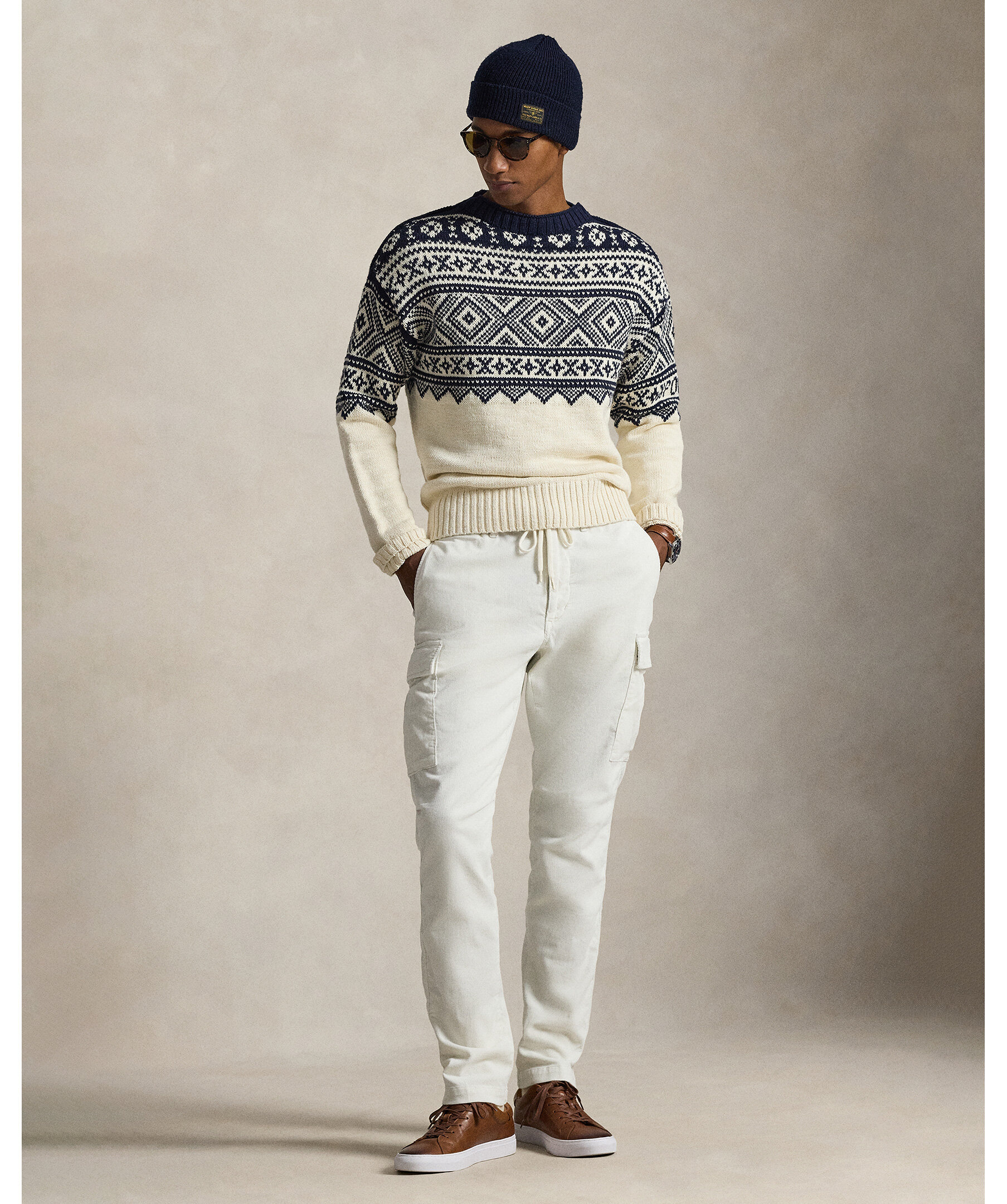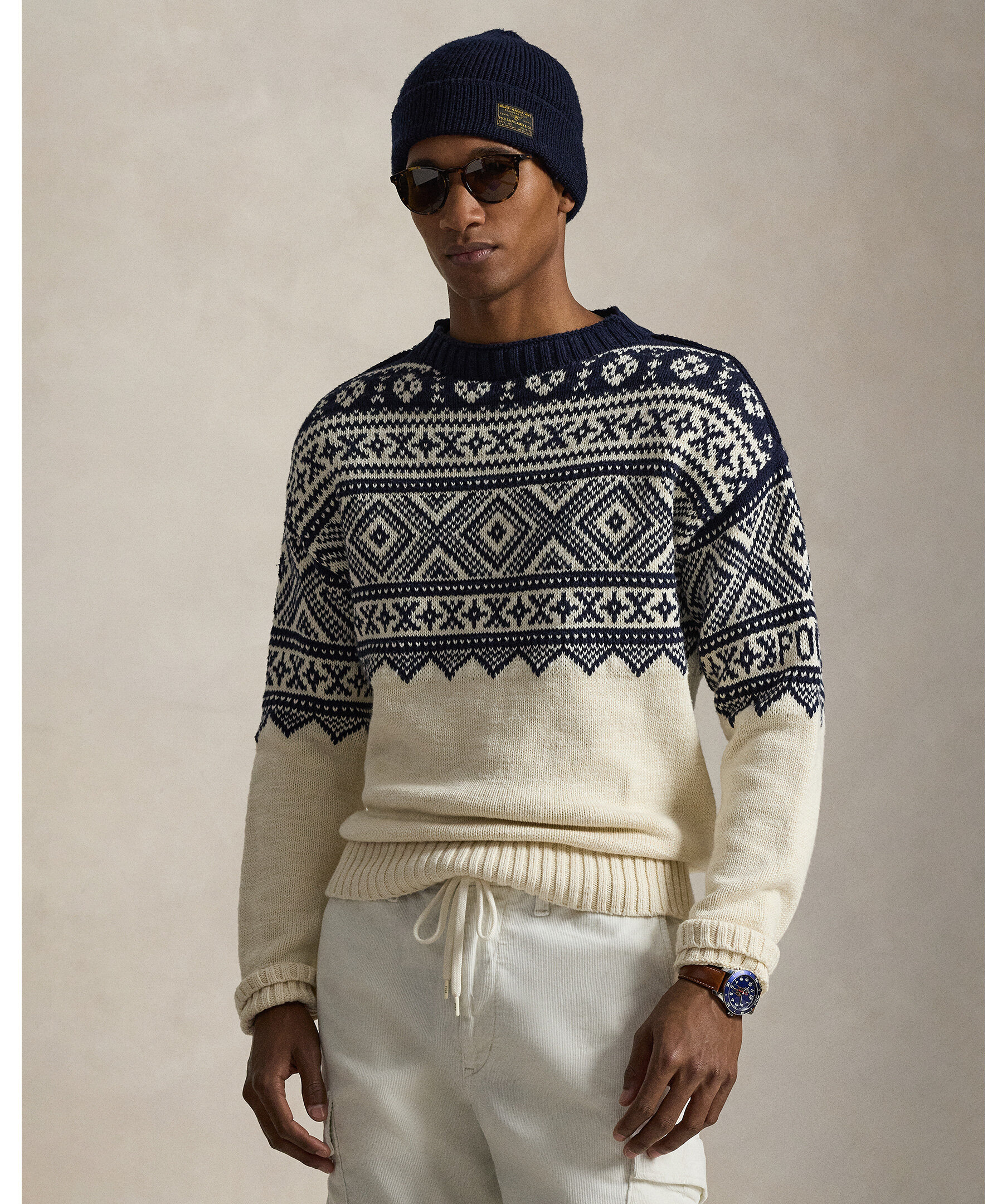 Mönstrad tröja från Polo Ralph Lauren i en lätt och mjuk blandning av bomull och kashmir för både komfort och andningsförmåga. Tröjan har ett geometriskt mönster inspirerat av nordiska sticktraditioner och en subtil Polo‑logga på ärmen, vilket ger en tidlös, preppy look som passar perfekt till jeans eller chinos