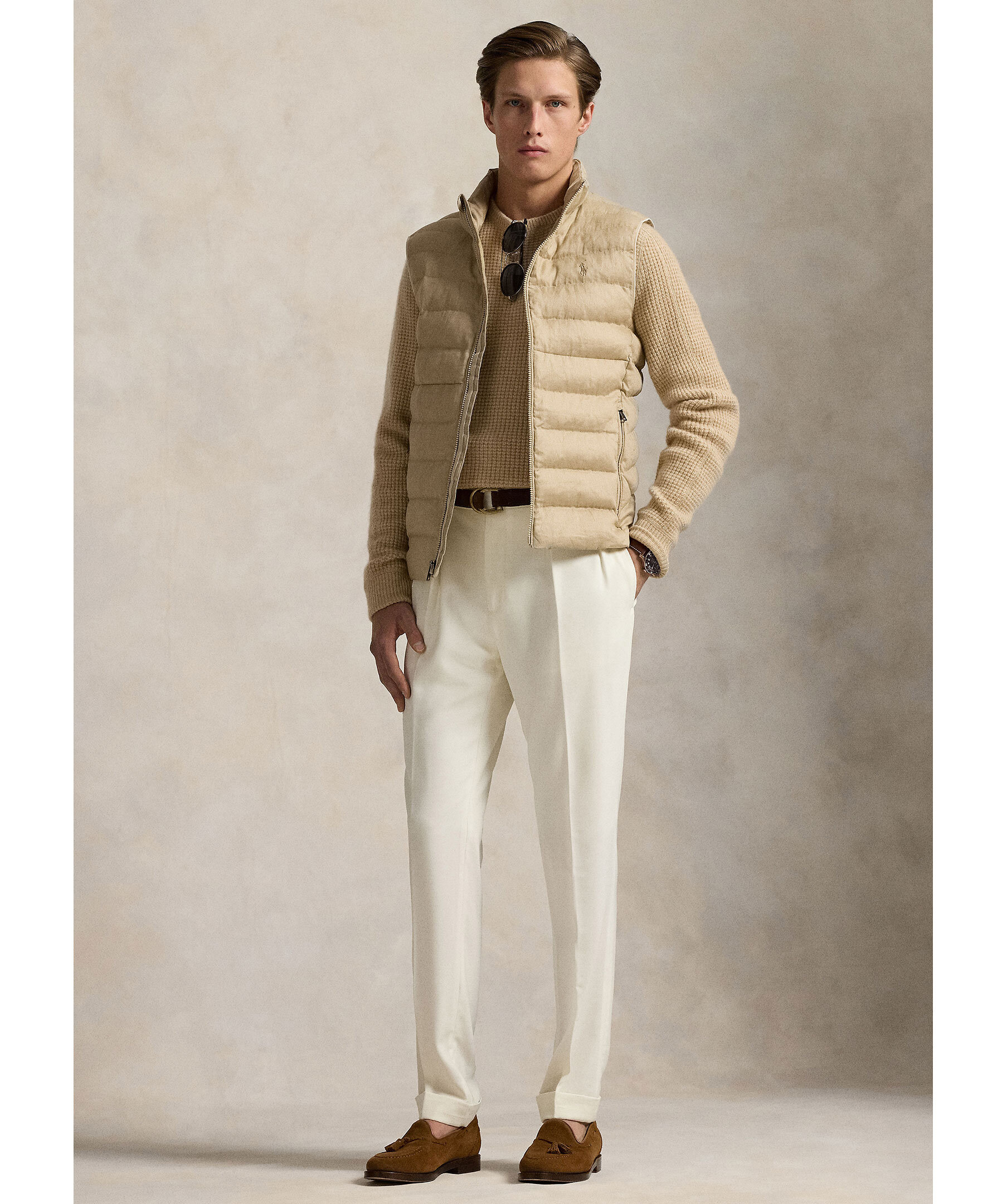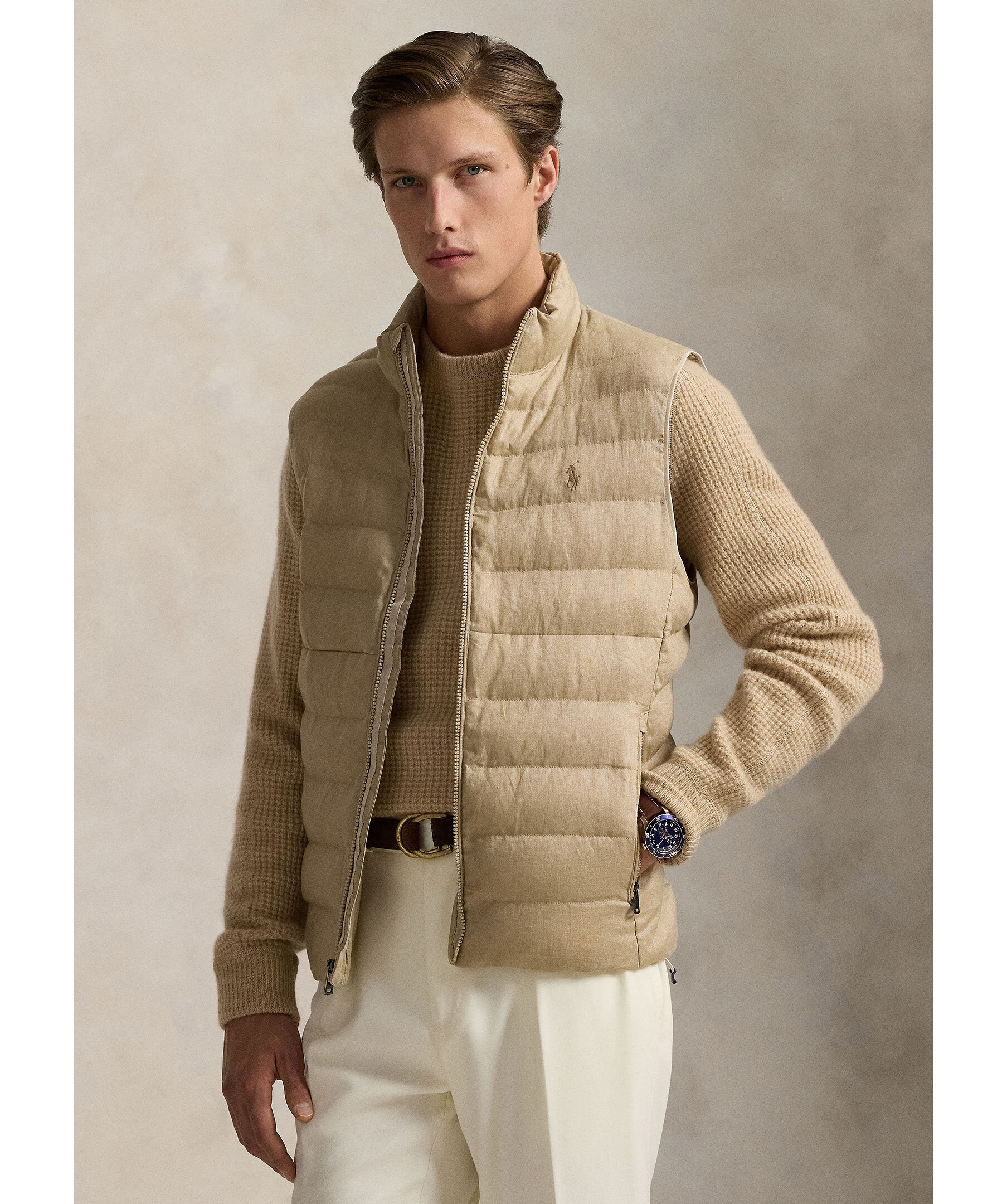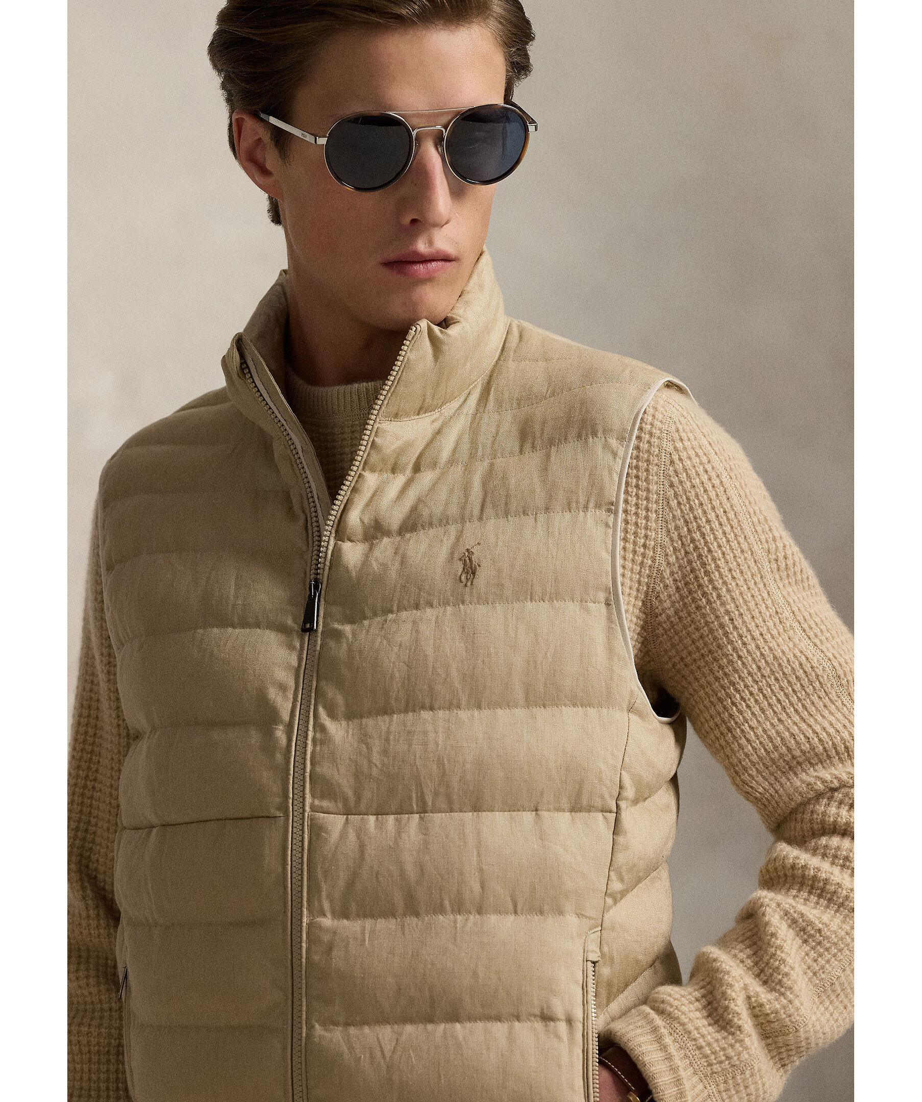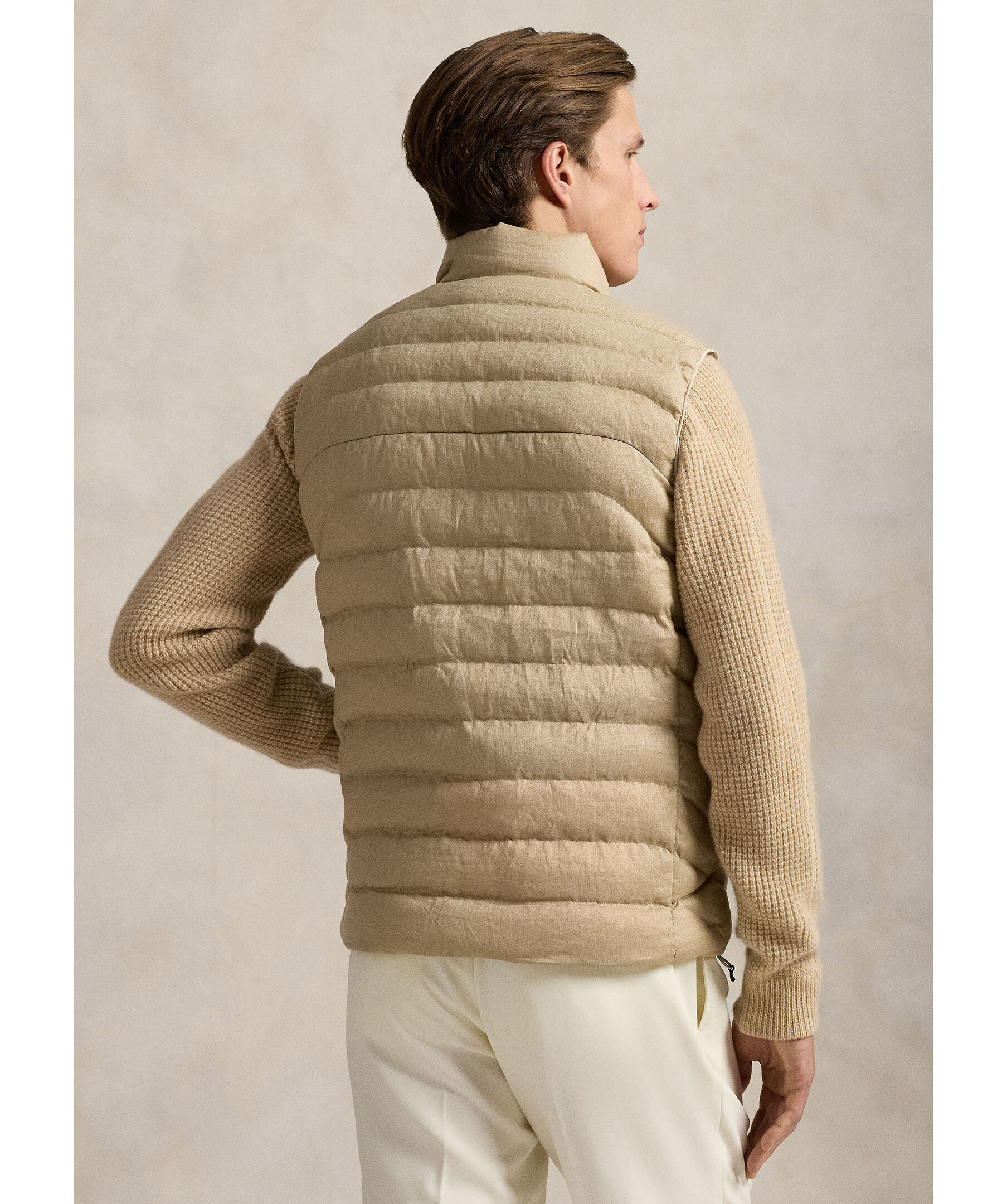 Beige linneväst från Polo Ralph Lauren. Västen stängs med dragkedja och har två sidfickor med dragkedja samt broderad logotyp på bröstet. Den har ståkrage och quiltad design. Tillverkad i linne med polyesterfyllning.