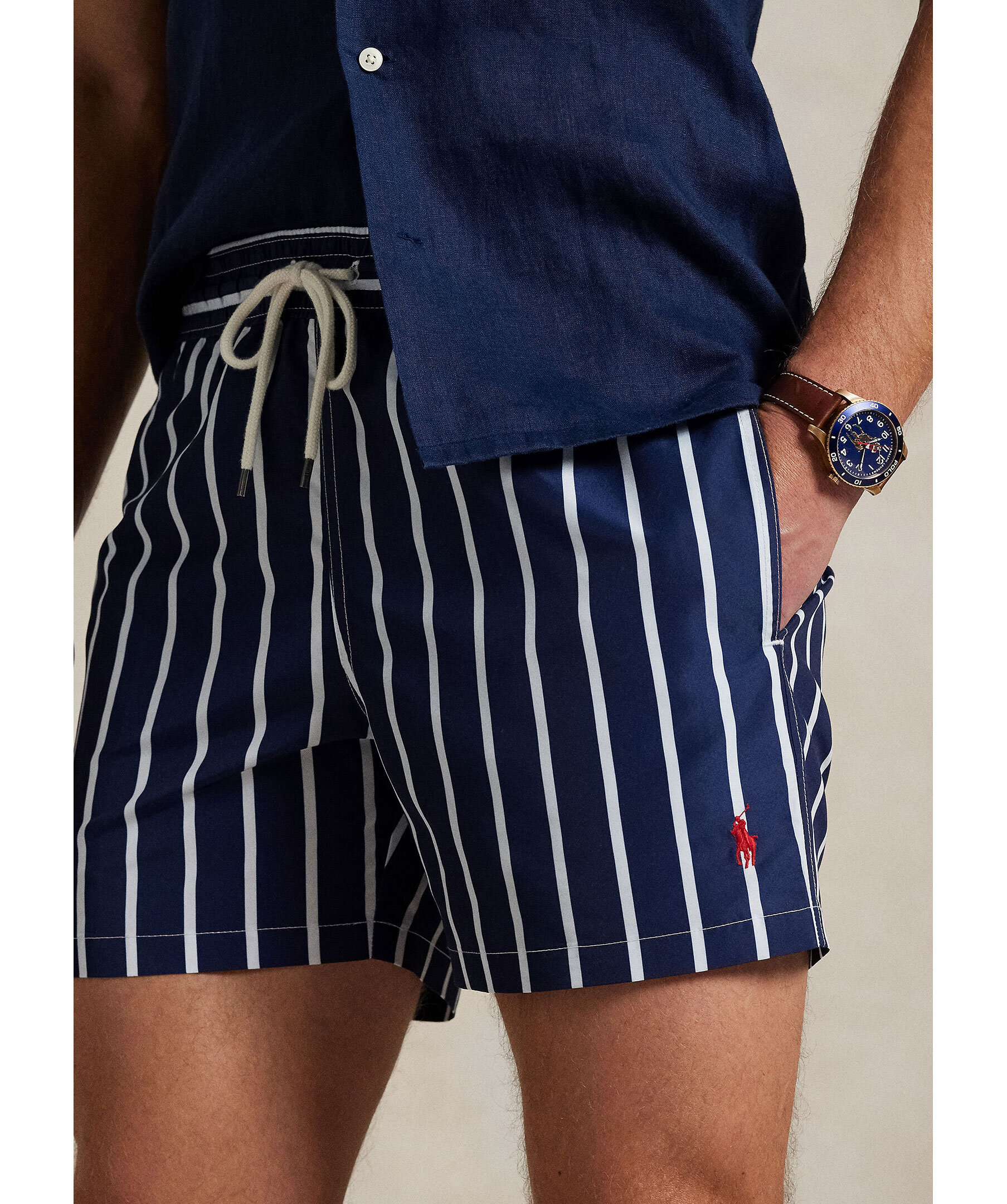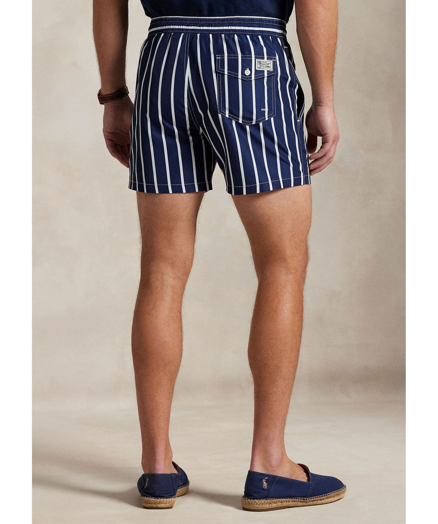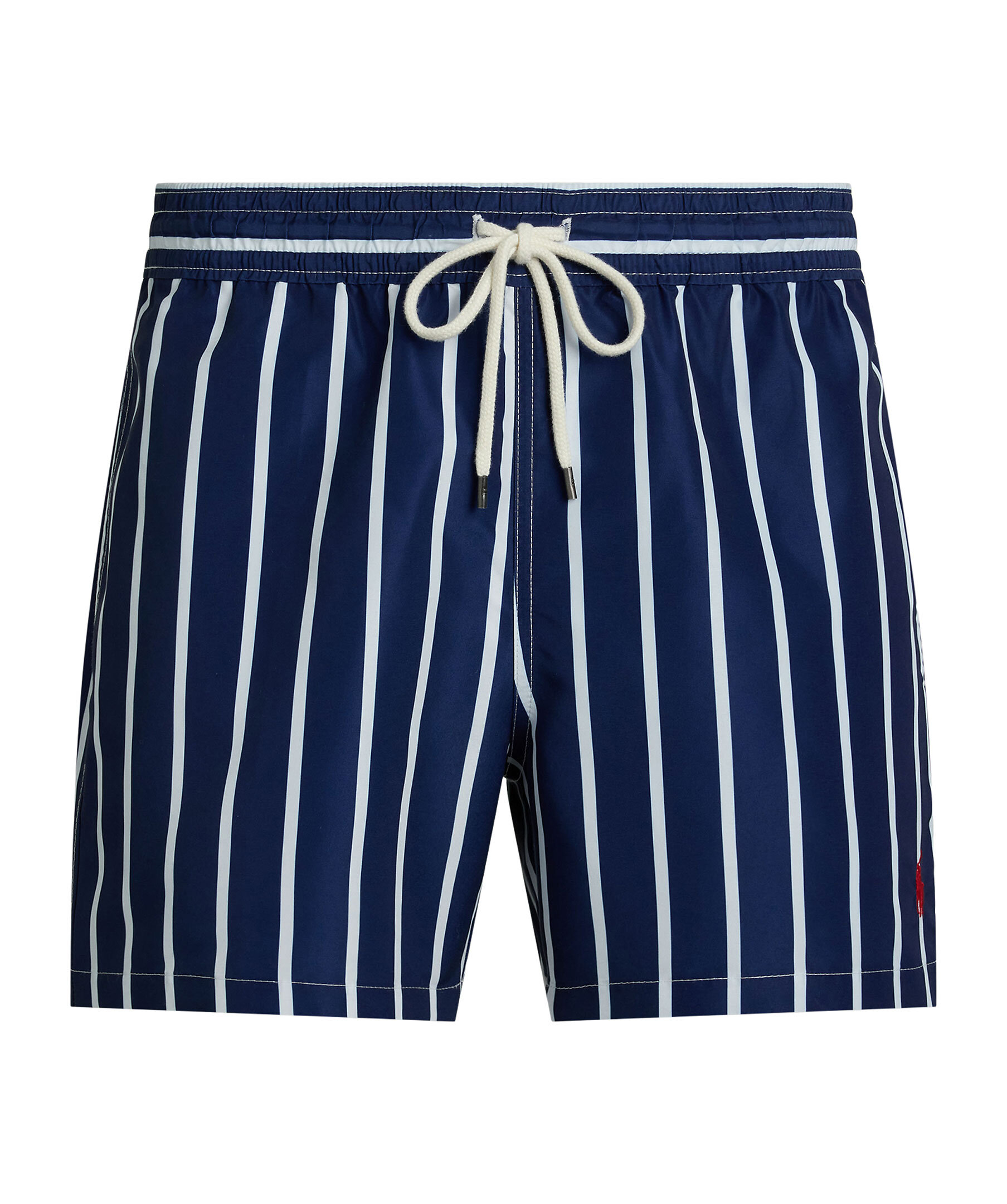 Blå badshorts från Polo Ralph Lauren. Badshortsen har vita ränder, elastiskt midjeband med dragsko. Sidofickor och en bakficka med lock och knapp. Tillverkad av polyester.