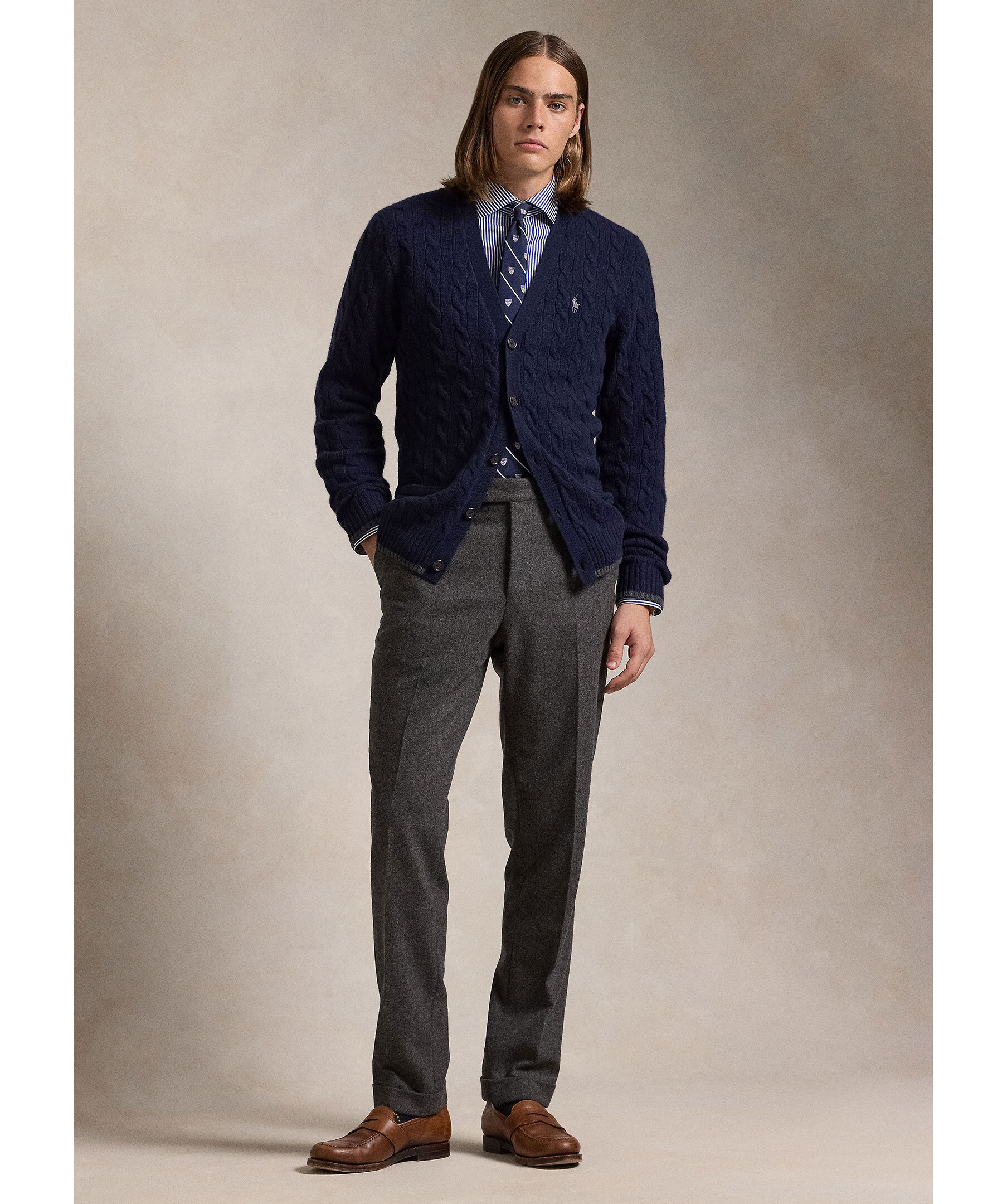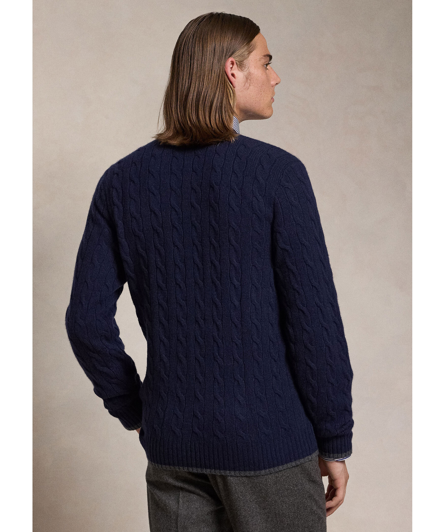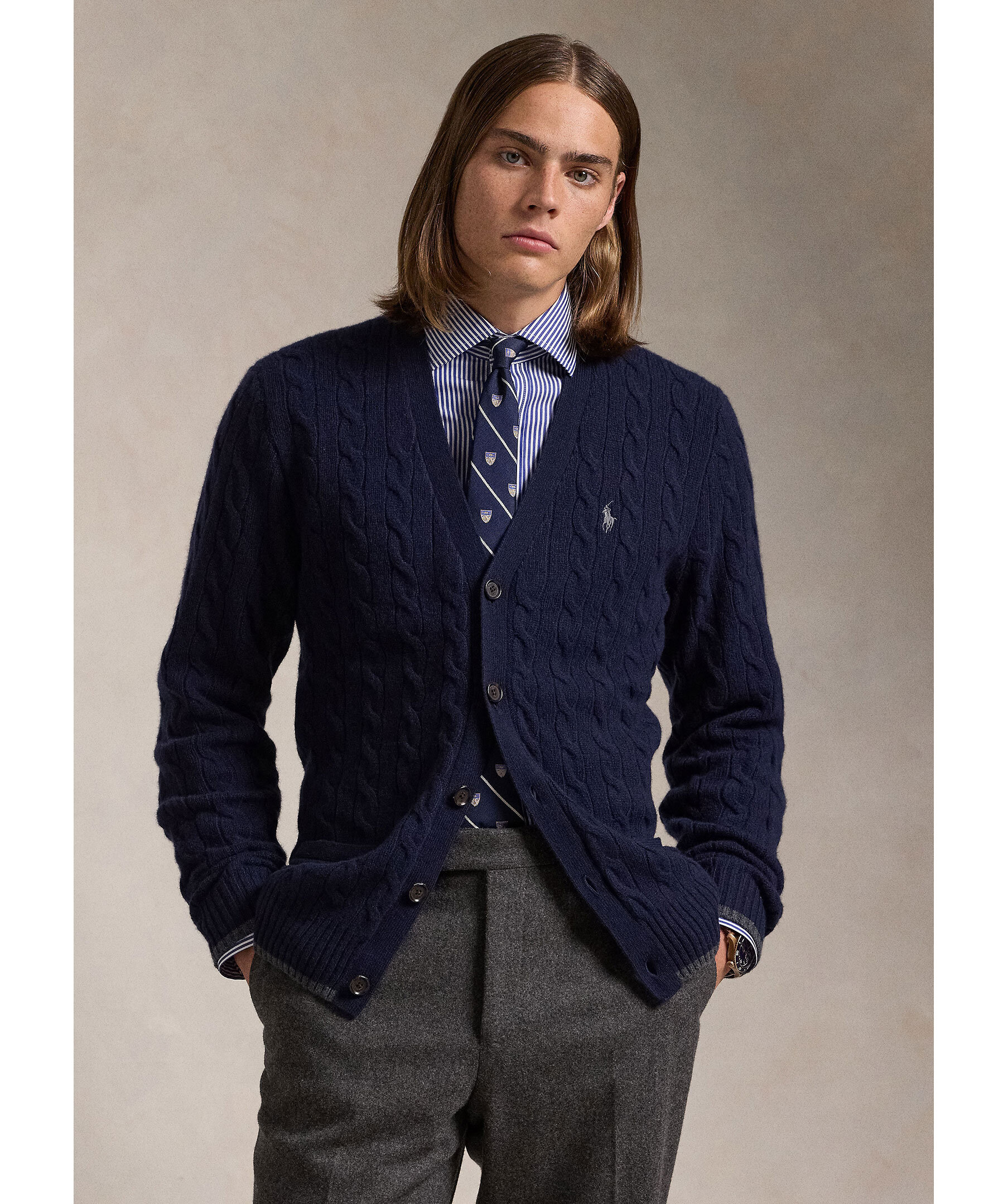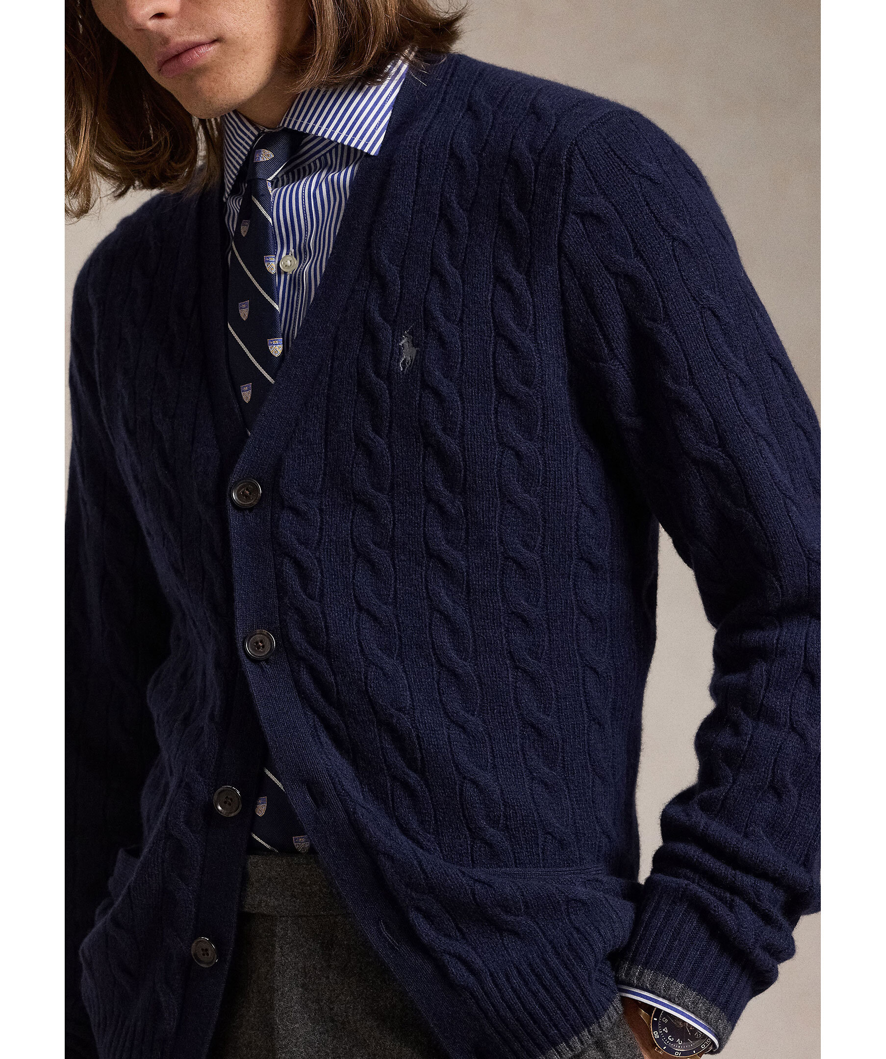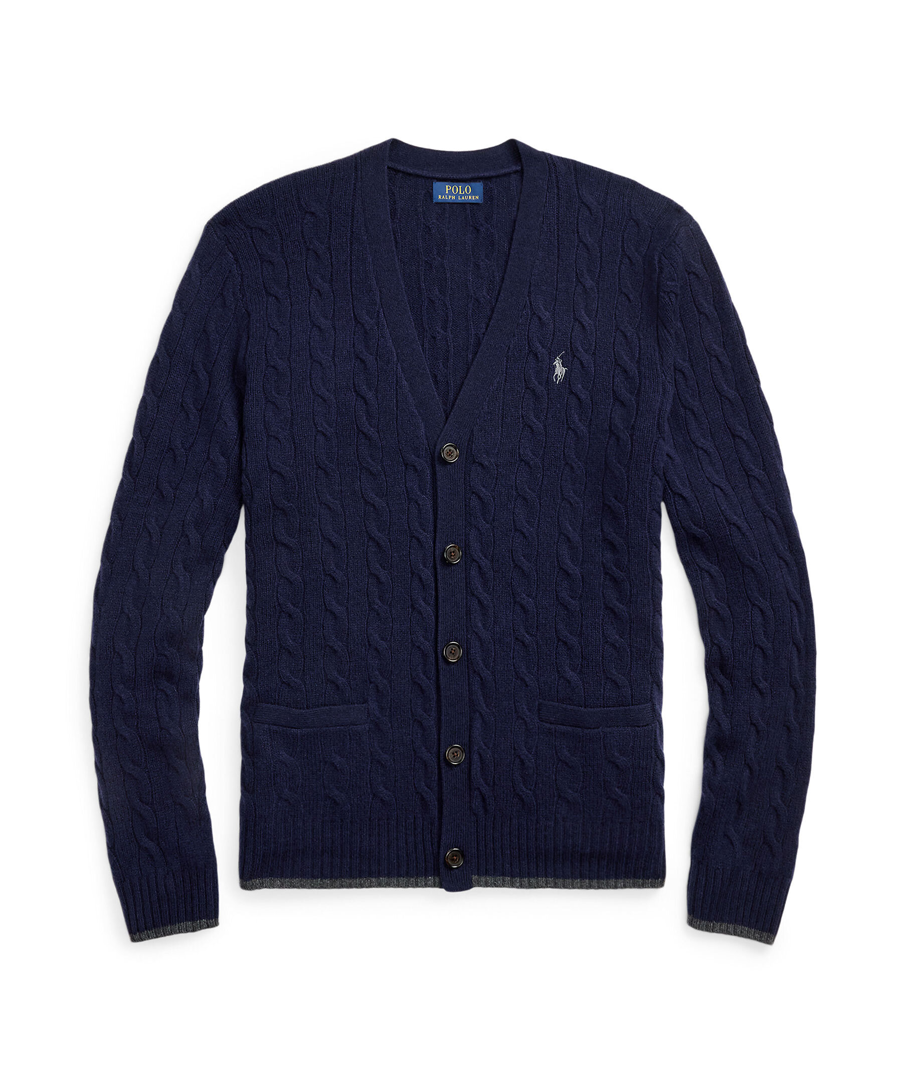 Marinblå, kabelstickad ullkofta från Polo Ralph Lauren. Koftan stängs med knappar framtill och har en v-ringad hals samt två öppna fickor. Ribbstickade detaljer och en broderad logotyp på bröstet. Tillverkad i en ull- och kashmirblandning.