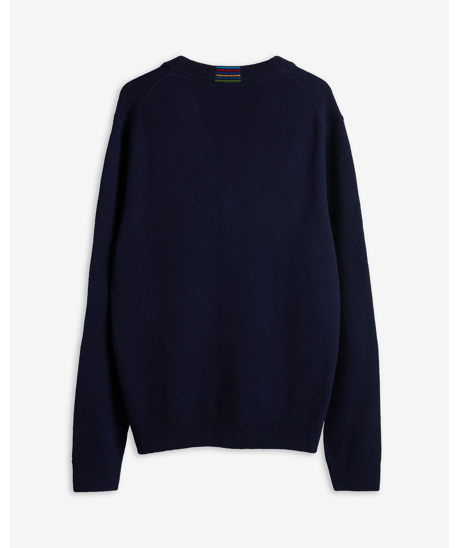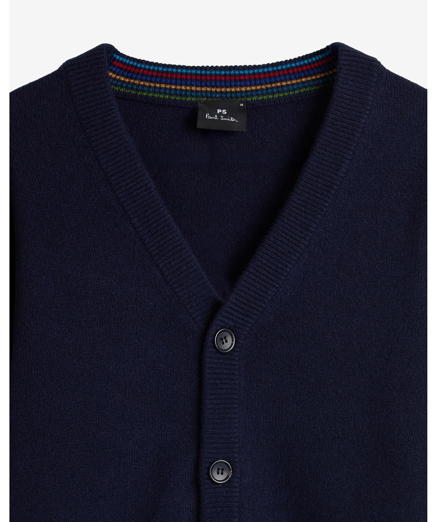 Marinblå, stickad cardigan från PS Paul Smith. Koftan stängs med knappar och har en klassisk V-ringad design samt flerfärgade ränder baktill i nacken. Tillverkad i 100 % merinoull.
