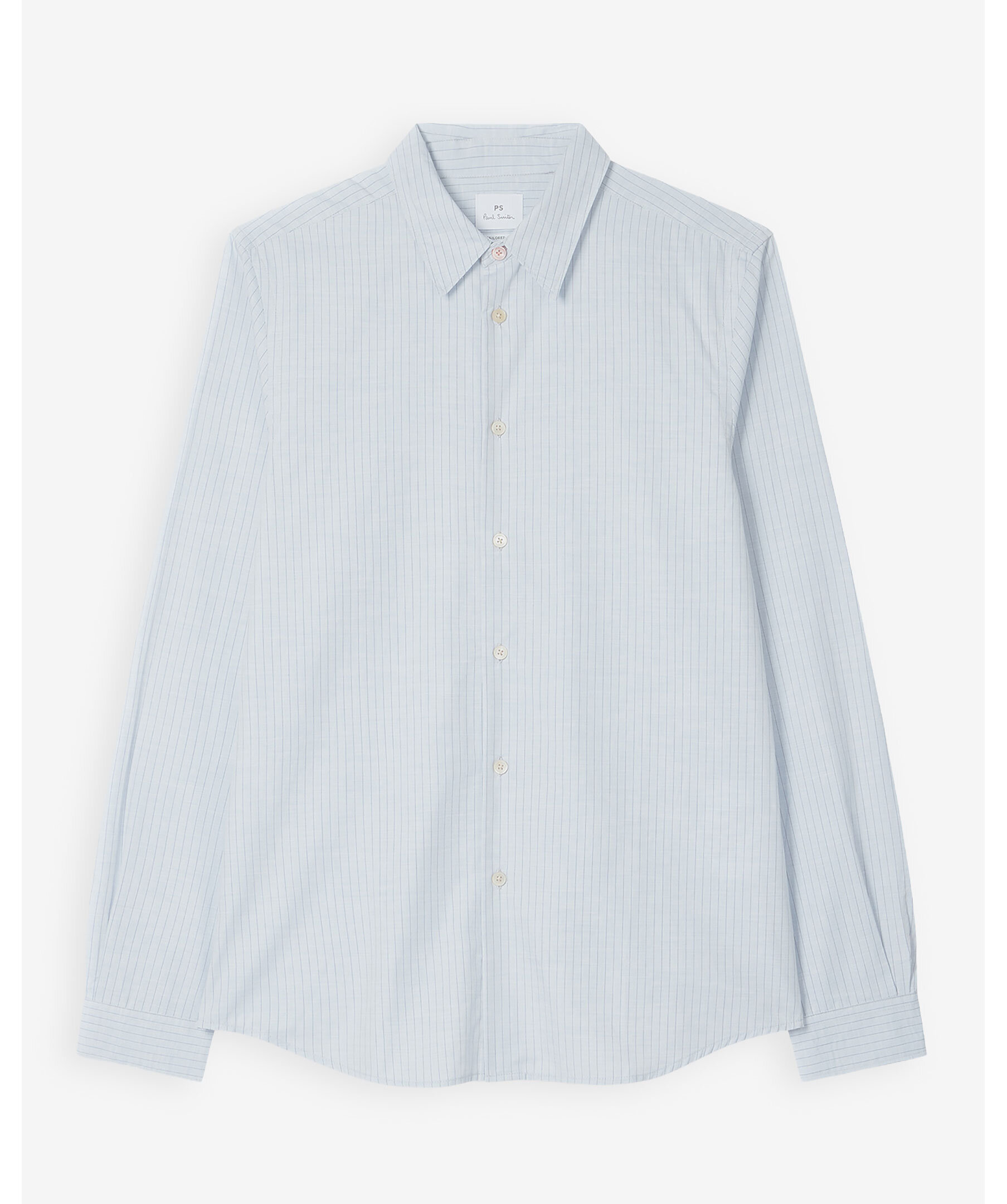 Ljusblå randig skjorta från PS Paul Smith. Skjortan har en skräddarsydd passform som ger en smalare silhuett i midjan. Tillverkad i en mjuk bomullstyg. Skjortan har klassisk krage och knäppningsslå framtill, med en ton‑i‑ton-estetik som känns både tidlös och modern.