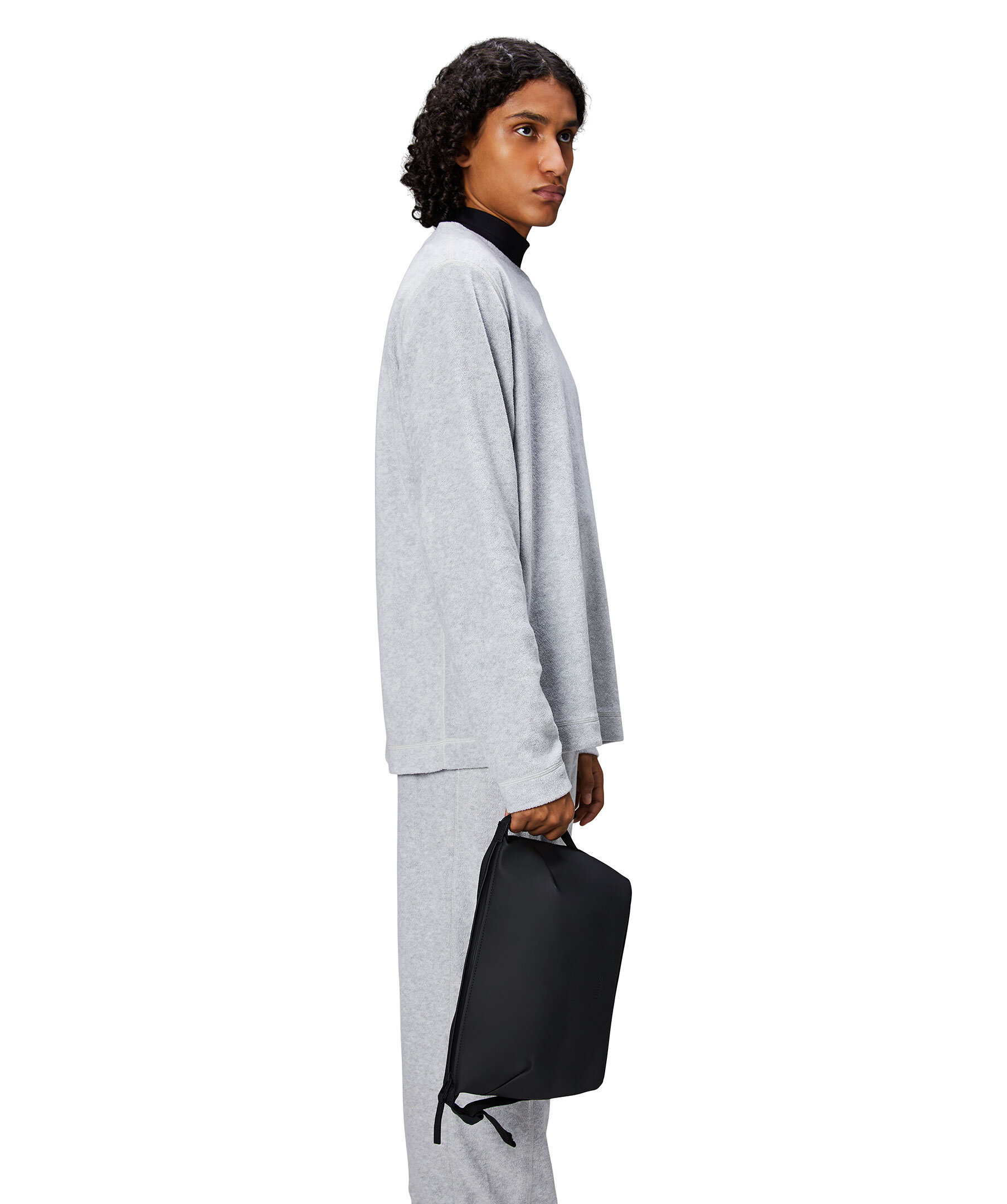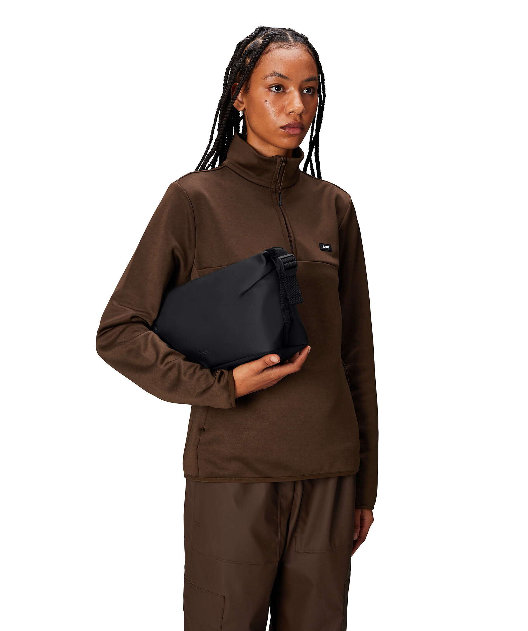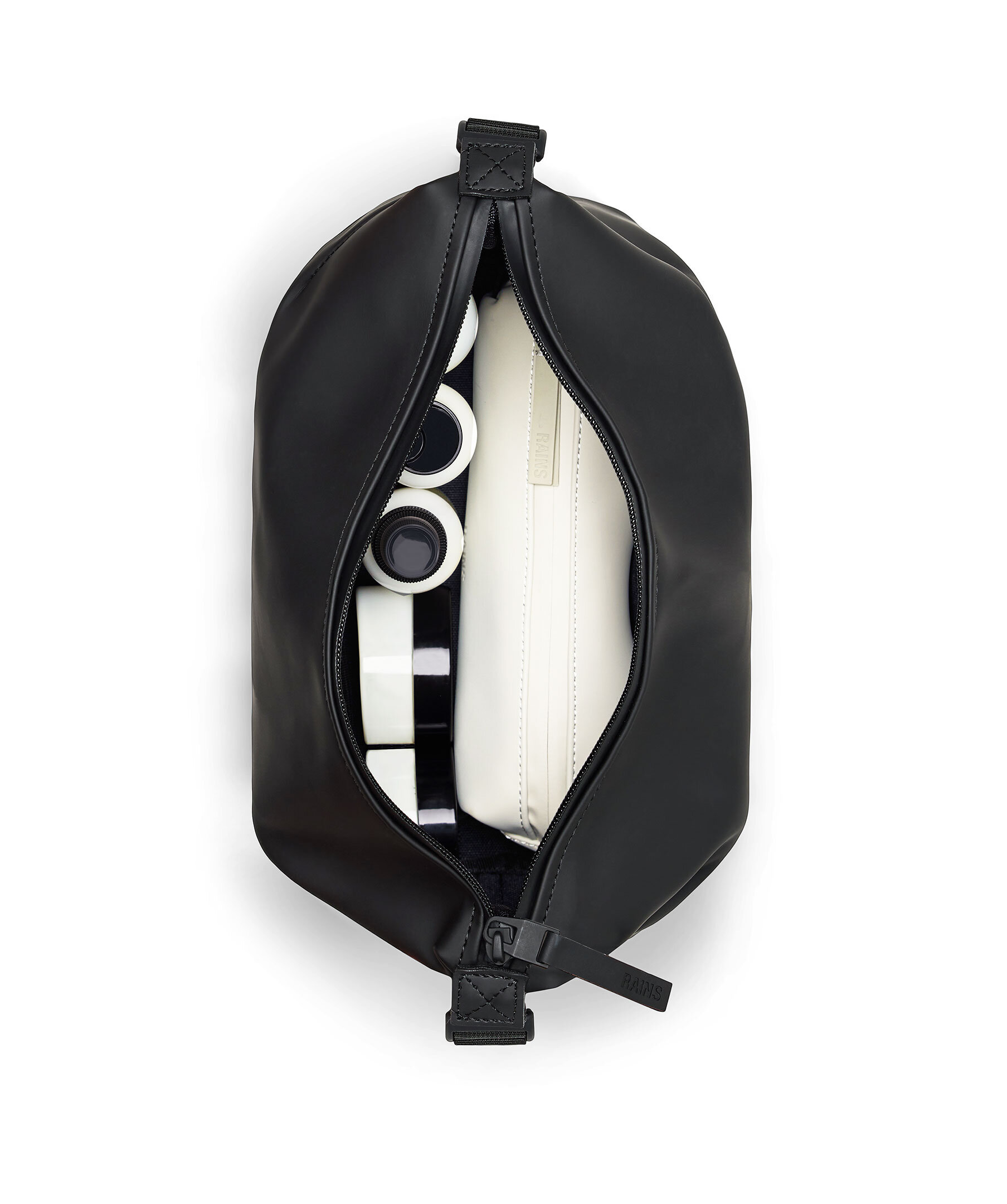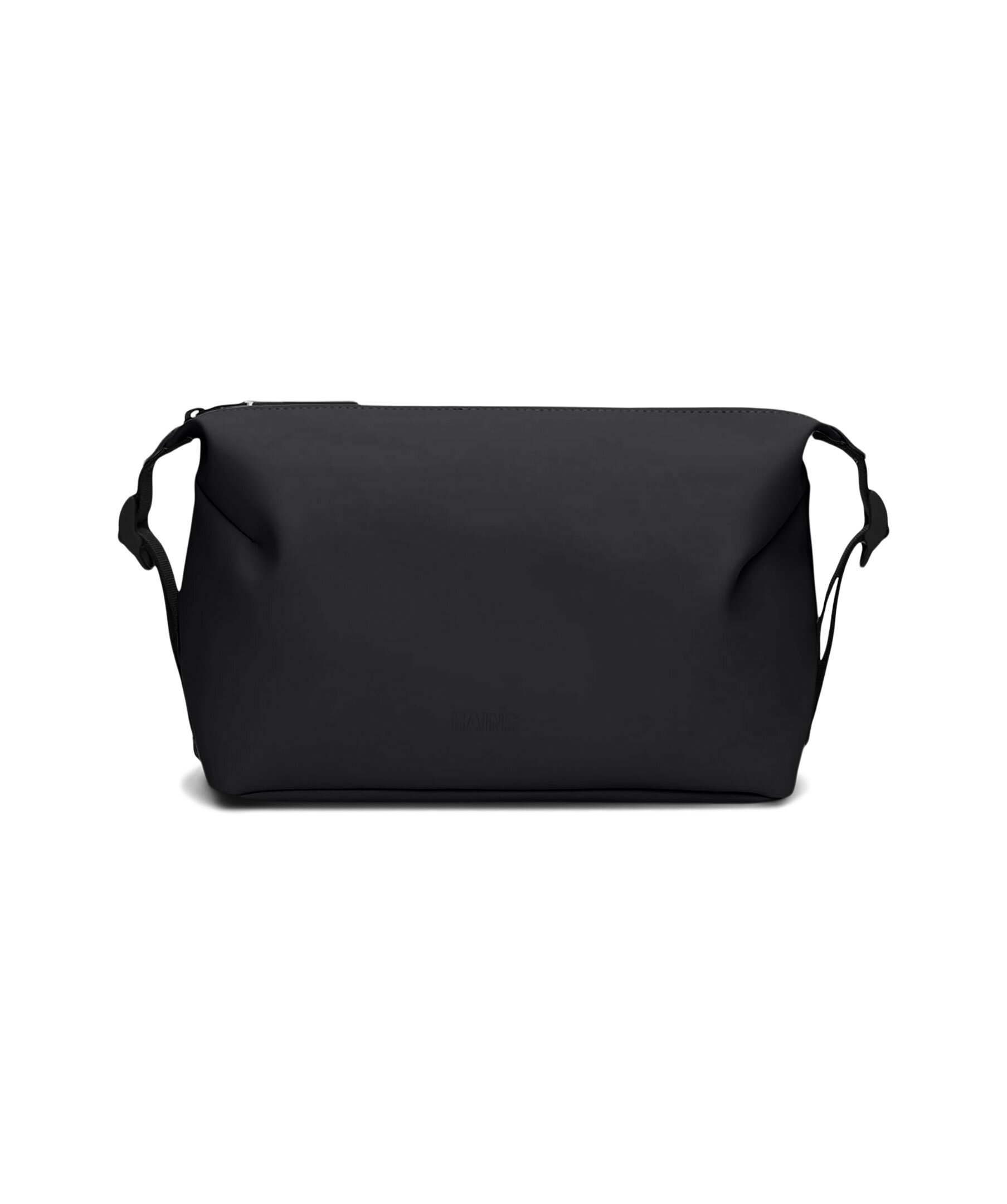 Svart necessär från Rains. Necessären kännetecknas av sin minimala siluett accentuerad av de justerbara, sidomonterade spännen. Stängs med dragkedja och har tonal logotyp. Rymmer 4L. Tillverkad av Rains signatur vattentäta PU-tyg.