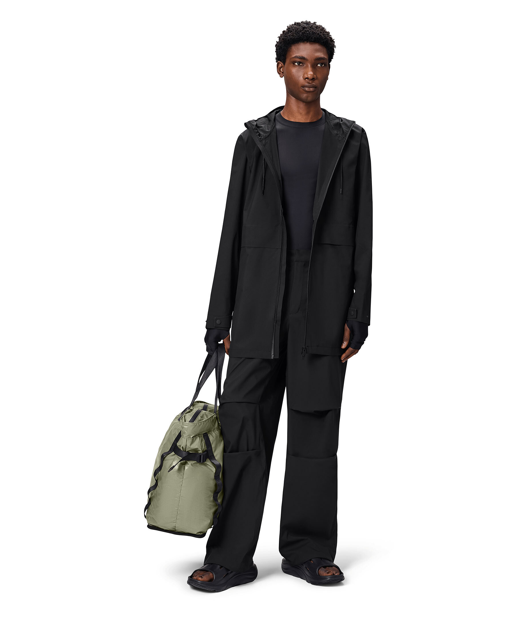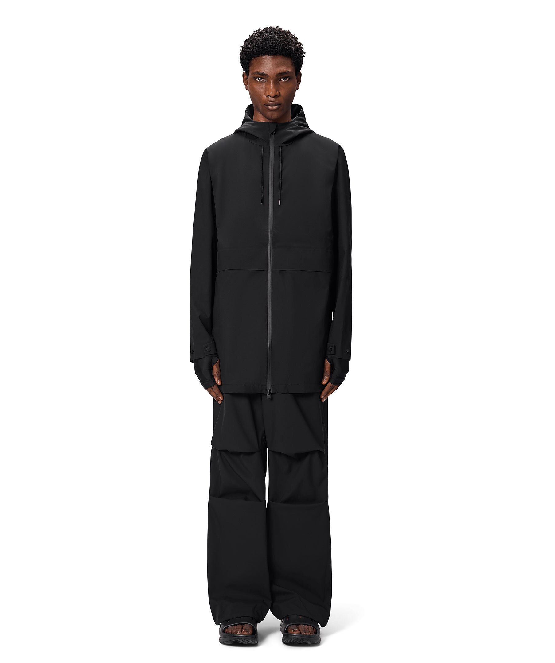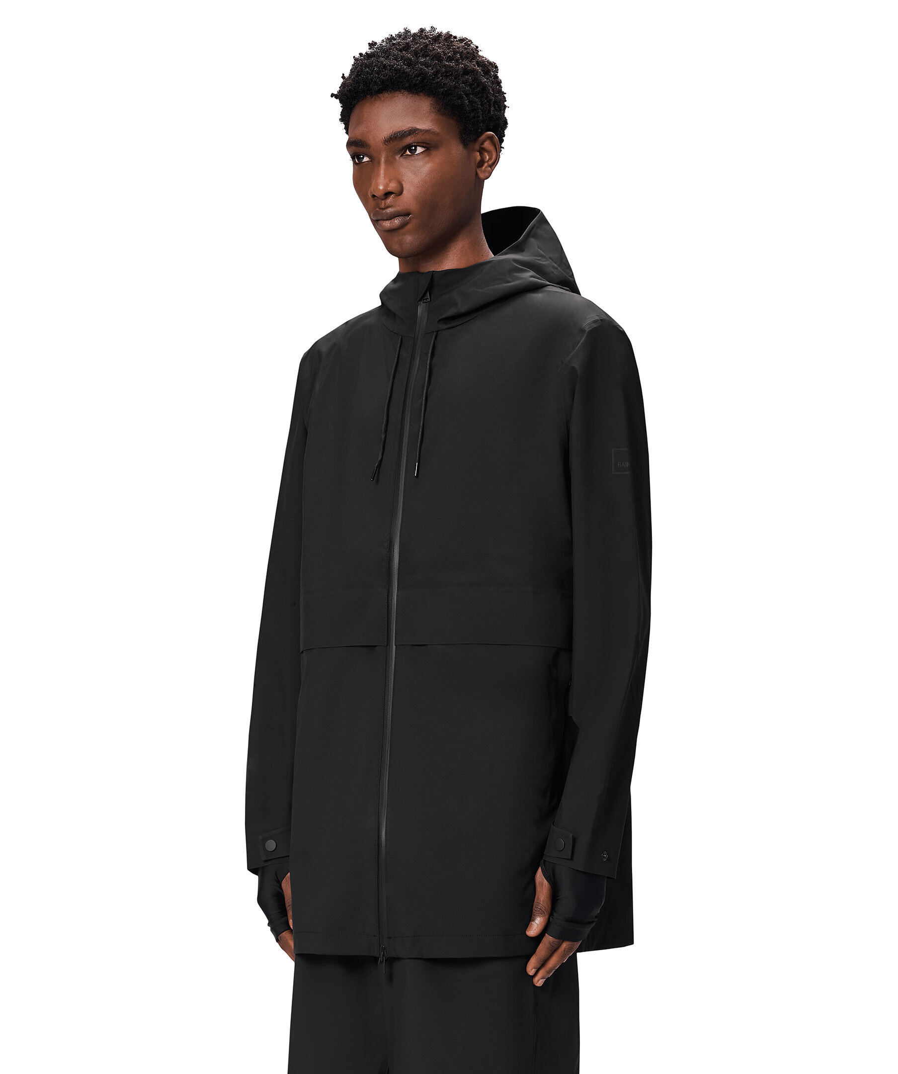 Svart lång jacka från Rains. Jackan är vattentät och har en lång passform. Vattentät dragkedja med beläggning och en huva med dragsko, sömmarna är tejpade. Jackan har framfickor med dragkedja och synlig tryckknapp. Ärmslutet har lockstägning. Tillverkad av polyester.