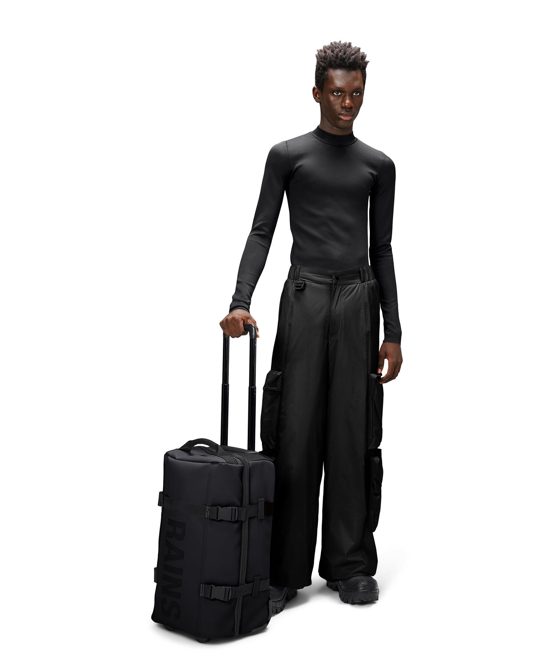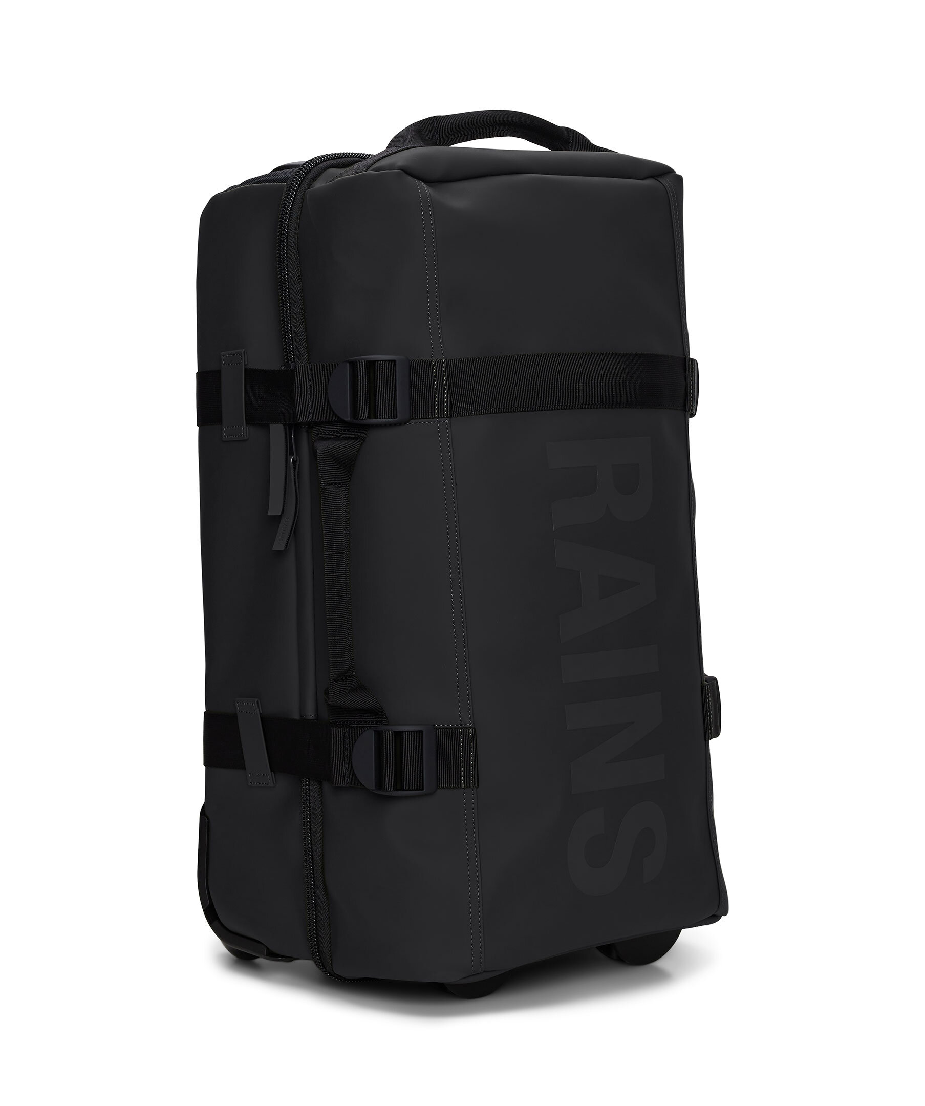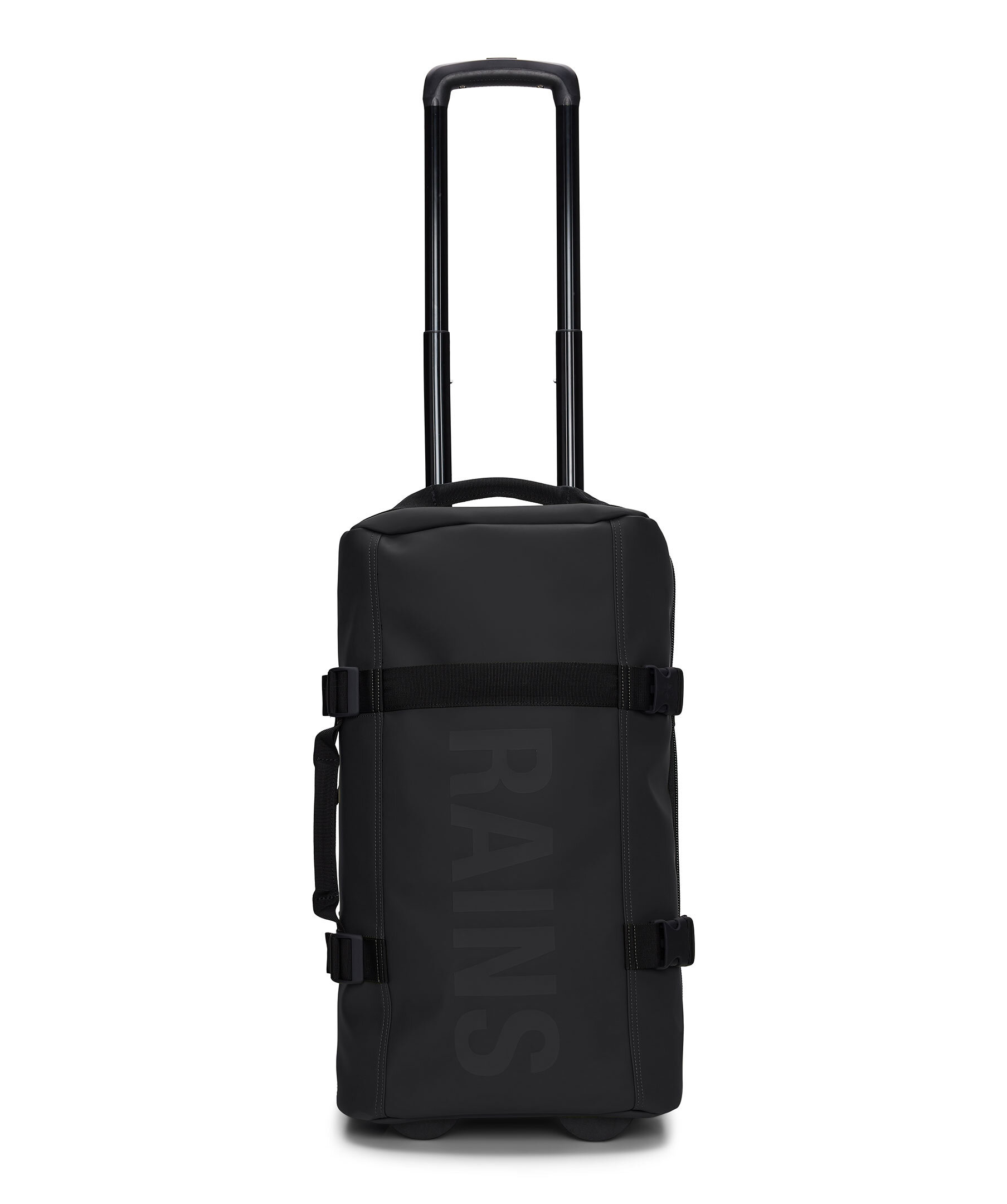 Svart vikbar rullväska i vattentätt material från Rains. Teleskophandtag. Ett Bärhandtag på väskans kortsida och ett på långsidan. Stor logotyp tryck på väskans framsida. Väskan stängs med dragkedja och och remmar med spännen. Två meshhuvudfack, varav ett med elastiska korsband. Väskan har en blixtlåsficka fram för lätt åtkomst till pass, nycklar m.m. Väskans mått: H 23 x B 40 x D 20 cm.