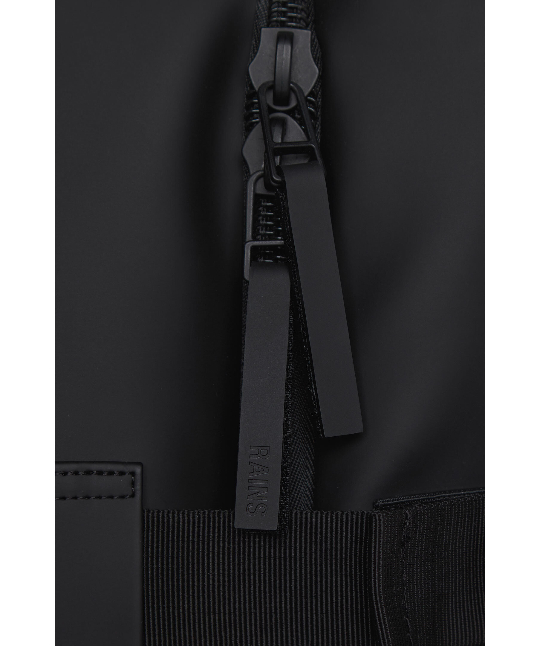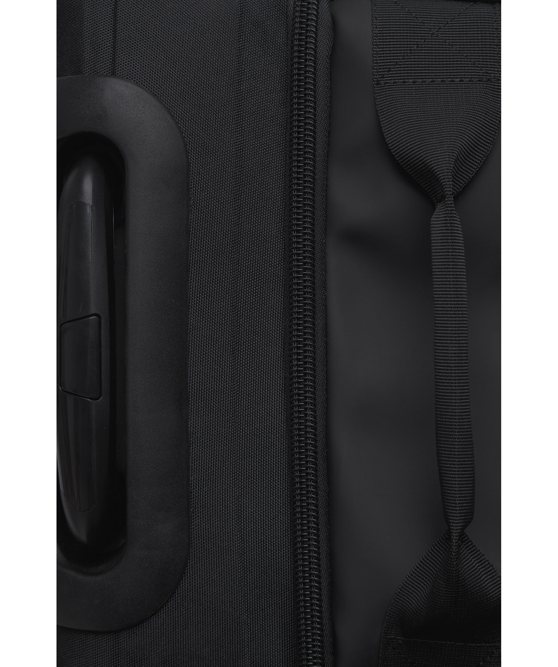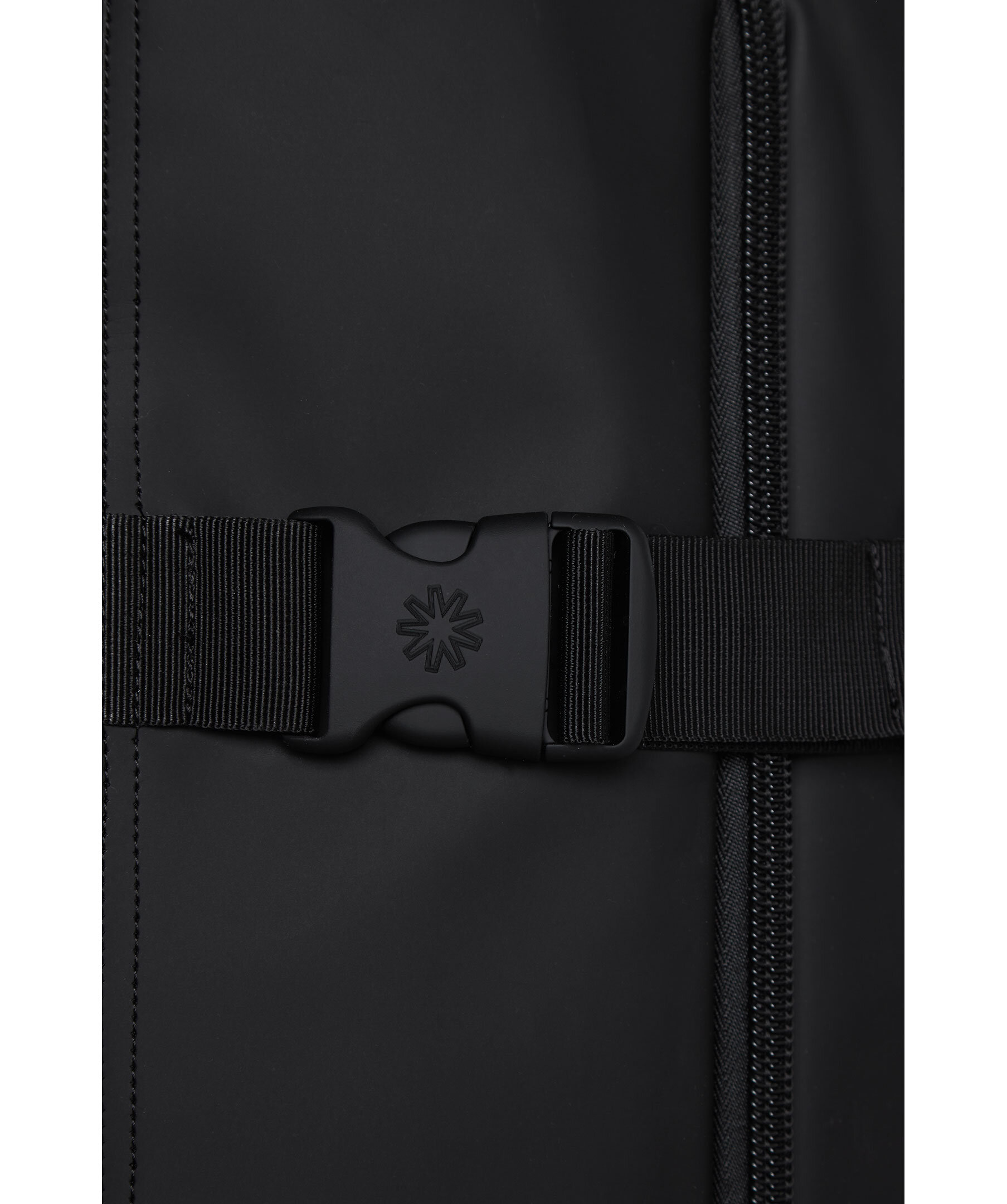 Svart vikbar rullväska i vattentätt material från Rains. Teleskophandtag. Ett Bärhandtag på väskans kortsida och ett på långsidan. Stor logotyp tryck på väskans framsida. Väskan stängs med dragkedja och och remmar med spännen. Två meshhuvudfack, varav ett med elastiska korsband. Väskan har en blixtlåsficka fram för lätt åtkomst till pass, nycklar m.m. Väskans mått: H 23 x B 40 x D 20 cm.