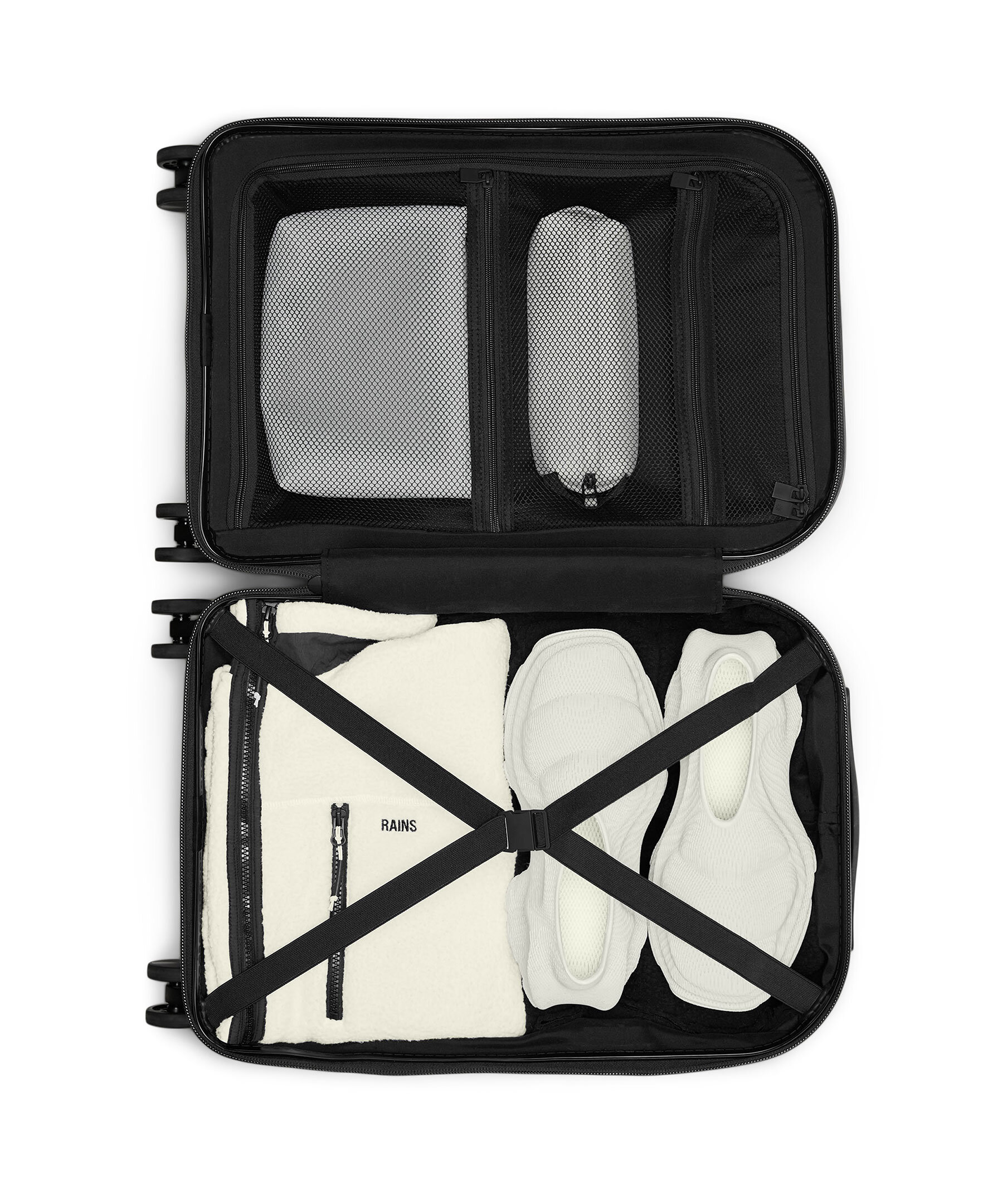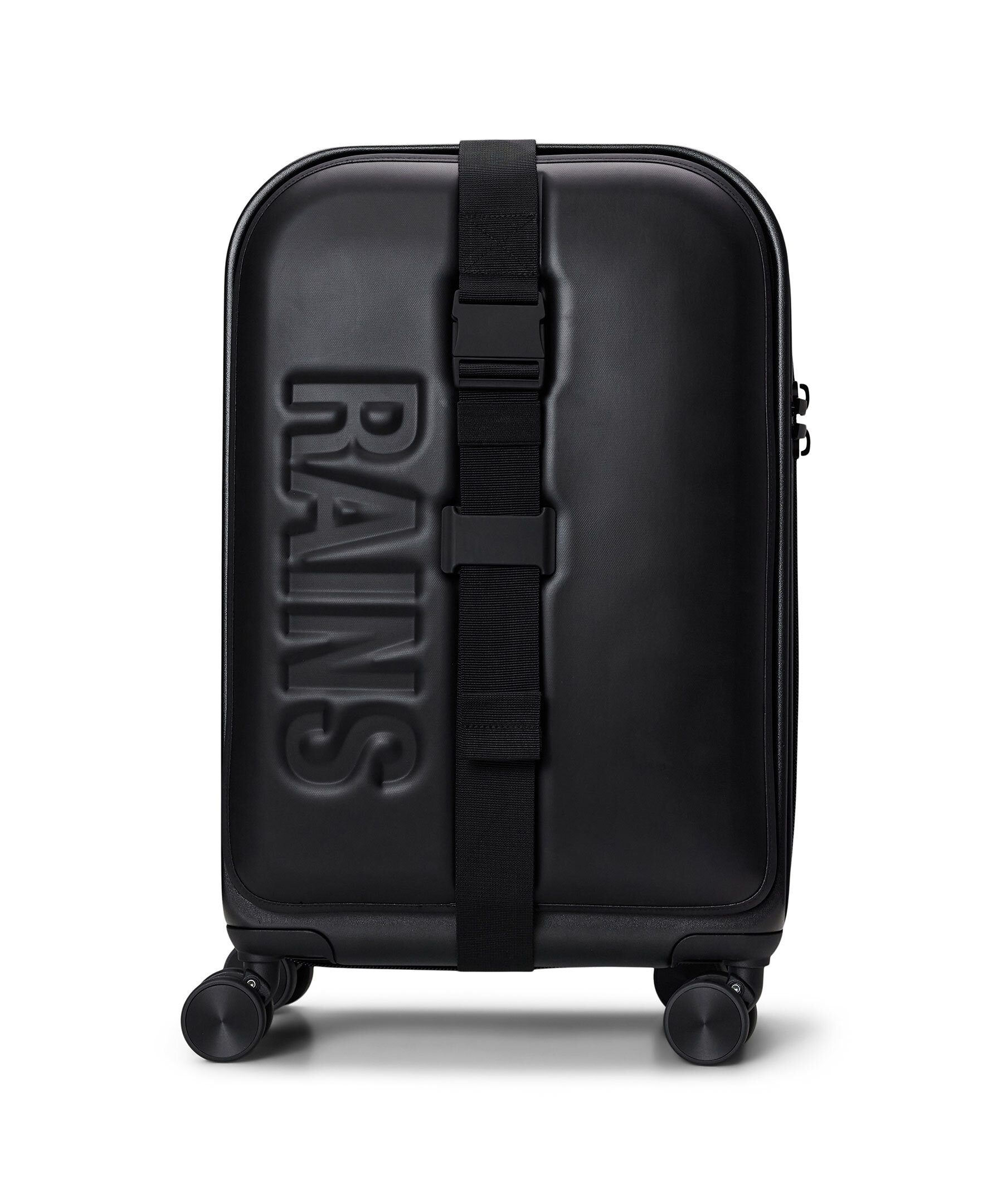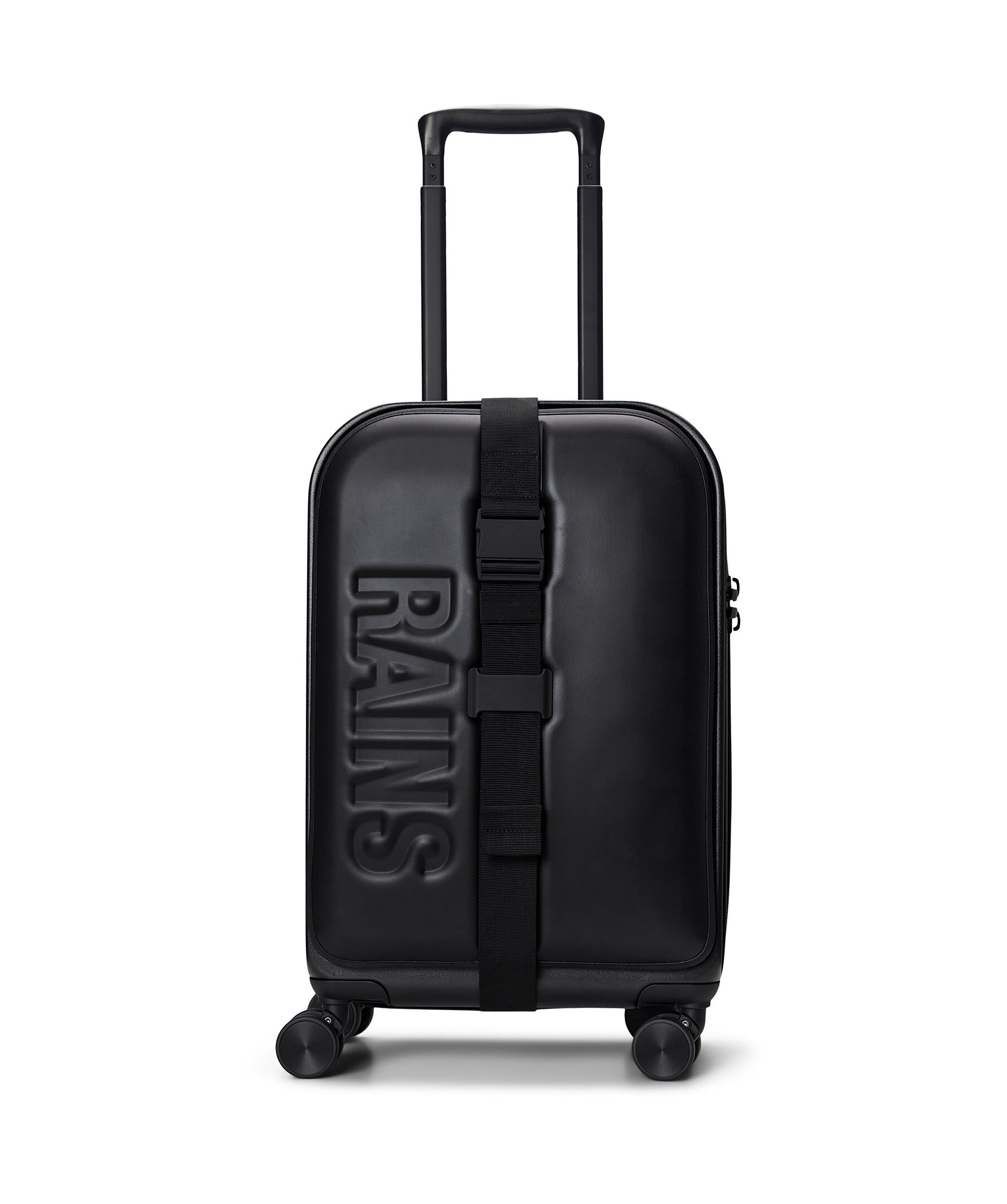 Svart resväska från Rains med fyra hjul. Vattentät dubbelvikbar design, två rymliga fack med en helsilhuettdragkedja. Teleskopshandtag. Kompressions rem framtill som stängs med spänne. Handbagage anpassat mått, väskans mått: H 56 x B 33 x D 25 cm. Väskan rymmer 45, 4 L.