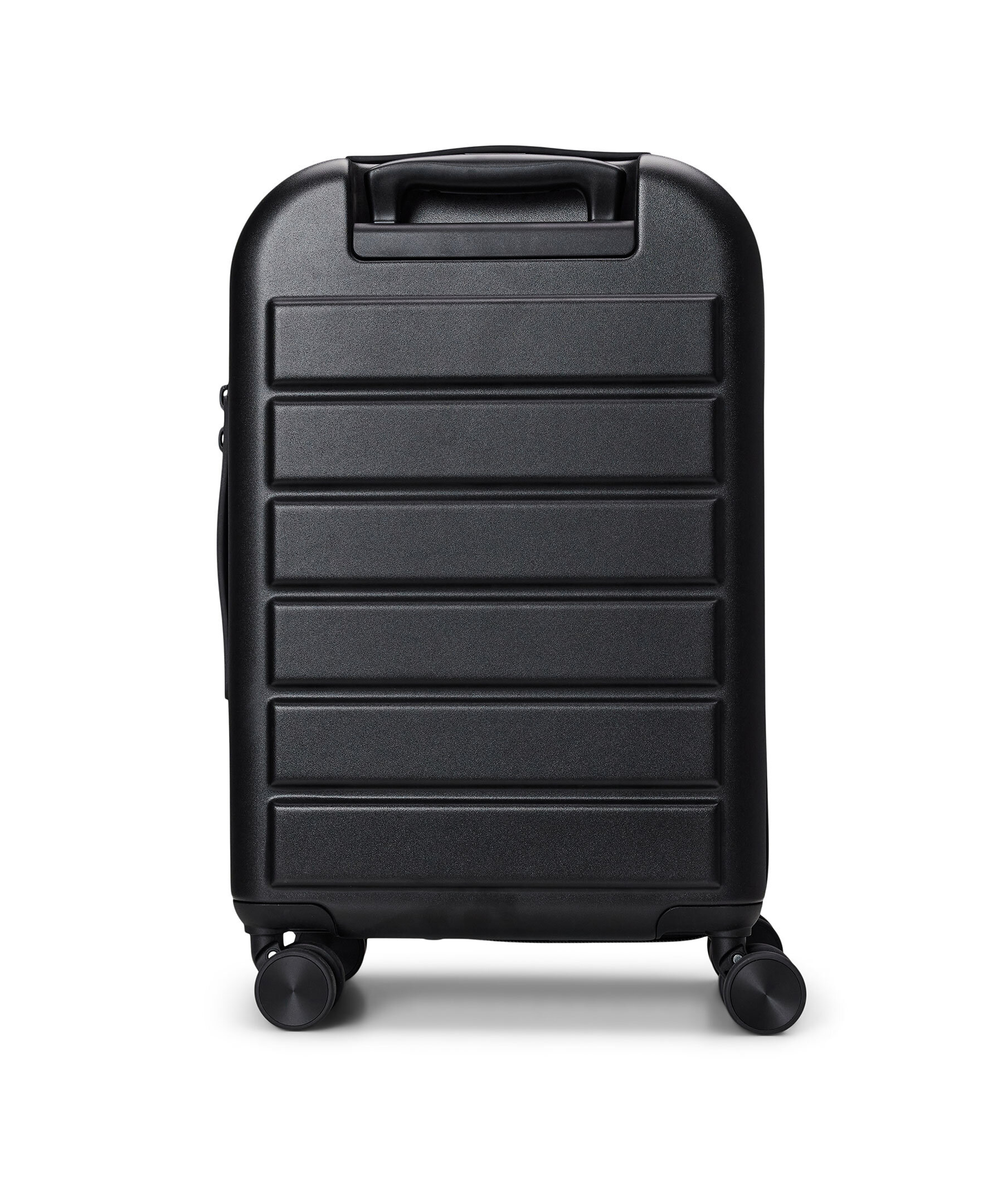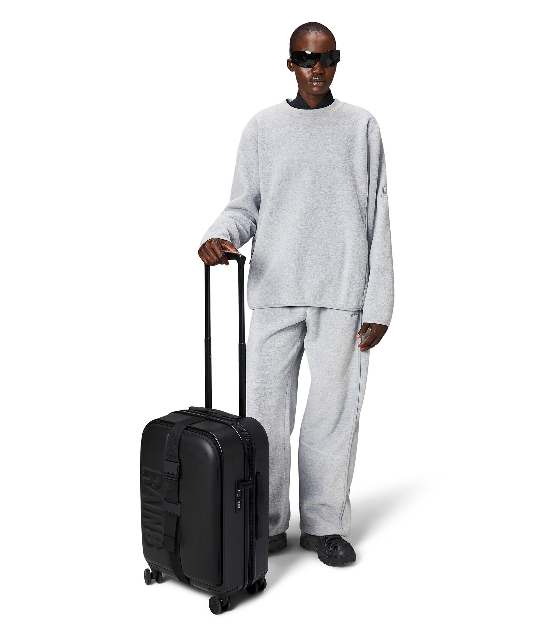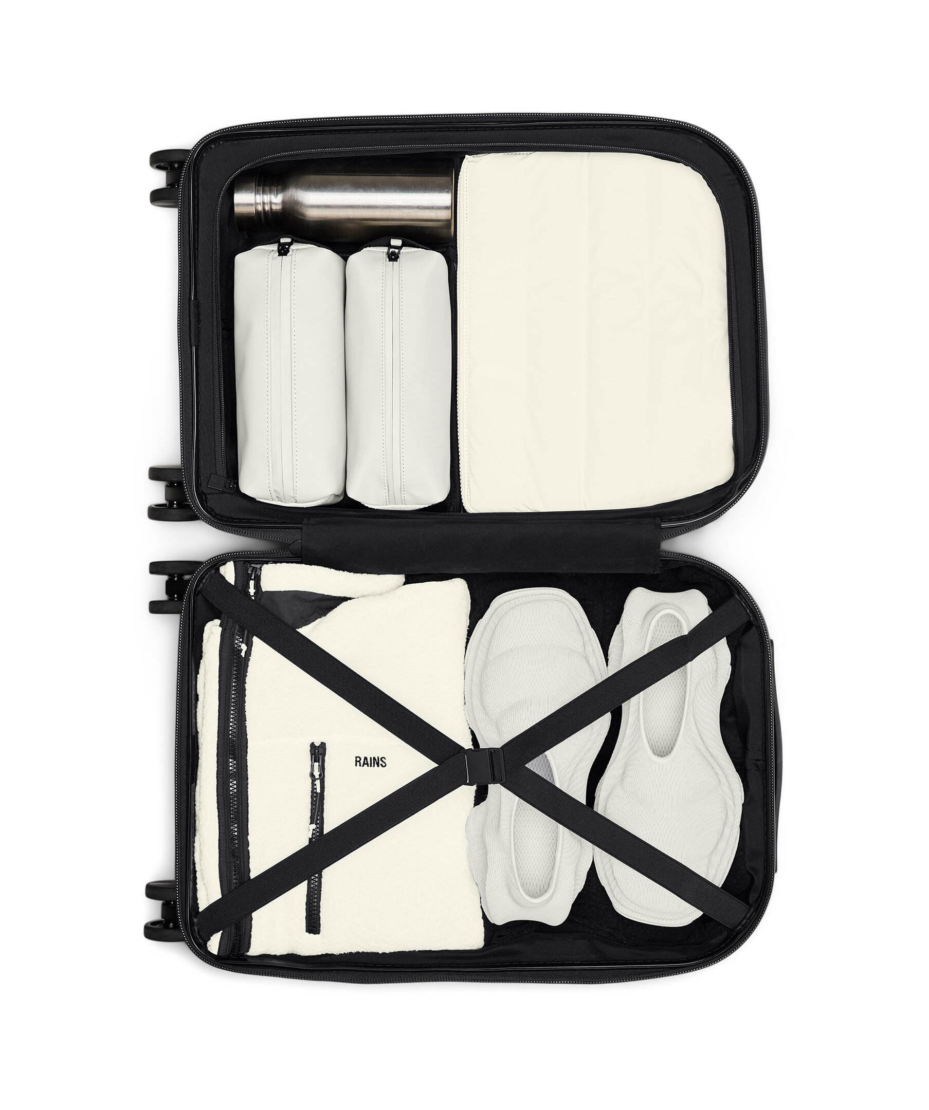 Svart resväska från Rains med fyra hjul. Vattentät dubbelvikbar design, två rymliga fack med en helsilhuettdragkedja. Teleskopshandtag. Kompressions rem framtill som stängs med spänne. Handbagage anpassat mått, väskans mått: H 56 x B 33 x D 25 cm. Väskan rymmer 45, 4 L.