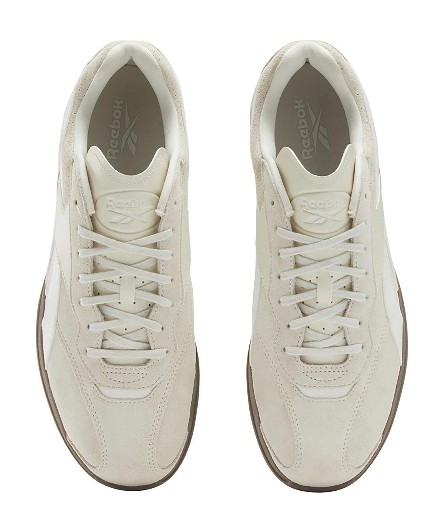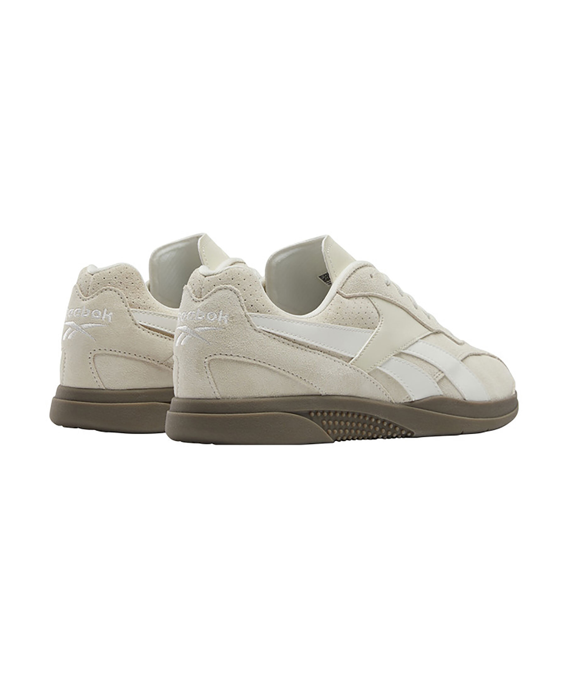 Sandfärgade sneakers från Reebok. Skorna har vita detaljer, logotyp på plösen och på hälen samt en brun sula. Tillverkade med paneler i belagt läder och mocka.