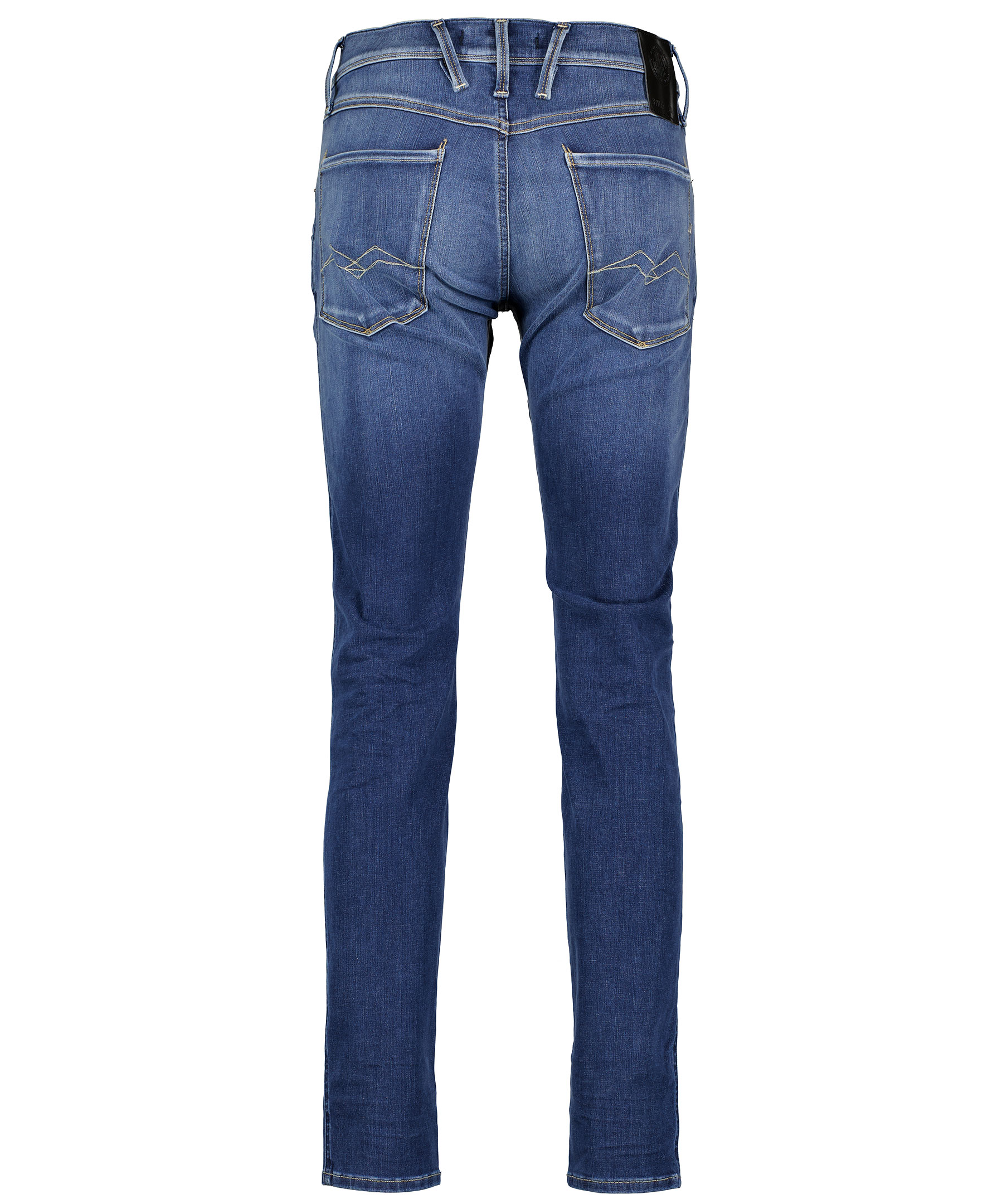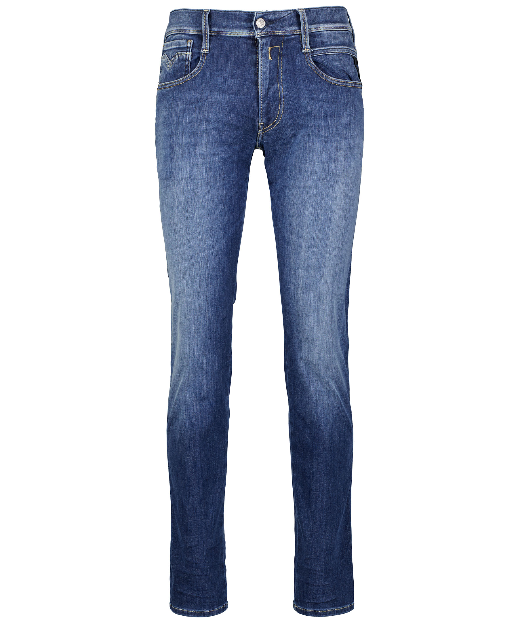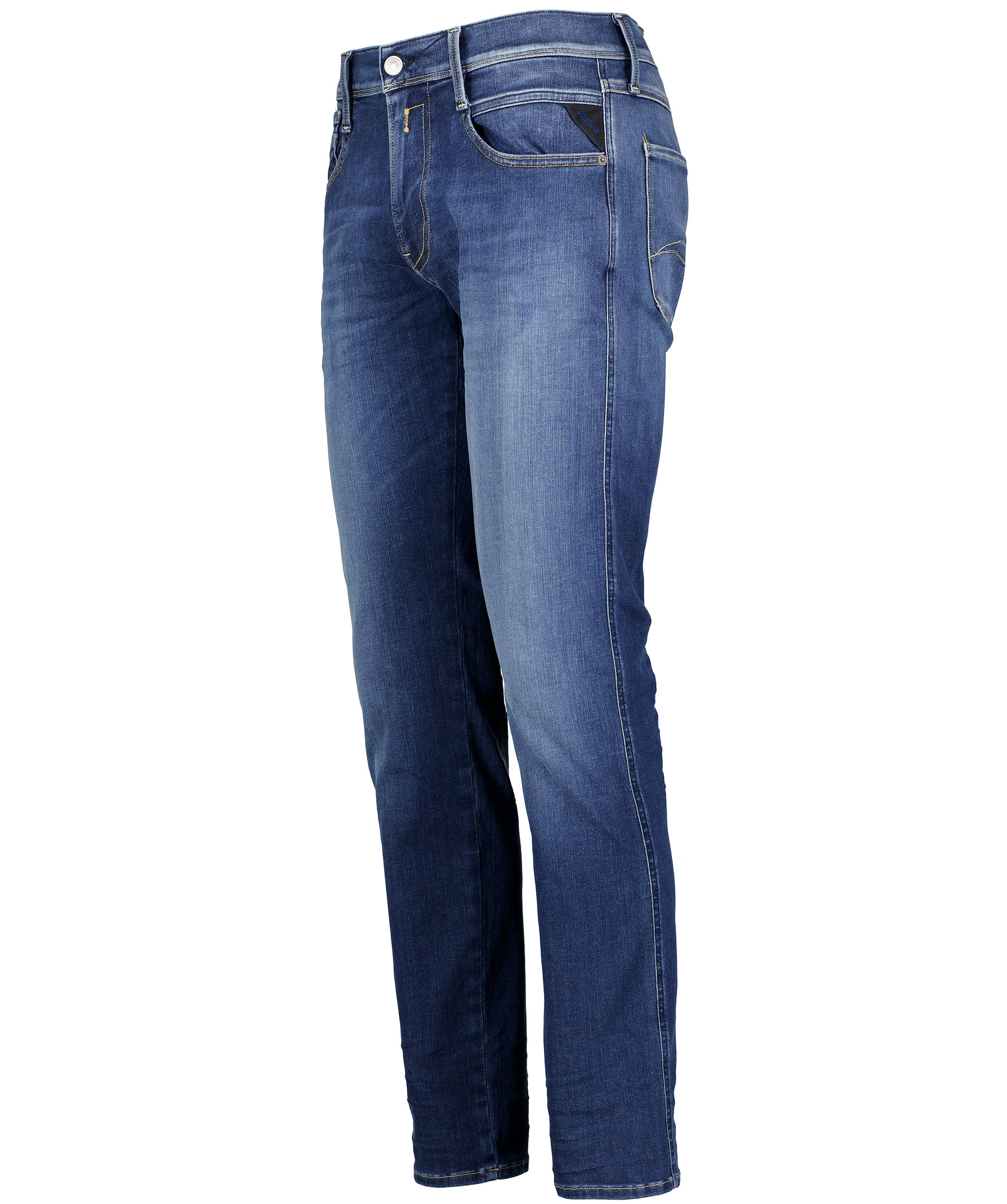 Mellanblåa jeans från Replay i slim fit modell och normalhög midja. Stängs med knapp och dragkedja i gylfen och har hällor för bälte i midjan. Femficksmodell och har en sliten look.
