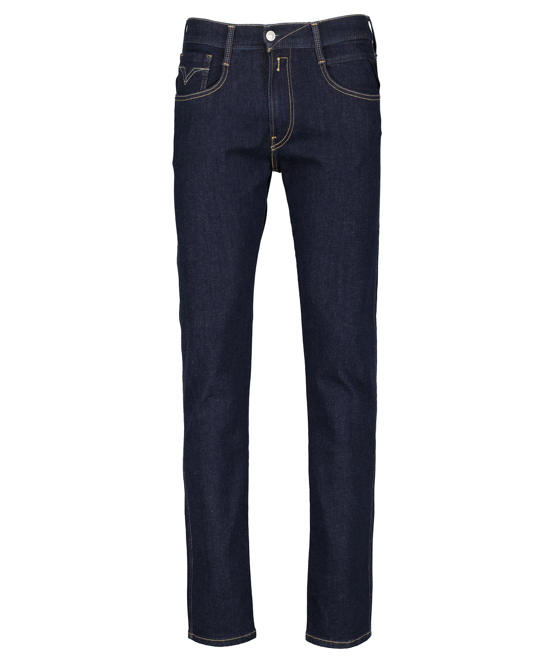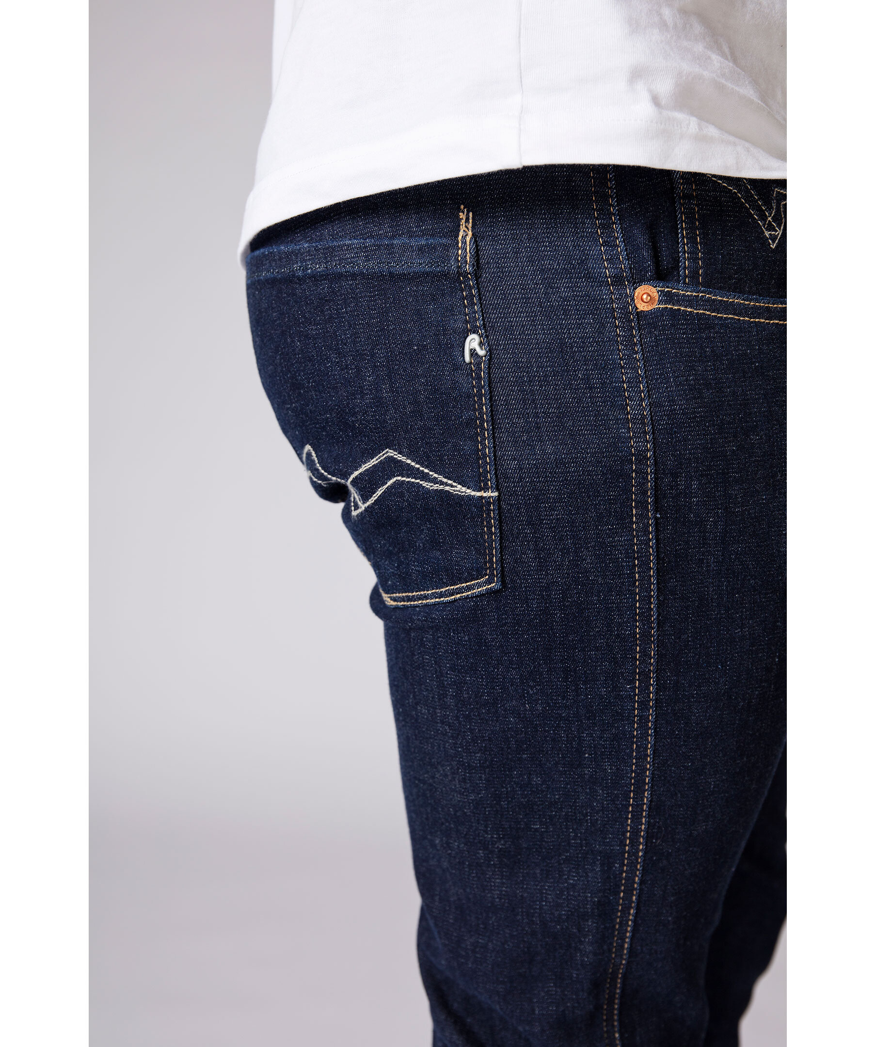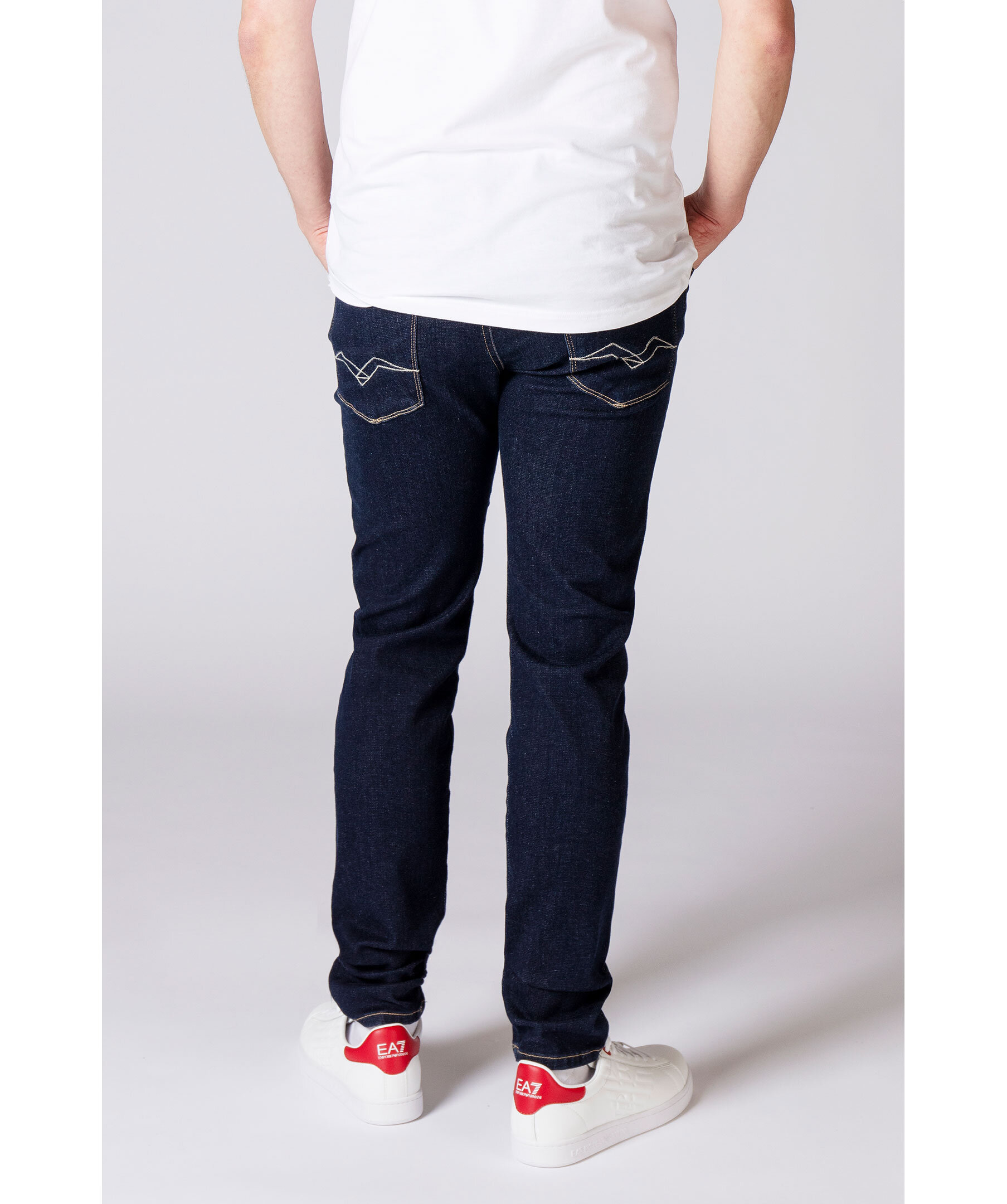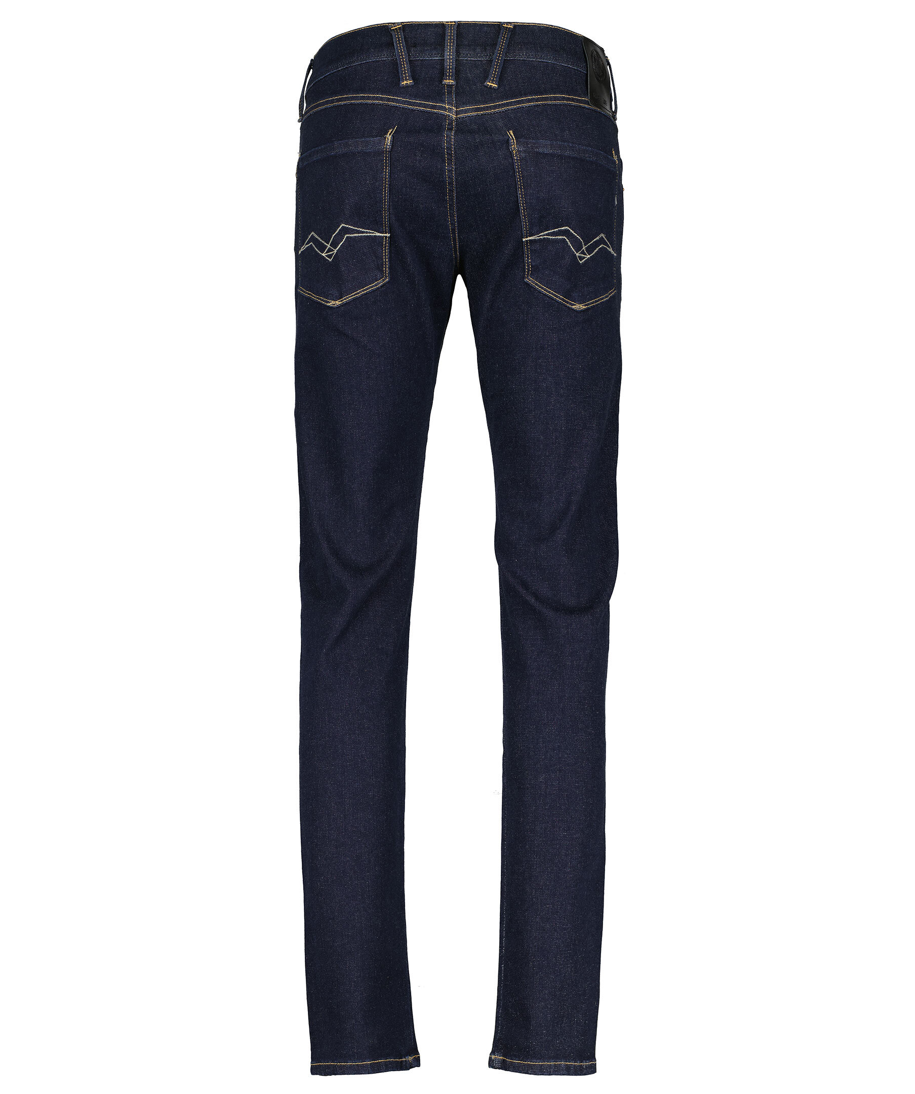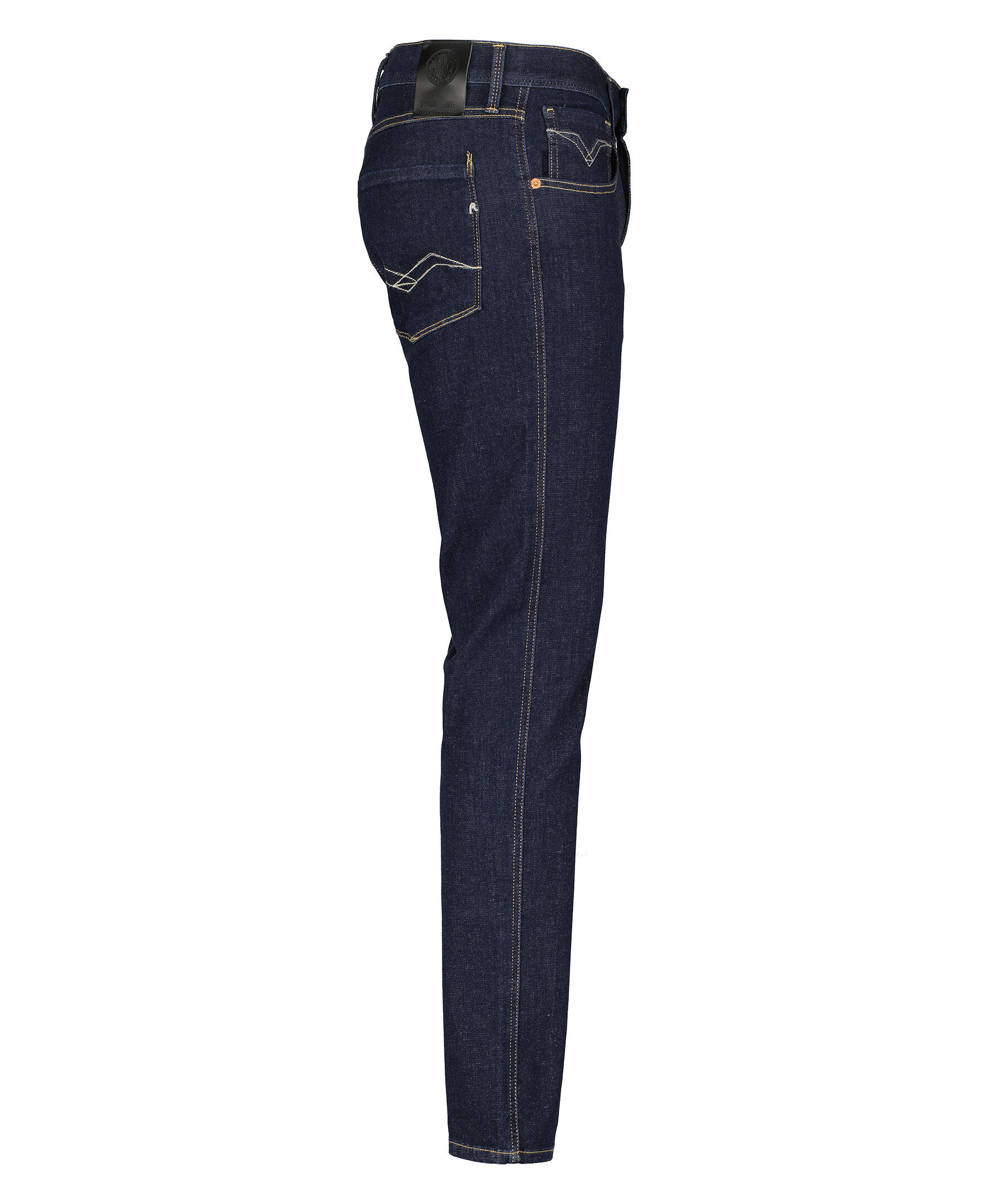 Mörkblåa slim fit jeans i hyperflex modell från Replay. Power stretch denim med fyrvägsstretch i bomullsblandning med en mörk tvätt. Vanlig midja och något avsmalnande ben, fem fickor, triangelformad REPLAY-etikett på vänster ficka, mynt ficka och bakfickor med ikoniska replay-sömmar. R-formad metallbricka på höger bakficka, dragkedja och knappgylf samt hällor för bälte i midjan. Jeansen är lite stora i storlek, vi rekommenderar att gå ner en storlek för bäst passform. Modellen är 180cm lång och har på sig storlek 32"32.