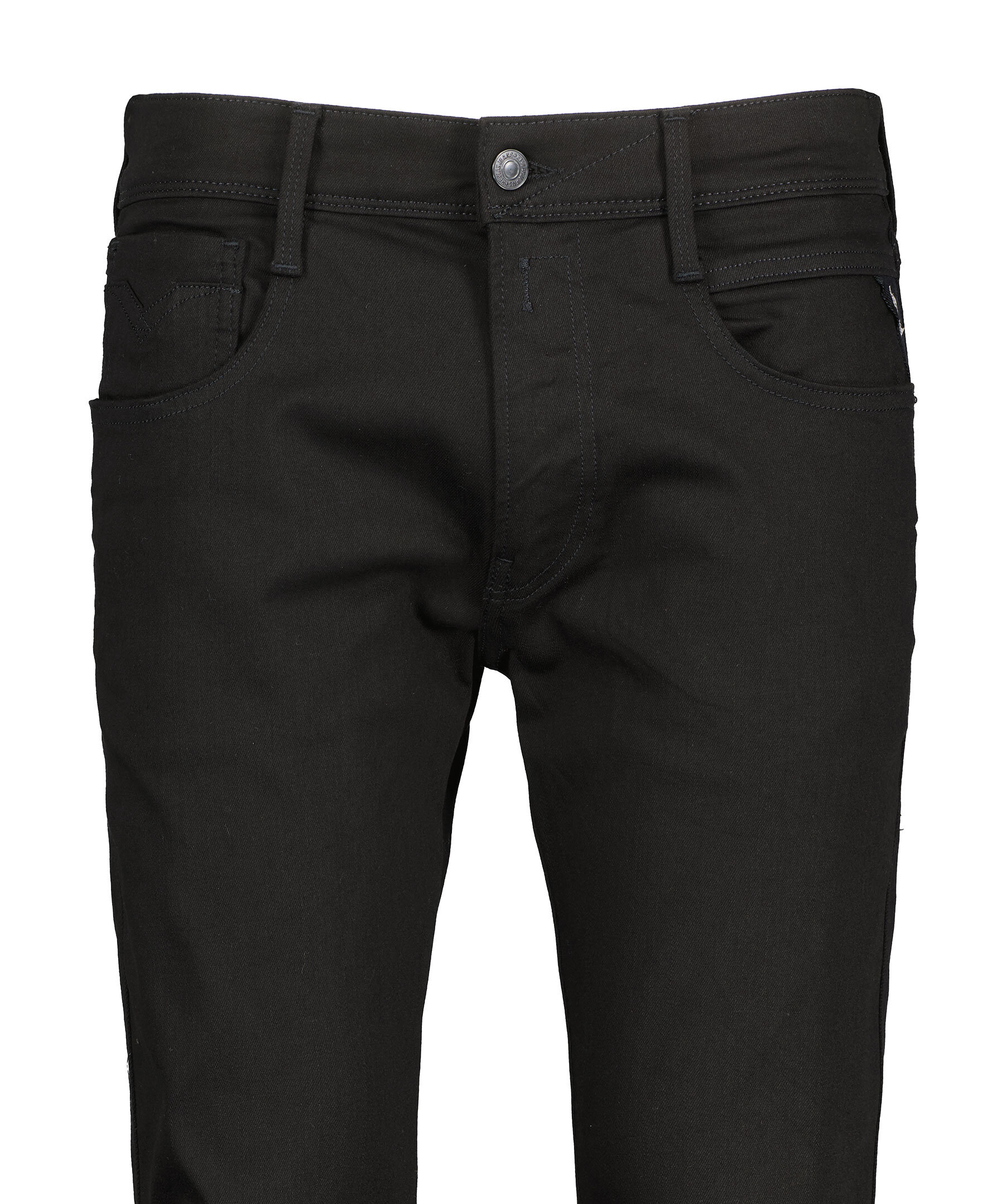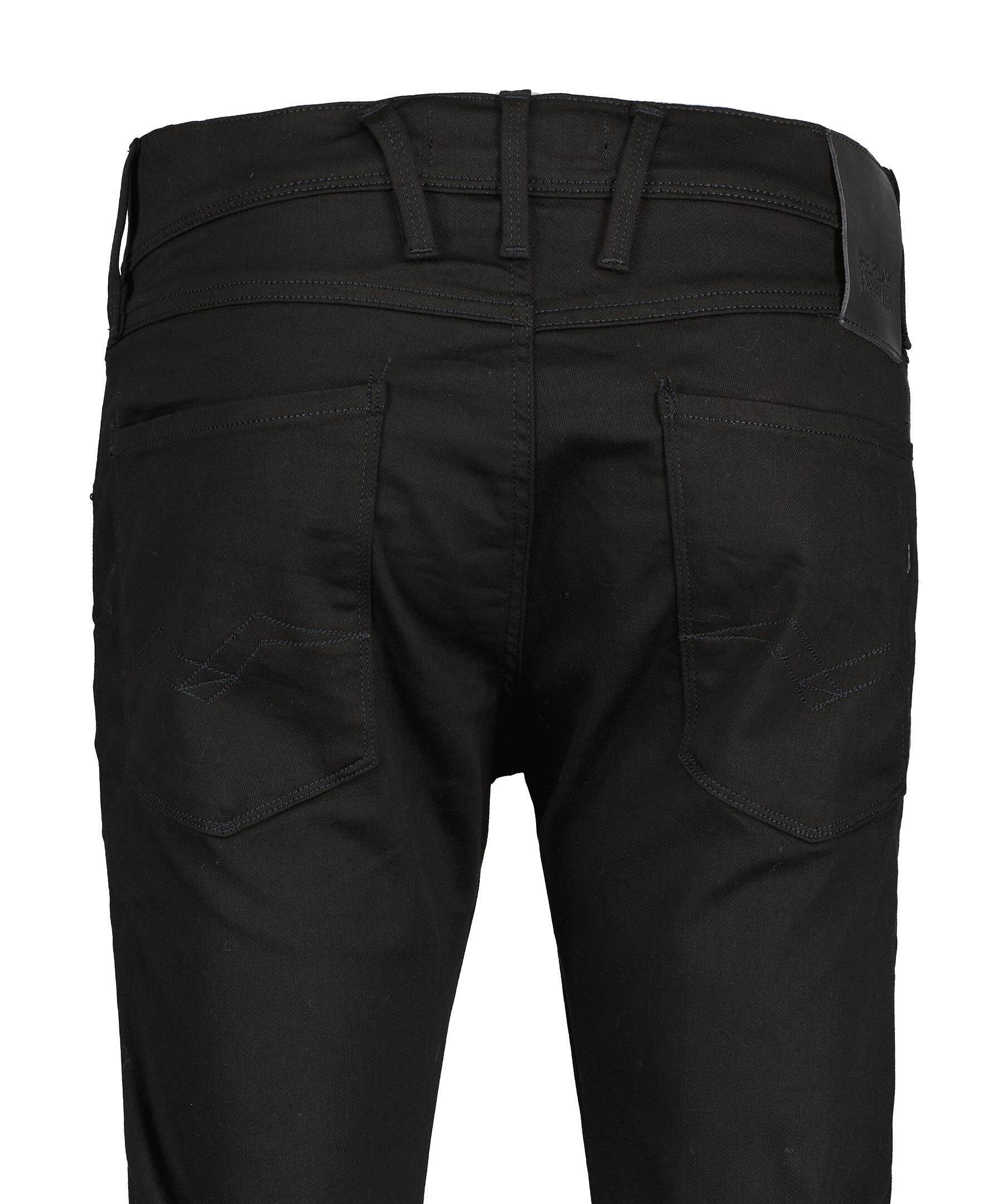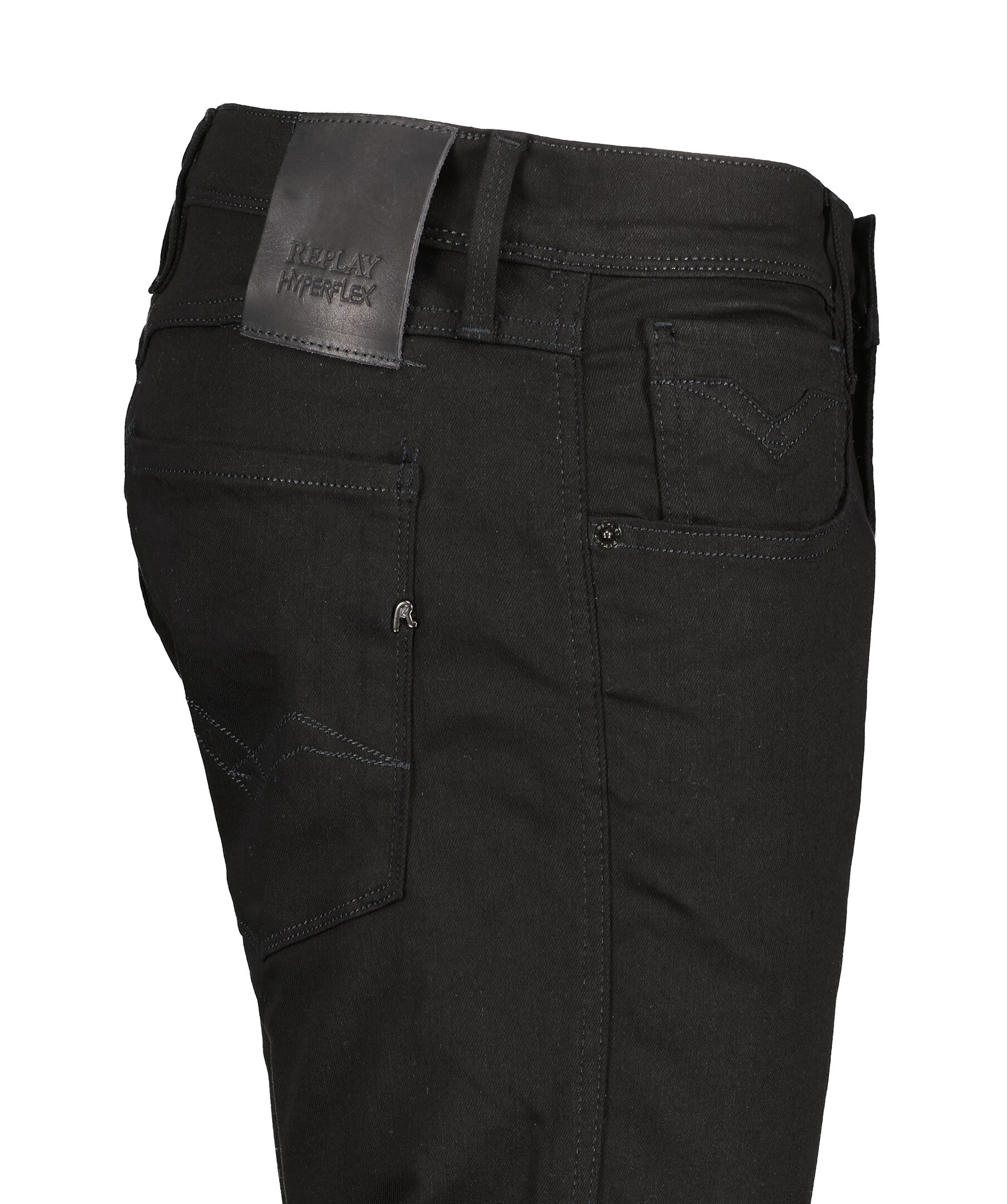 Svarta slim fit jeans i hyperflex modell från Replay. Jeansen är lite stora i storlek, vi rekommenderar att gå ner en storlek för bäst passform. Power stretch denim med fyrvägsstretch i bomullsblandning med en mörk tvätt. Vanlig midja och något avsmalnande ben, fem fickor, triangelformad REPLAY-etikett på vänster ficka, myntficka och bakfickor med ikoniska replay-sömmar. R-formad metallbricka på höger bakficka, dragkedja och knappgylf samt hällor för bälte i midjan.