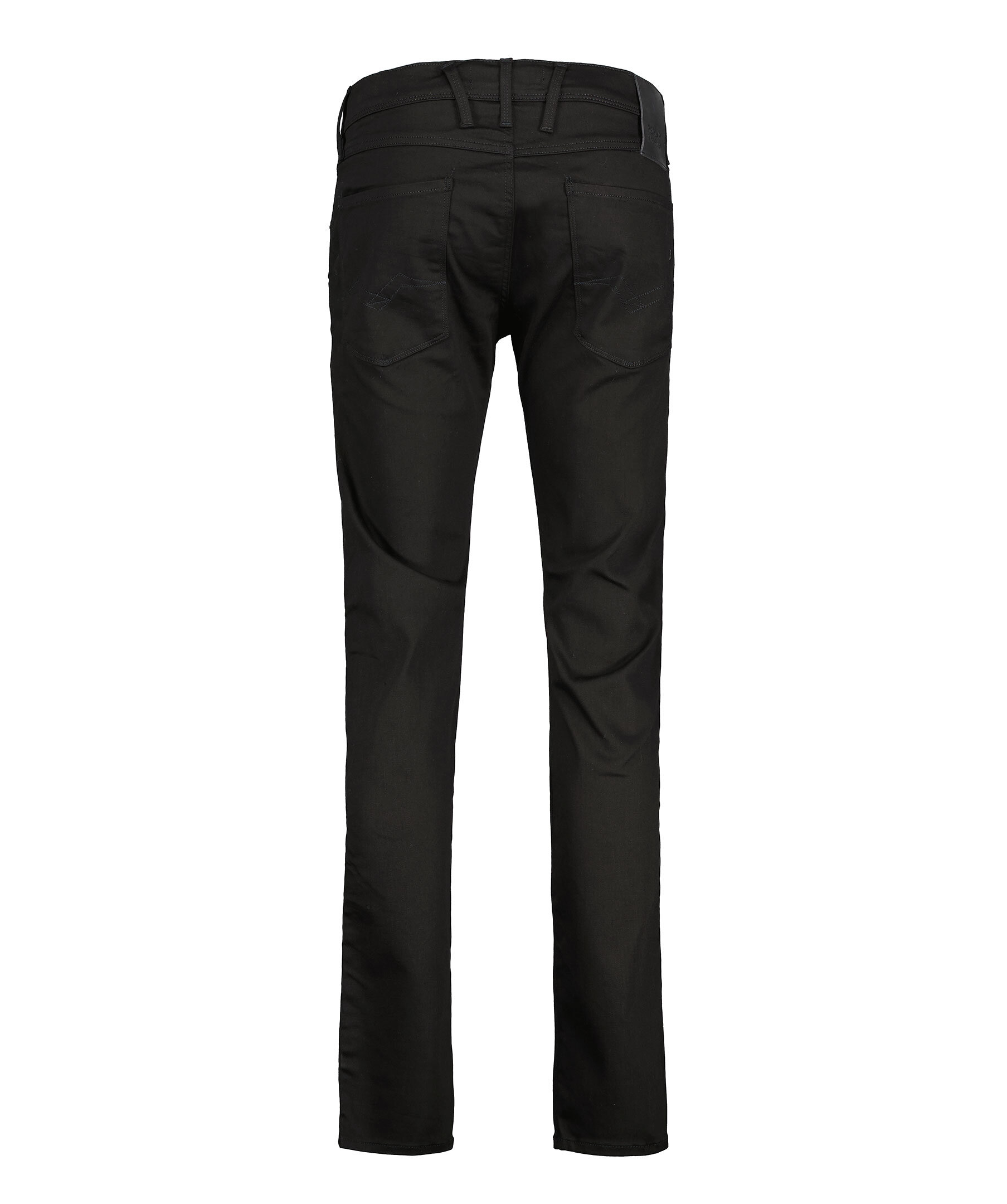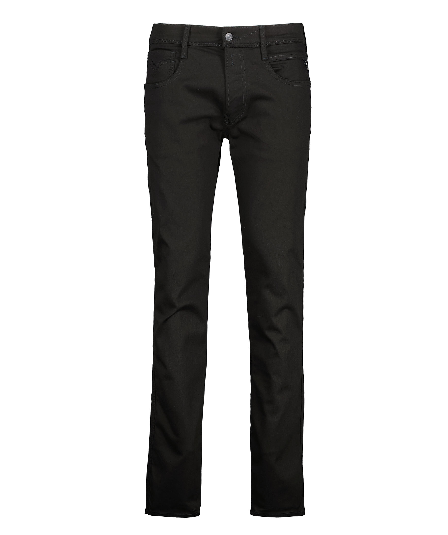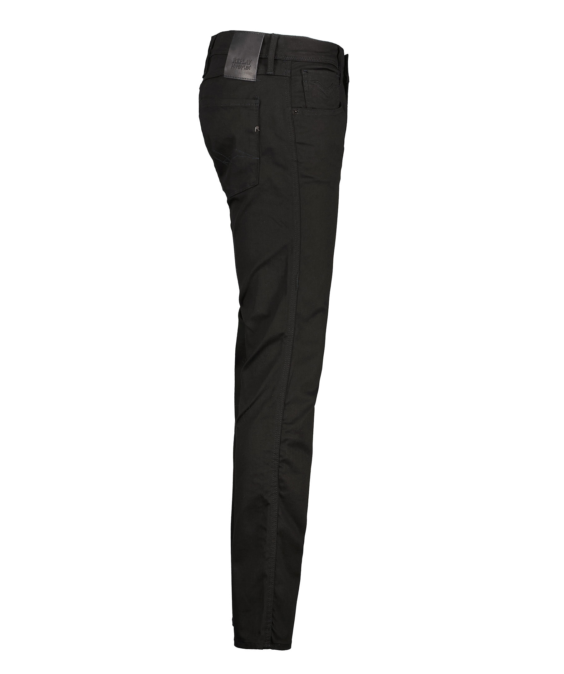 Svarta slim fit jeans i hyperflex modell från Replay. Jeansen är lite stora i storlek, vi rekommenderar att gå ner en storlek för bäst passform. Power stretch denim med fyrvägsstretch i bomullsblandning med en mörk tvätt. Vanlig midja och något avsmalnande ben, fem fickor, triangelformad REPLAY-etikett på vänster ficka, myntficka och bakfickor med ikoniska replay-sömmar. R-formad metallbricka på höger bakficka, dragkedja och knappgylf samt hällor för bälte i midjan.