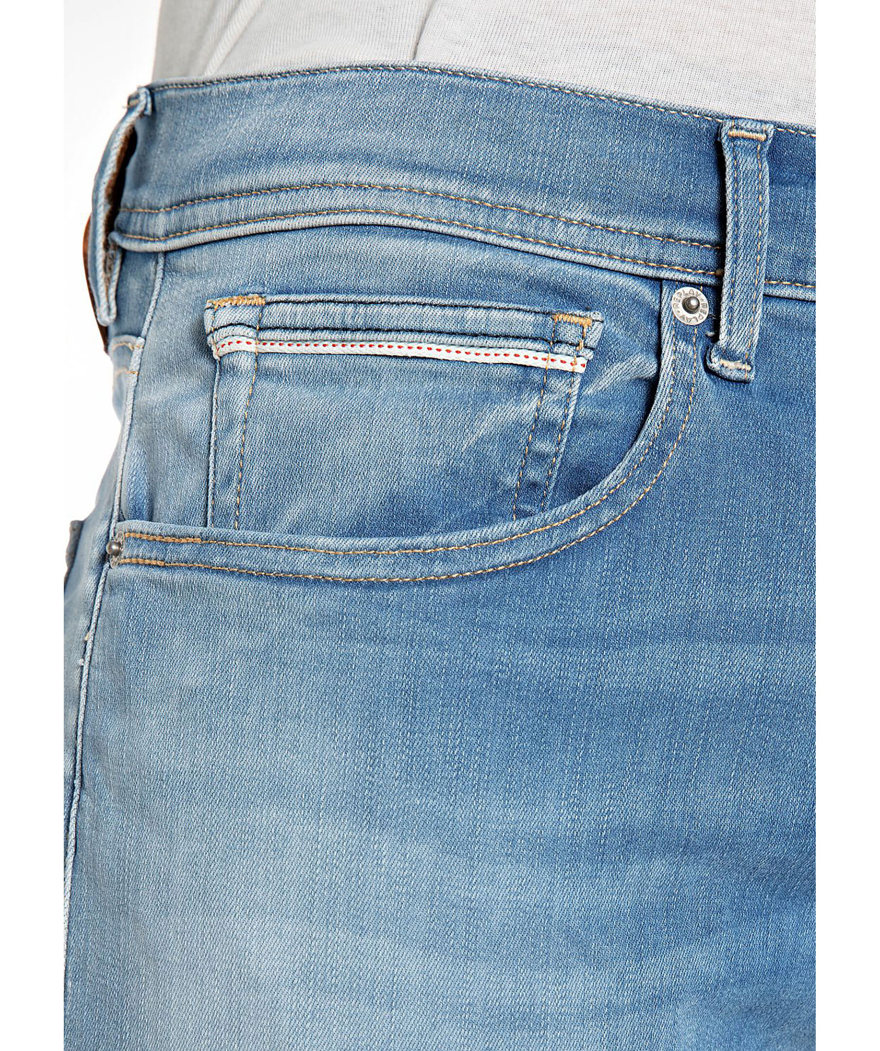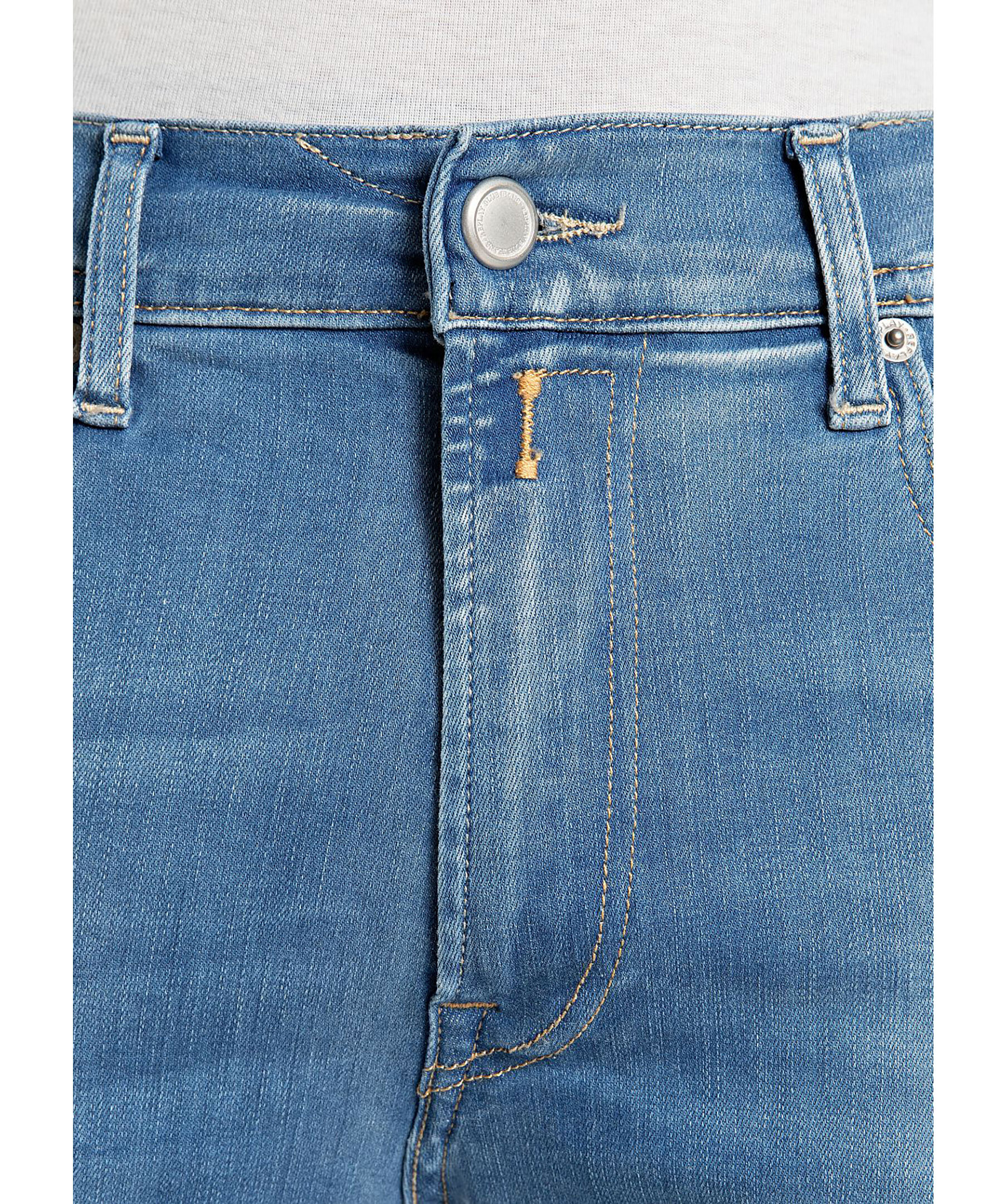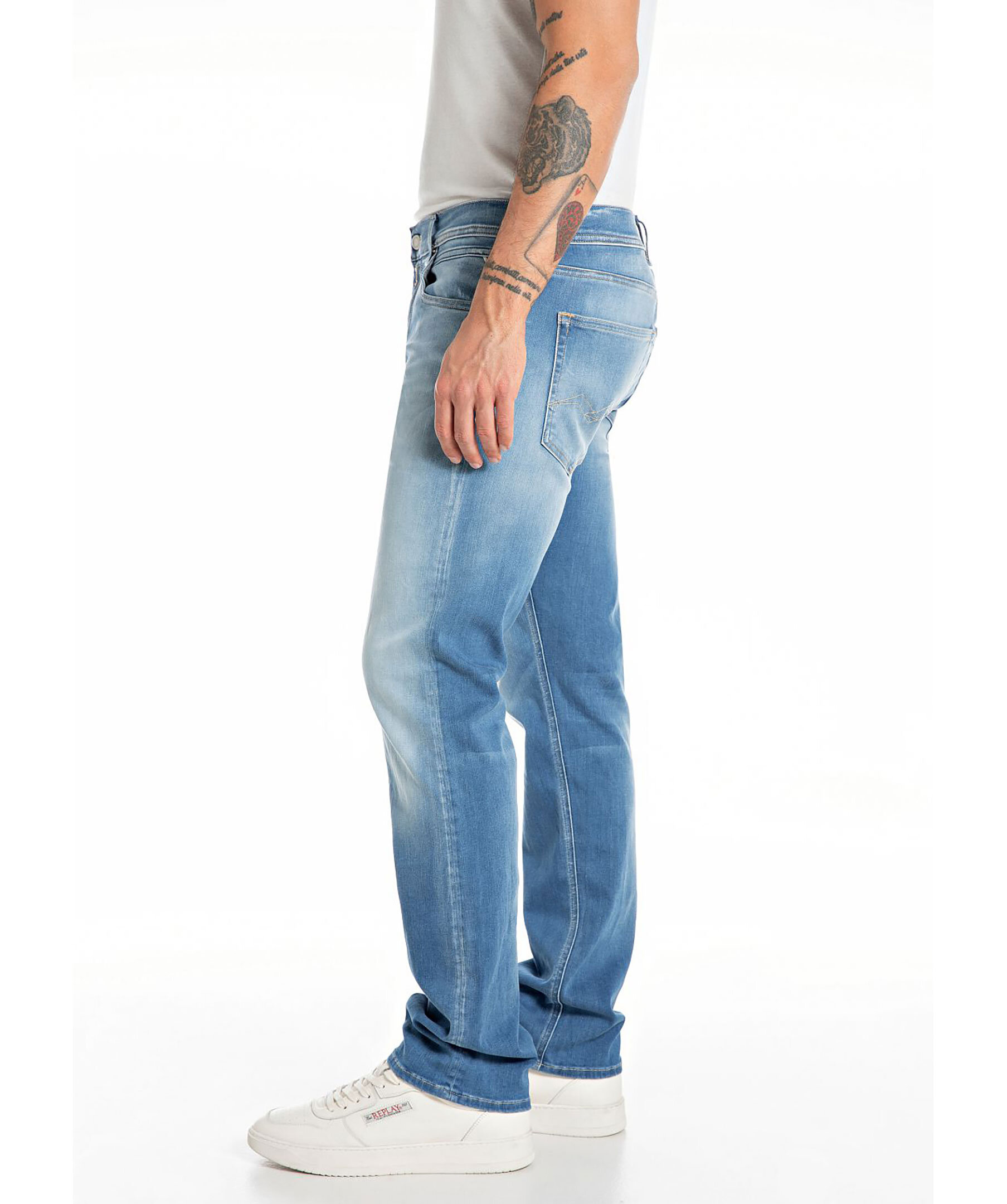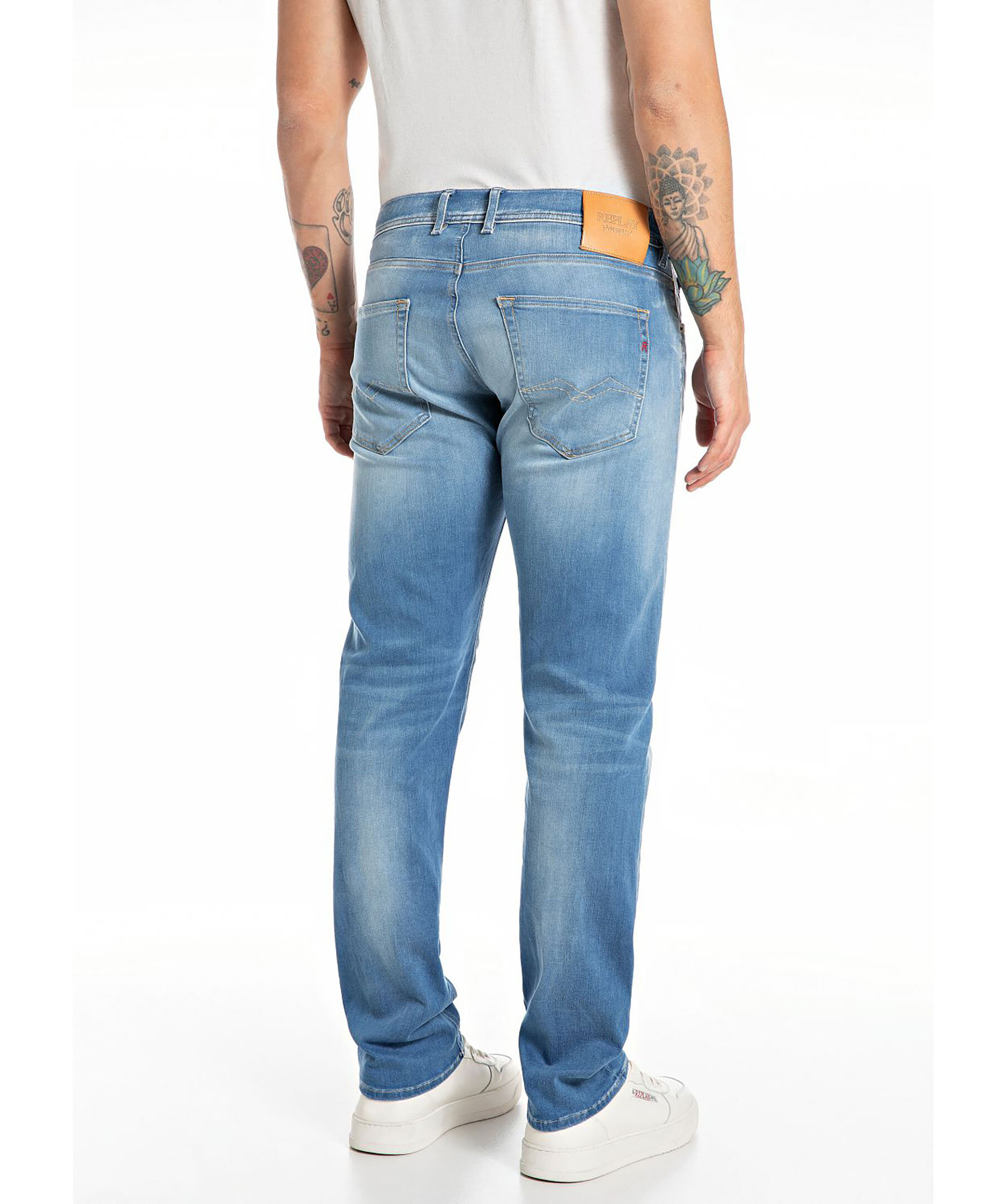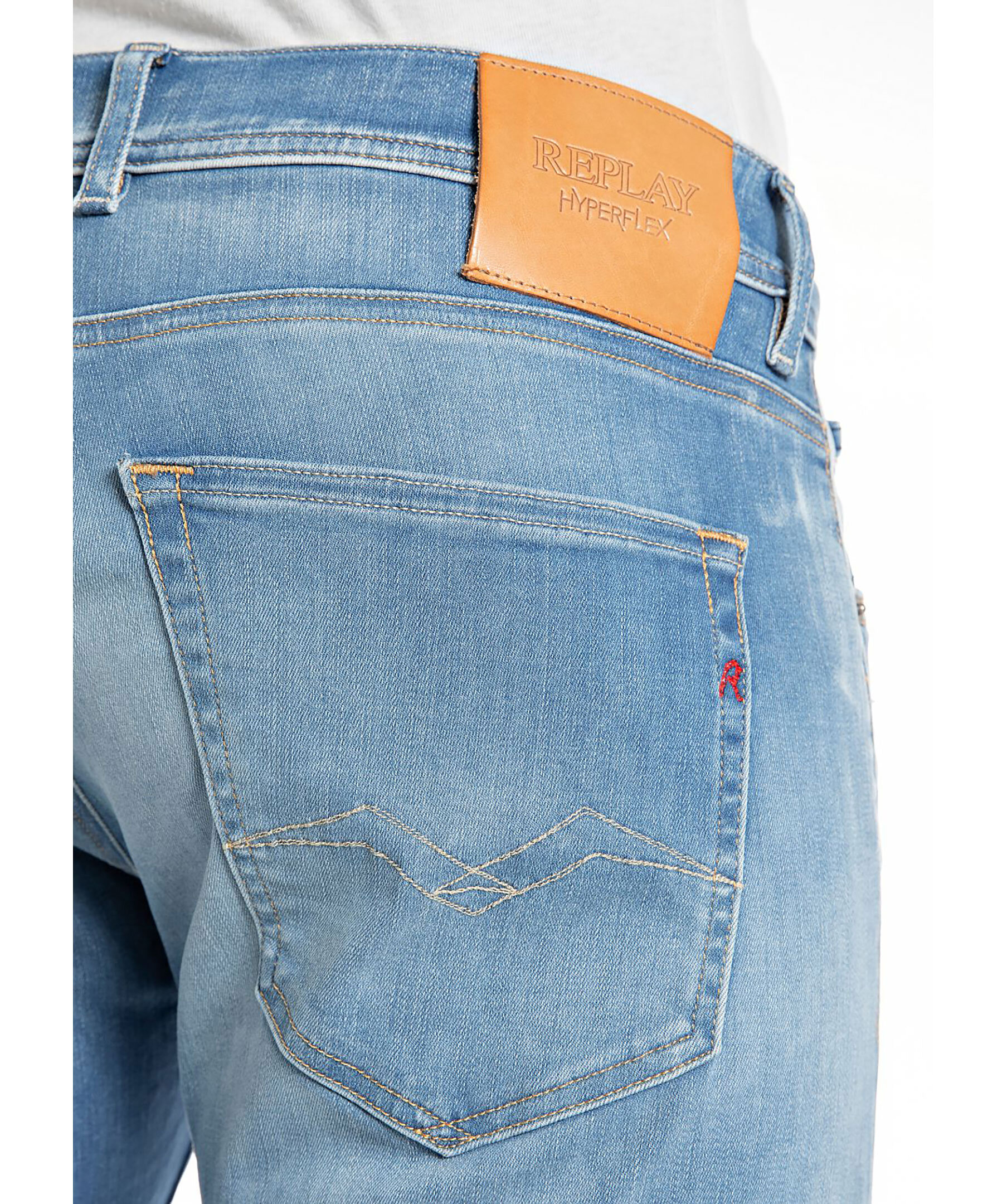 Blåa jeans från Replay. Jeansen har en normalhög midja med bälteshällor, fem fickor, triangelformad REPLAY-etikett på vänster ficka, mynt ficka och bakfickor med ikoniska replay-sömmar. Läder etikett på linningen samt litet broderat R på höger bakficka. Tillverkad i en stretchig bomullsblandning.