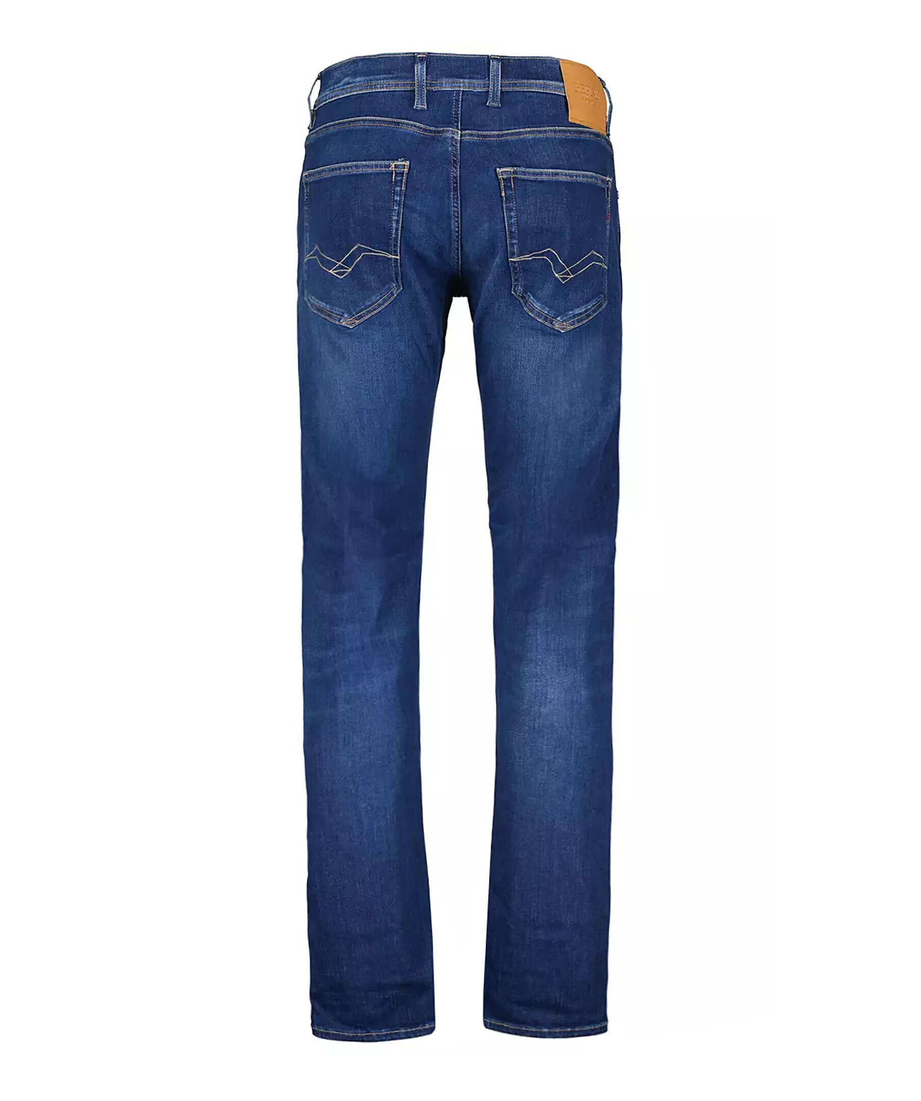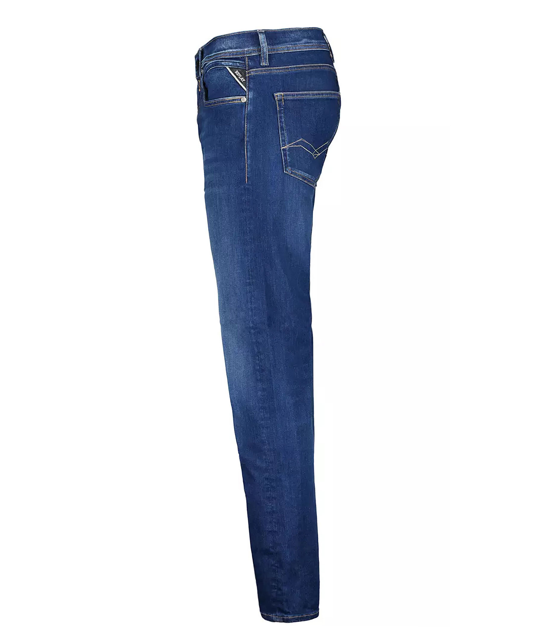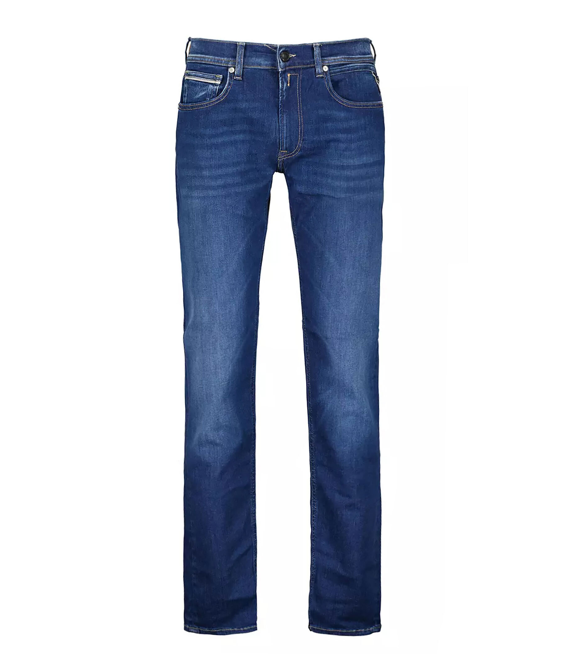 Blå jeans från Replay. Jeansen har en normalhög midja med bälteshällor, fem fickor, triangelformad REPLAY-etikett på vänster ficka, mynt ficka och bakfickor med ikoniska replay-sömmar. Läder etikett på linningen samt litet rött broderat R på höger bakficka. Tillverkad i en stretchig bomullsblandning.