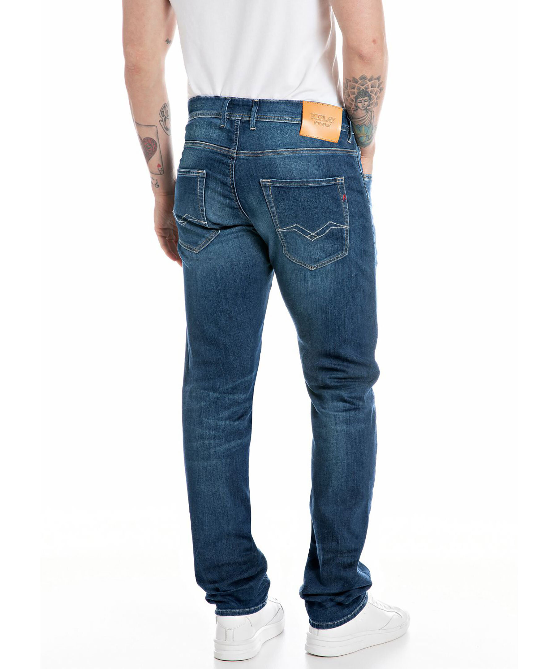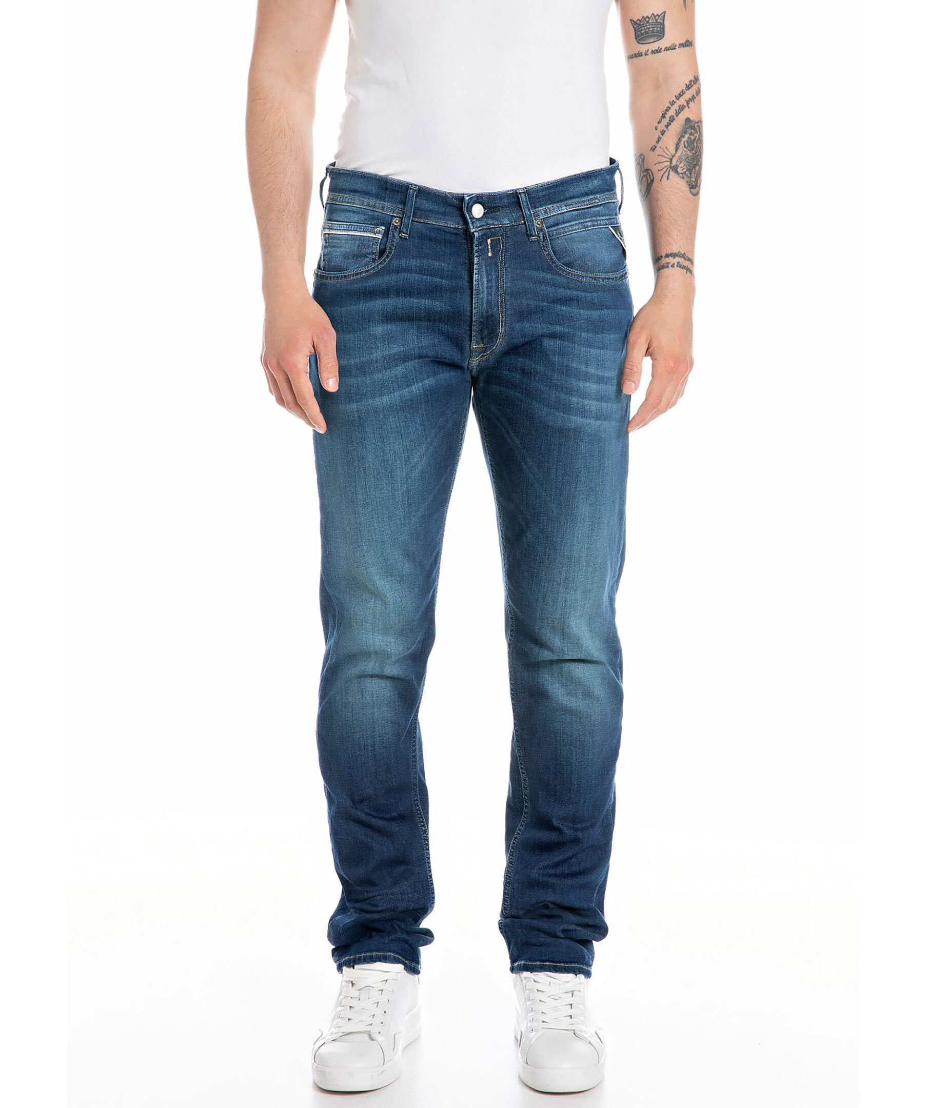 Mörkblåa jeans från Replay. Jeansen har en normalhög midja med bälteshällor, fem fickor, triangelformad REPLAY-etikett på vänster ficka, mynt ficka och bakfickor med ikoniska replay-sömmar. Läder etikett på linningen samt litet broderat R på höger bakficka. Tillverkad i en stretchig bomullsblandning.