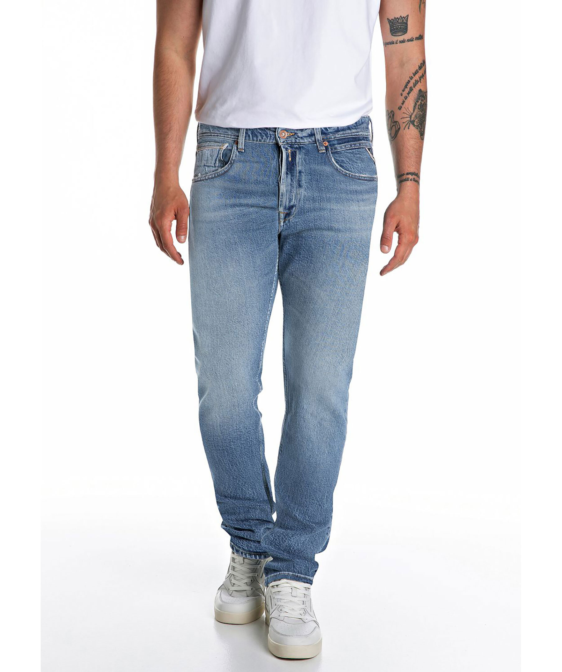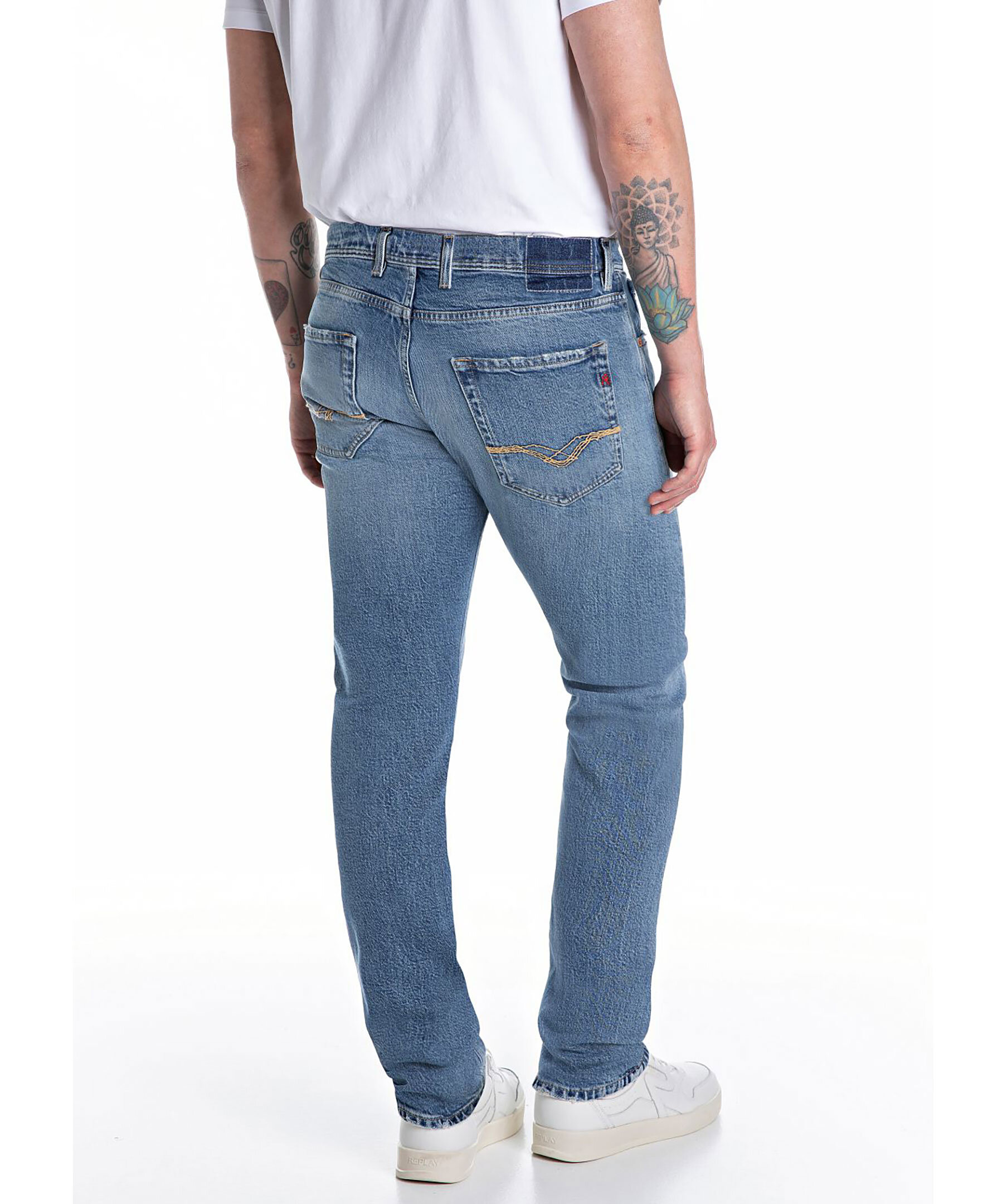 Blåa jeans från Replay. Jeansen har en normalhög midja med bälteshällor, fem fickor, triangelformad REPLAY-etikett, mynt ficka och bakfickor med ikoniska replay-sömmar. Litet rött broderat R på höger bakficka. Tillverkad i en stretchig bomullsblandning.
