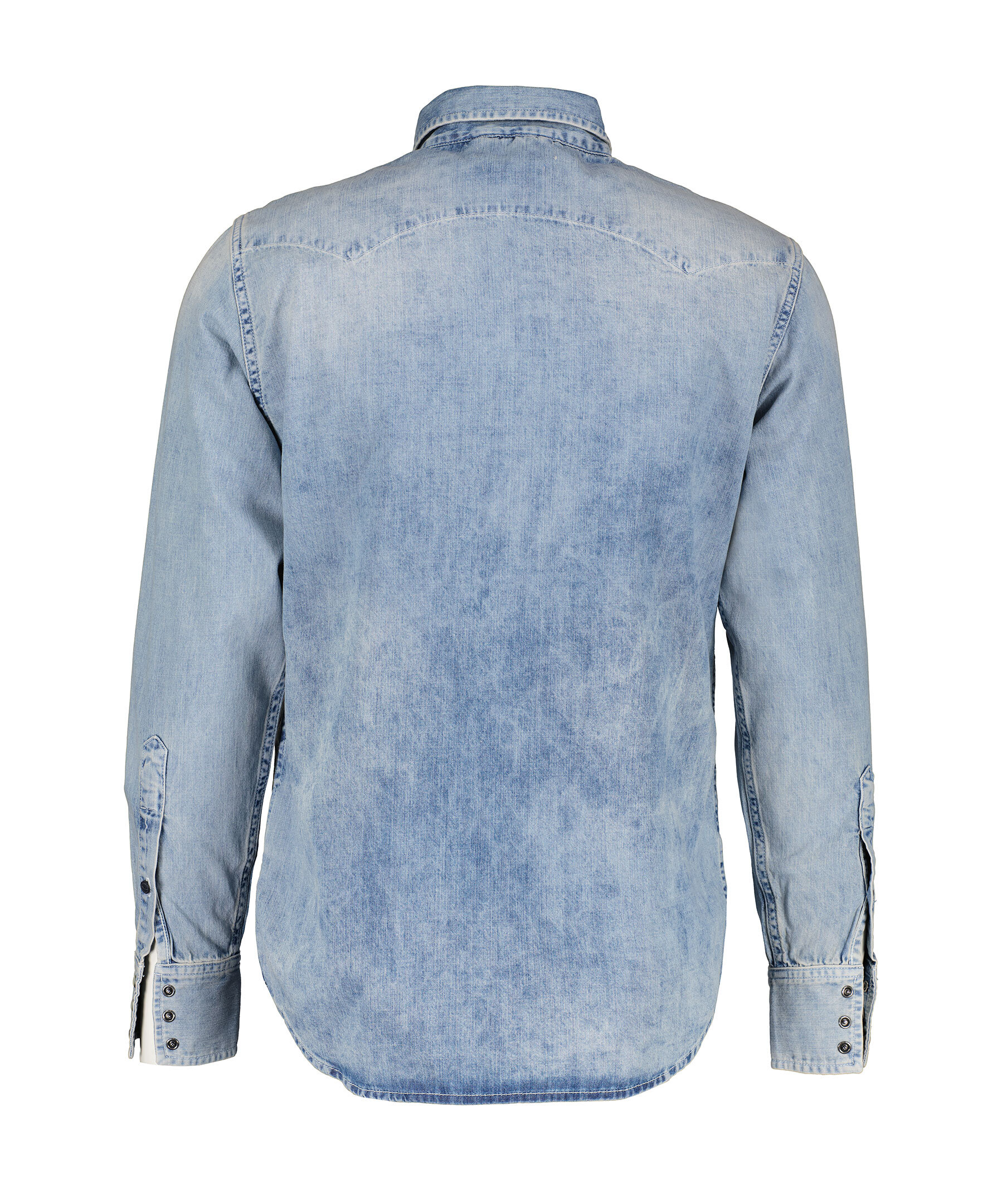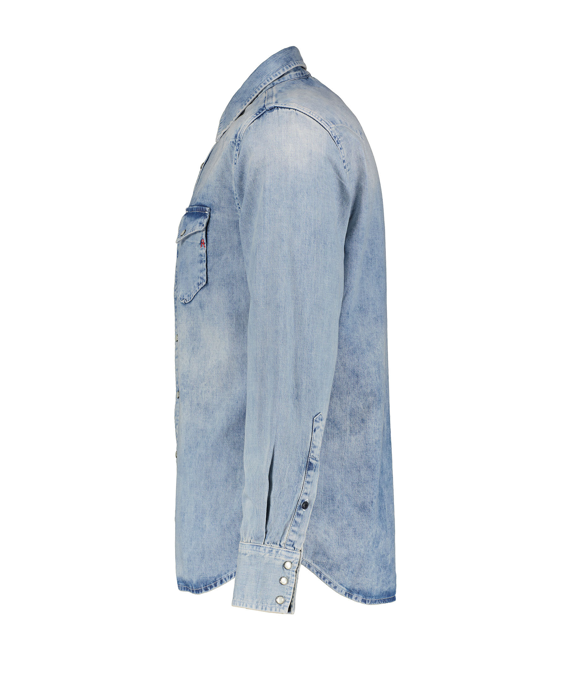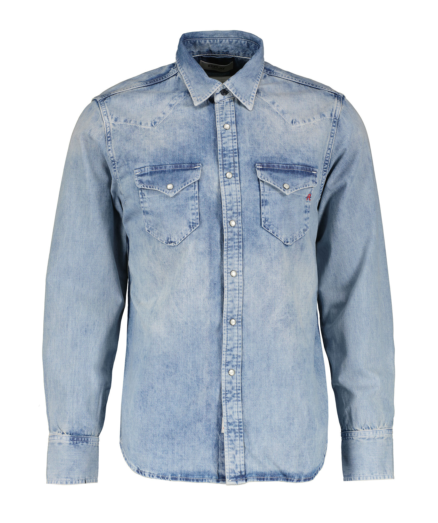 Jeansskjorta från Replay. Skjortan stängs med tryckknappar i pärlemo, två bröstfickor med lock och knapp, en broderad röd lite logotyp på vänster bröstficka. Tillverkad av 100% bomull.
