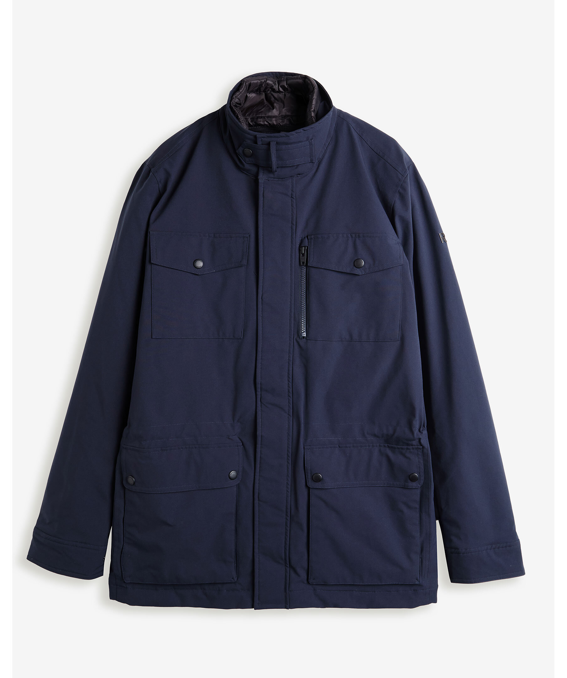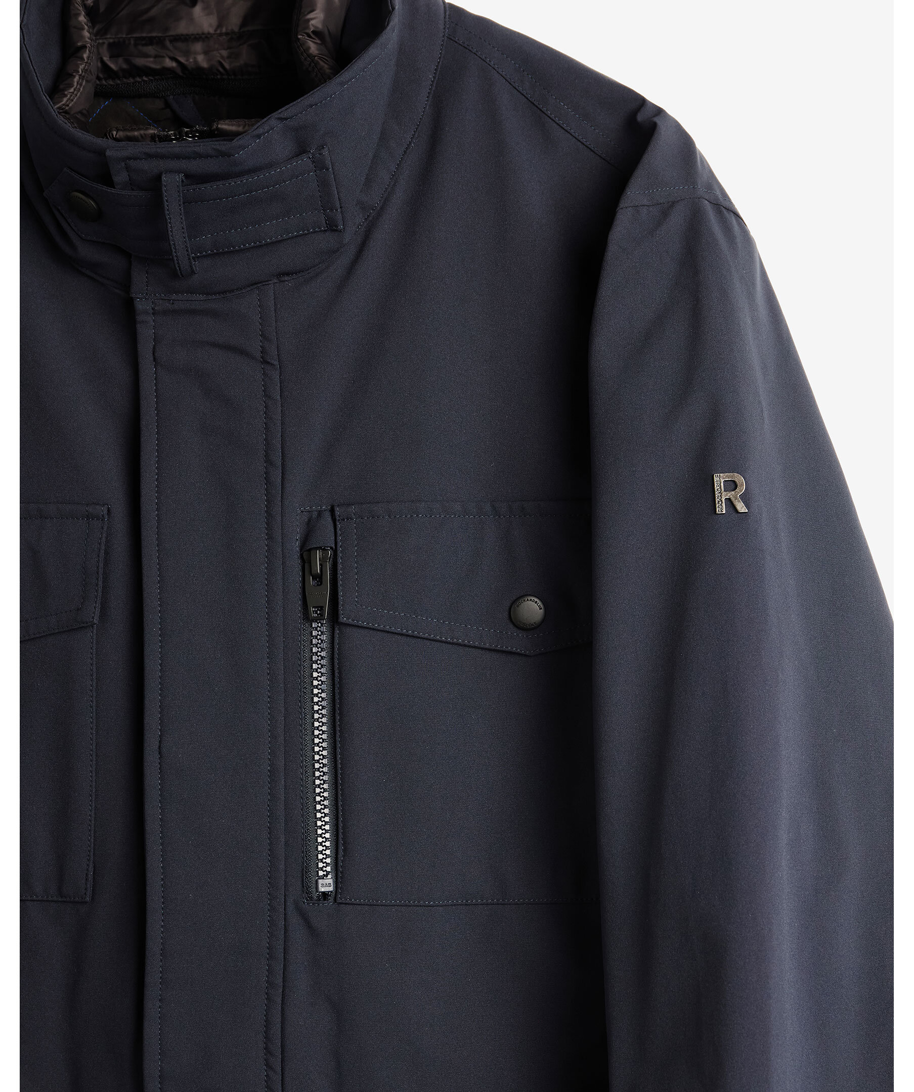 Marinblå vadderad jacka från Rockandblue. Jackan är utformad i en normal passform och har en dold dragkedja och avtagbar krage som ger flexibilitet beroende på väder. Jackan har ett flertal praktiska fickor. Den är vindtät, andas och klarar en vattenpelare på 3 000 mm, vilket gör den till ett pålitligt val för skiftande väderförhållanden. Detaljer som tryckknapp vid ärmslut ger extra kontroll och komfort.