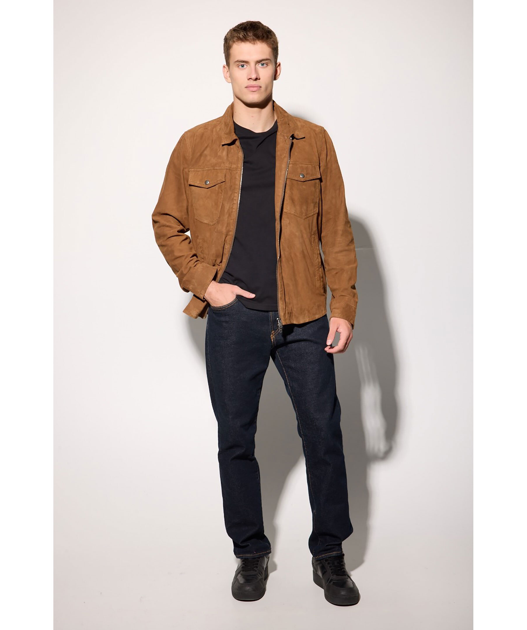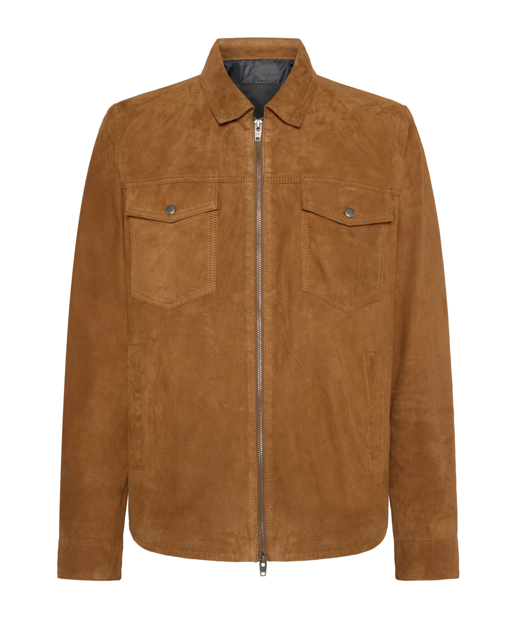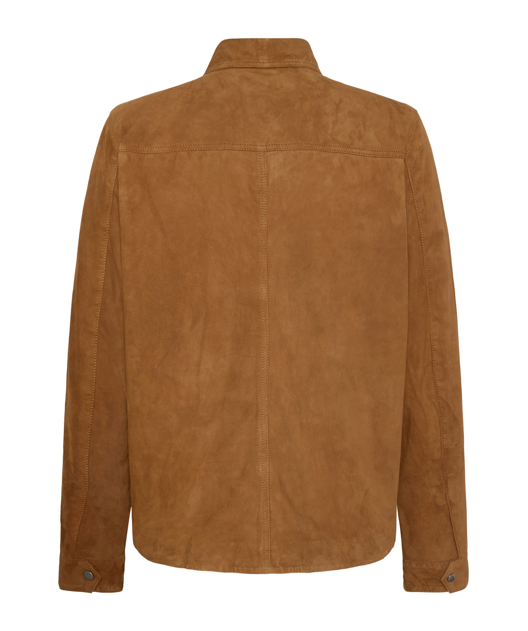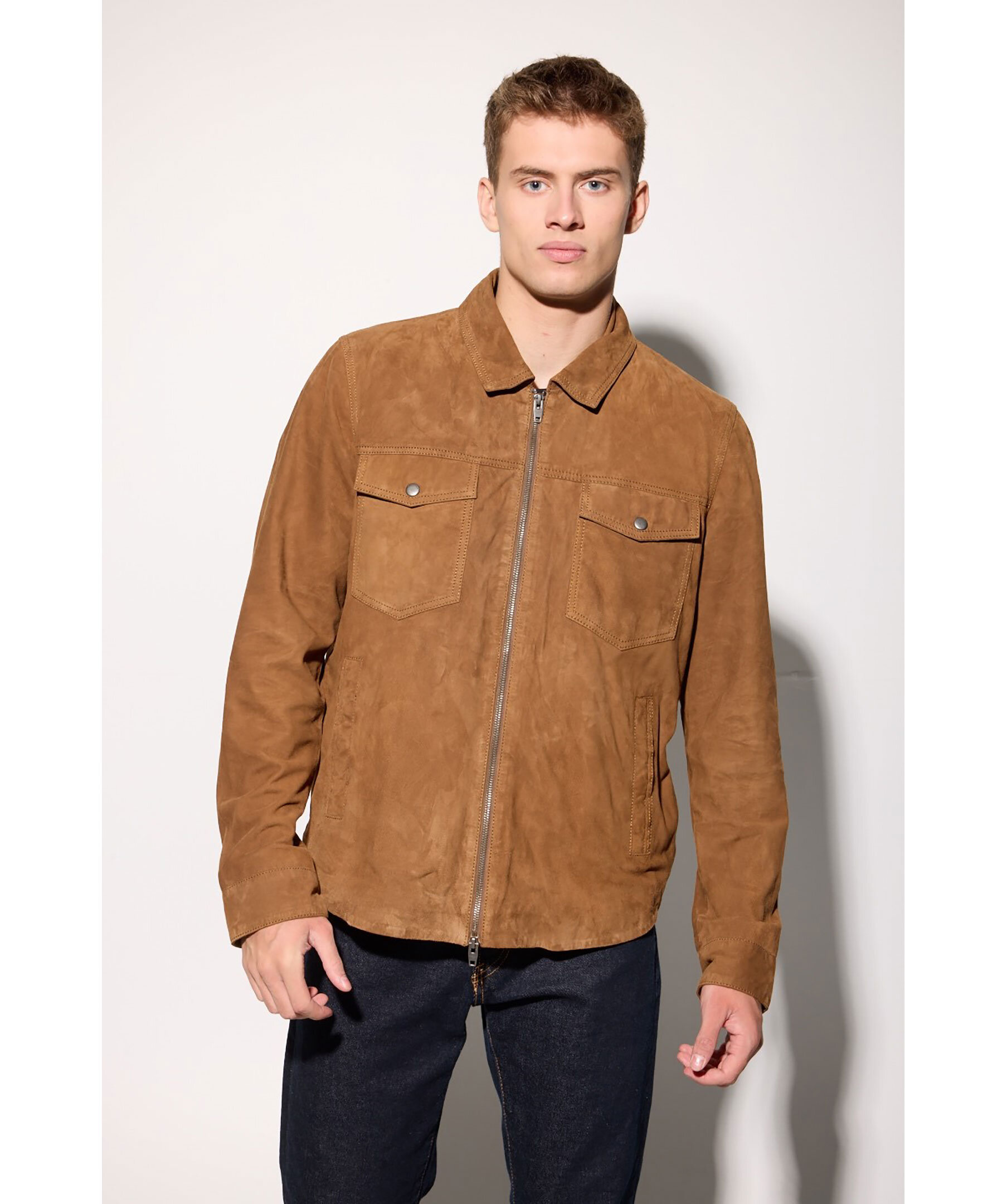 Konjakfärgad overshirt i mocka från Rockandblue. Jackan stängs med tvåvägsdragkedja och har en stilren skjortkrage, två bröstfickor med lock och knapp, två sidfickor samt två innerfickor med dragkedja. Tillverkad i getskinn.