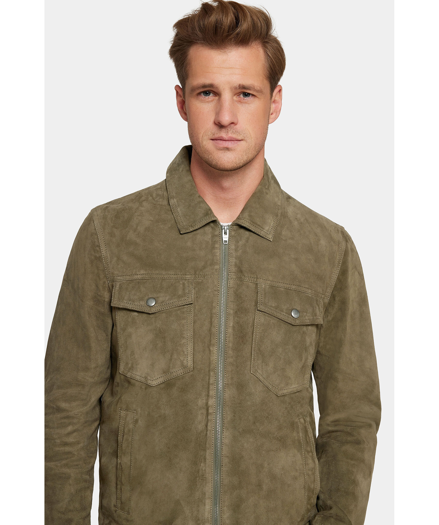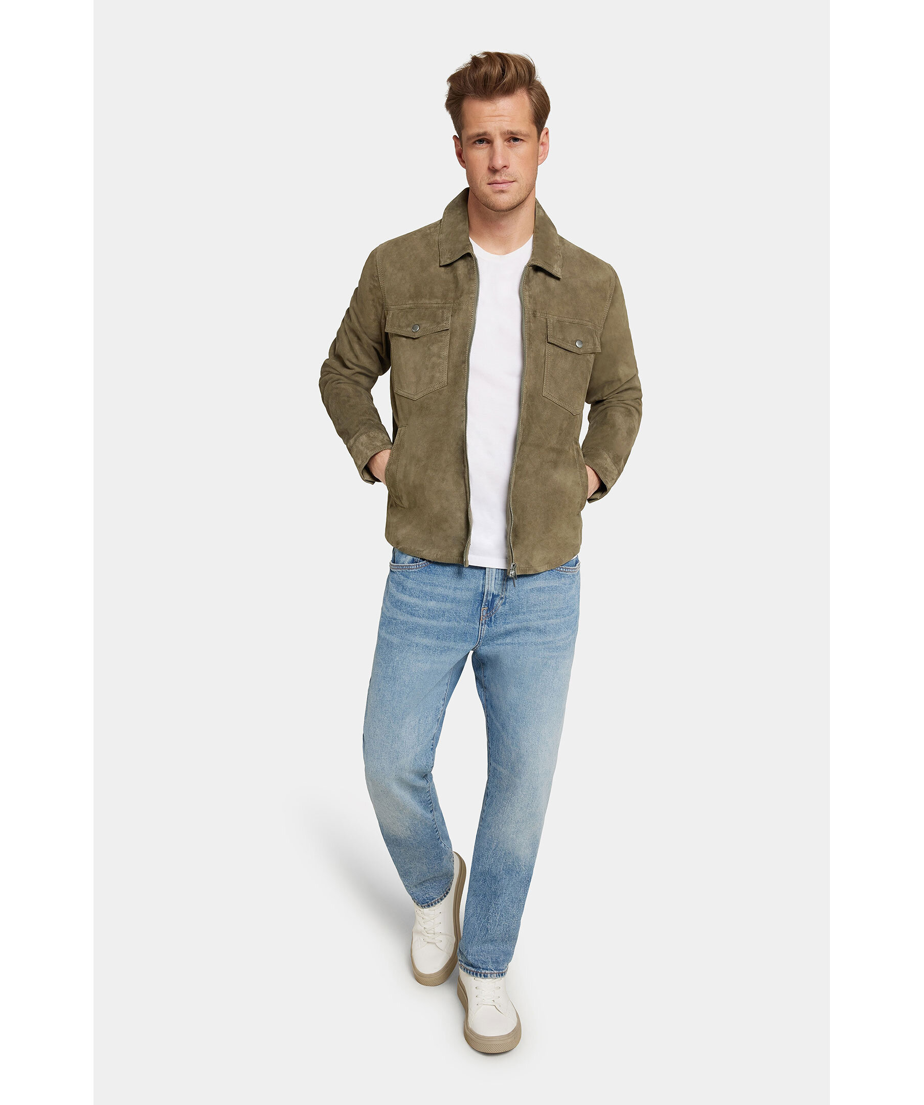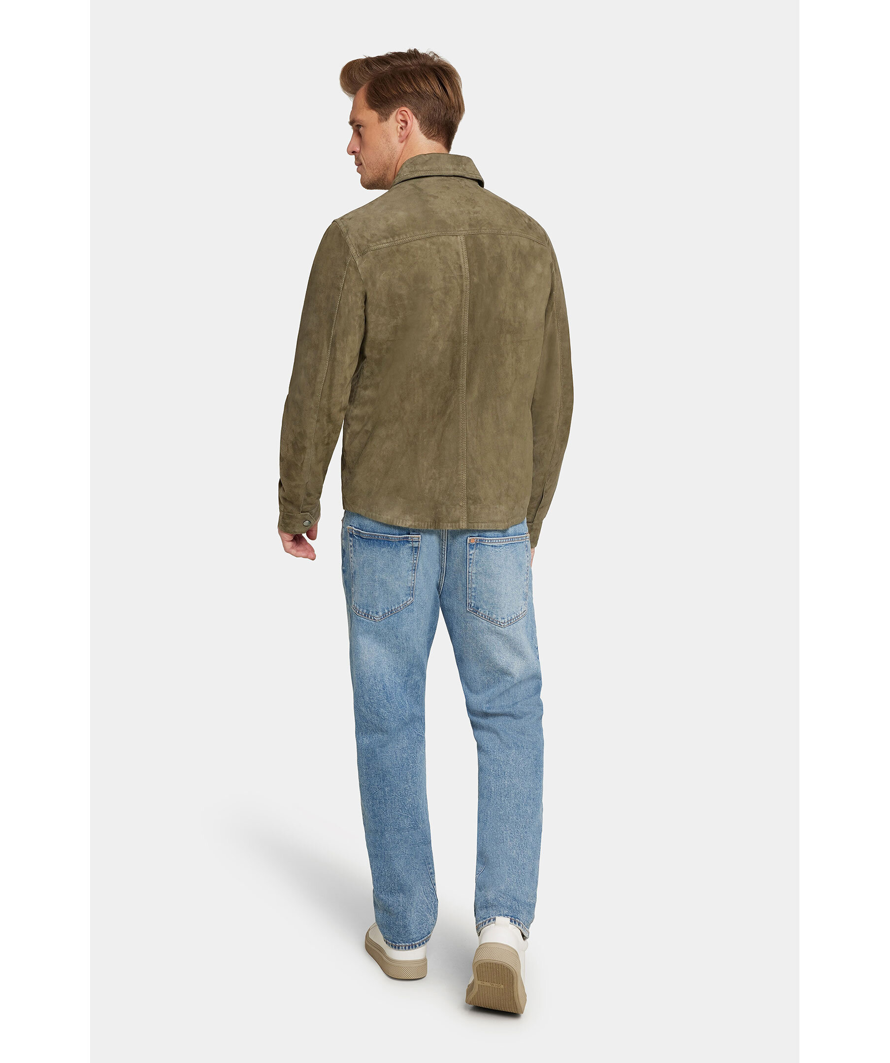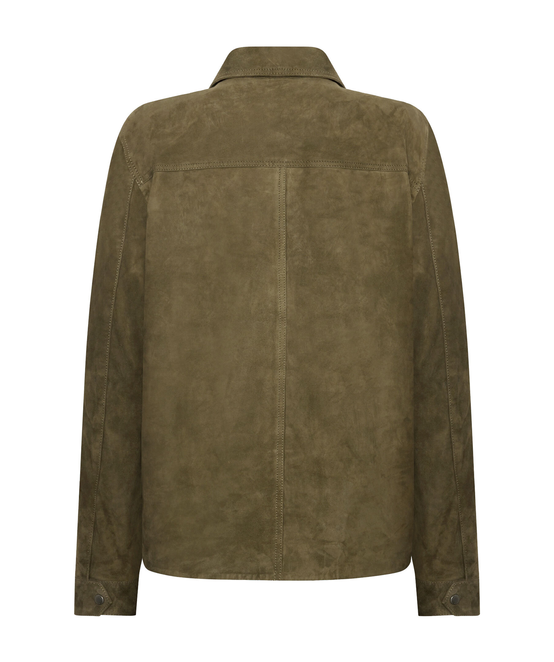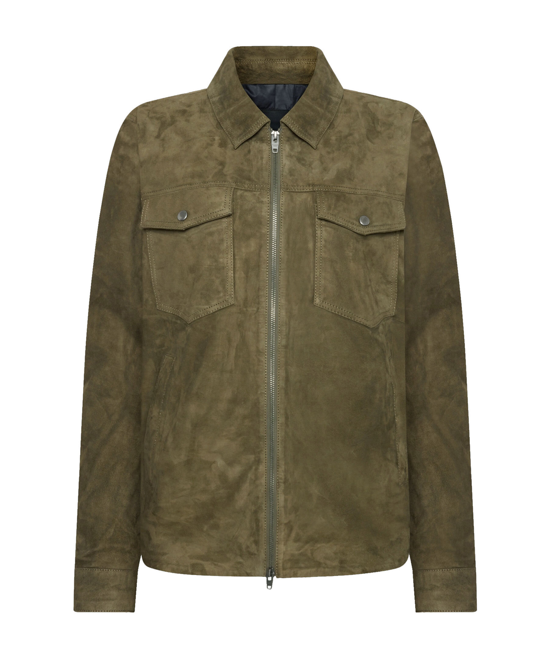 Olivgrön overshirt i mocka från Rockandblue. Jackan stängs med tvåvägsdragkedja och har en stilren skjortkrage, två bröstfickor med lock och knapp, två sidfickor samt två innerfickor med dragkedja. Tillverkad i getskinn.