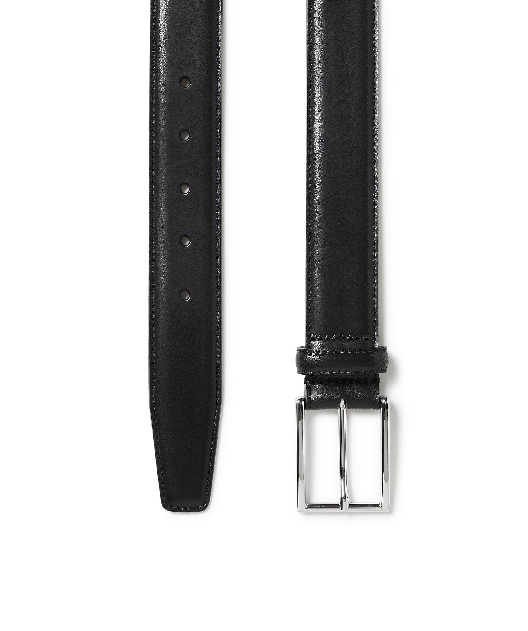 Svart läderbälte från Saddler i vegetabiliskt garvat full grain-läder med en naturligt blank finish. Bältet har en lätt bomberad fyllning och är detaljerad med snygga stickningar. Spänne i blank silverfärgad metall. Bältet i storlek 105 till 120, är konstruerad med en skruv som gör det möjligt att korta ner och anpassa storleken på bältet. Mått: B: 3.5cm.