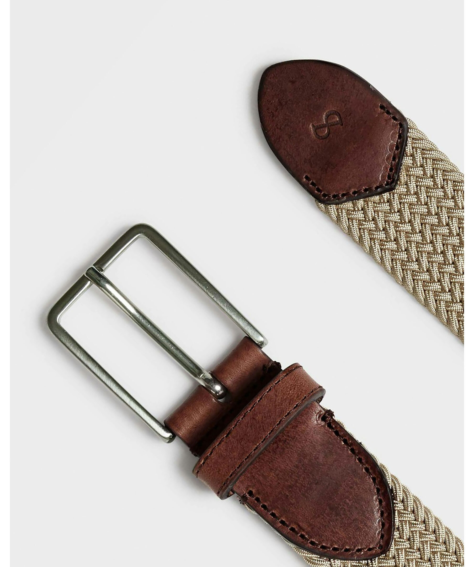 Beigt, flätat skärp från Saddler. Detaljer i brunt läder. Stilrent spänne i borstad metall. Skärpets bredd är 3.5 cm.