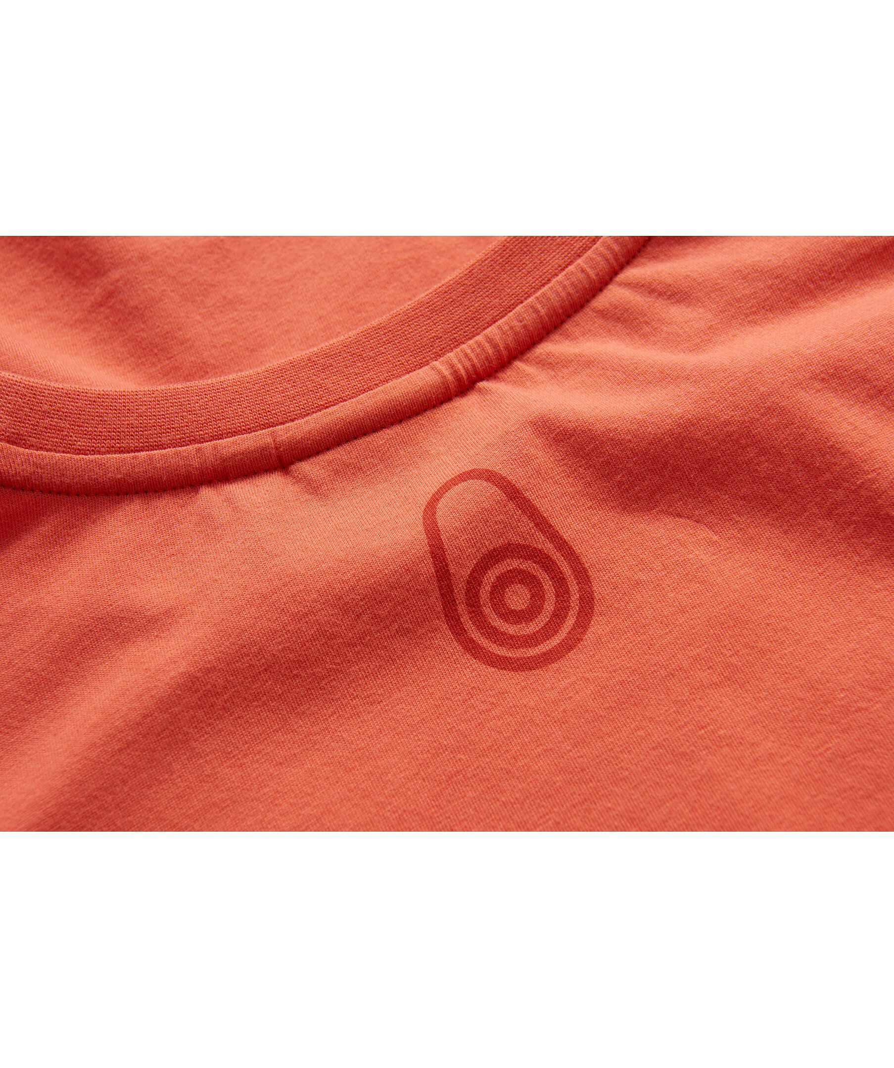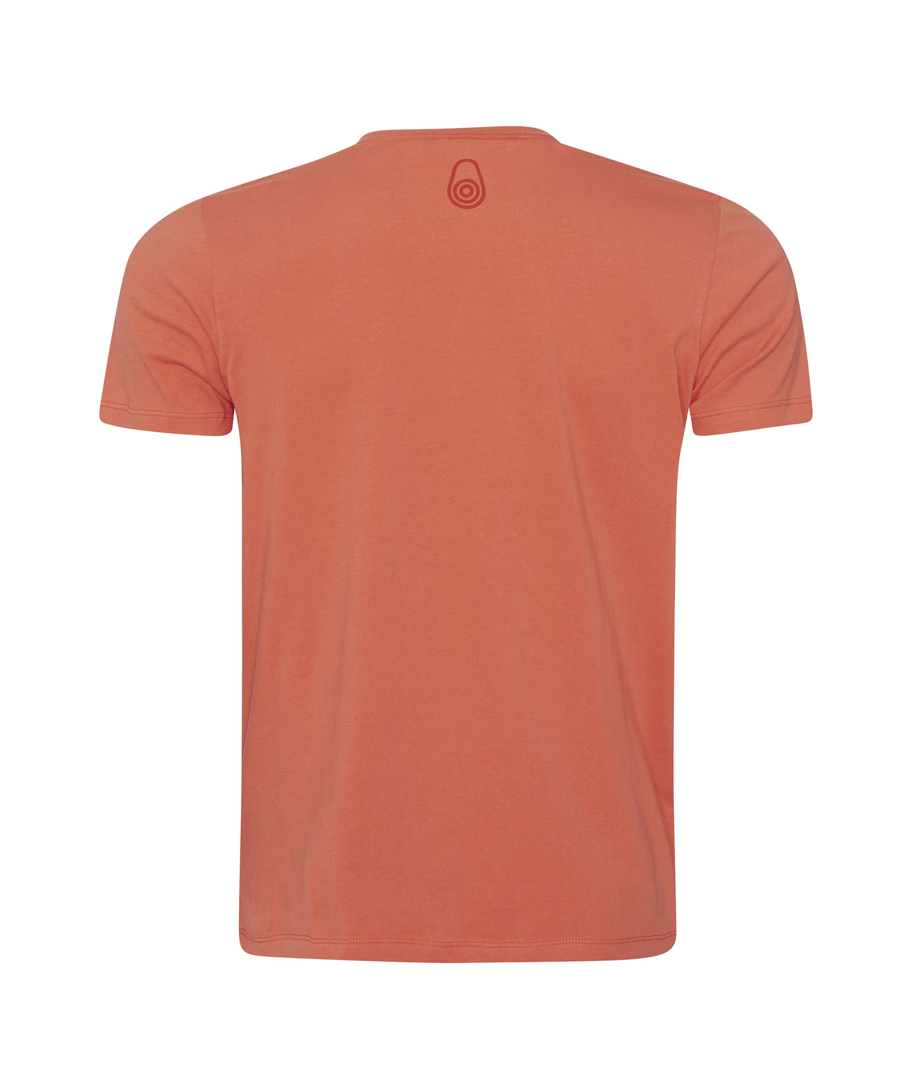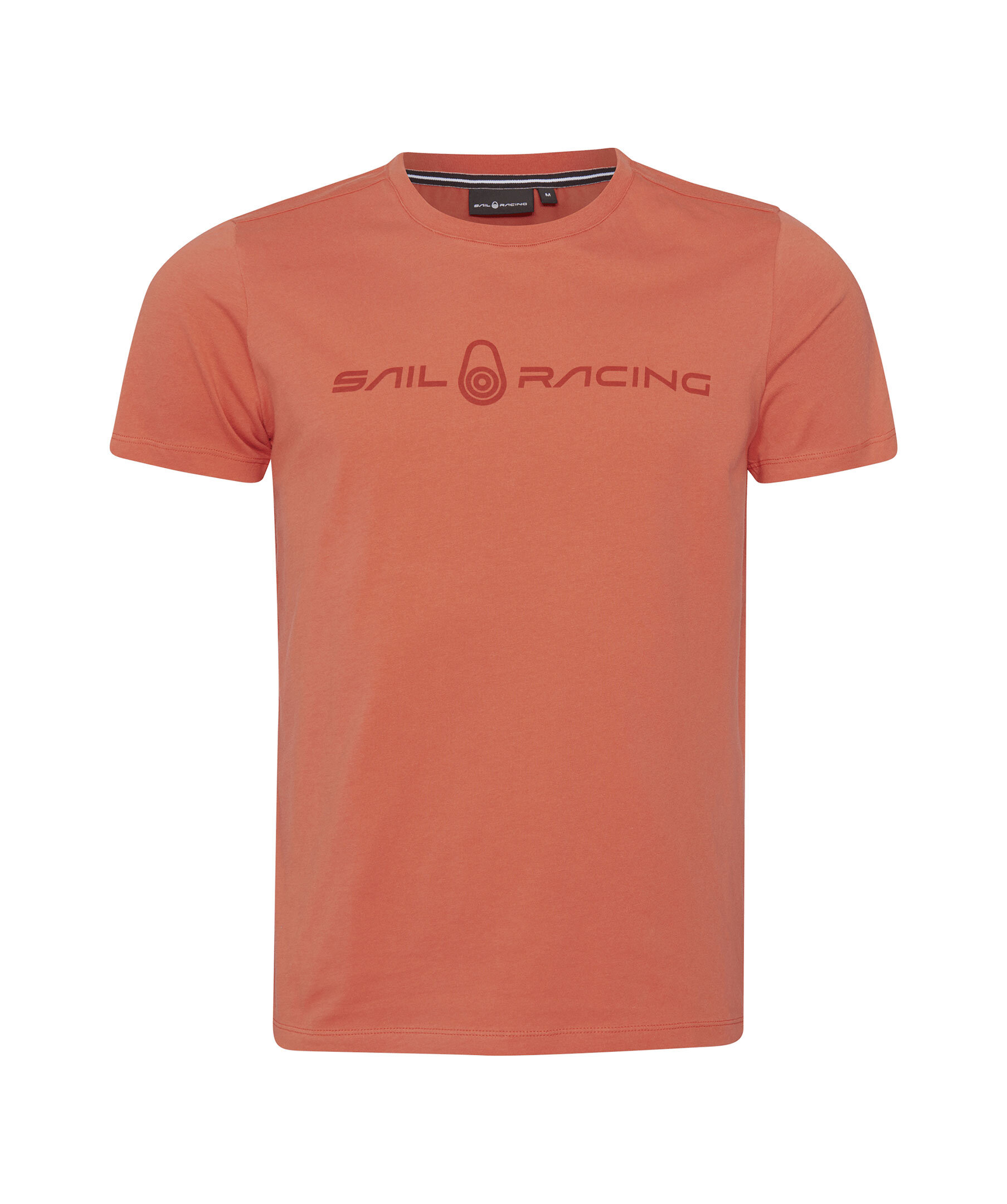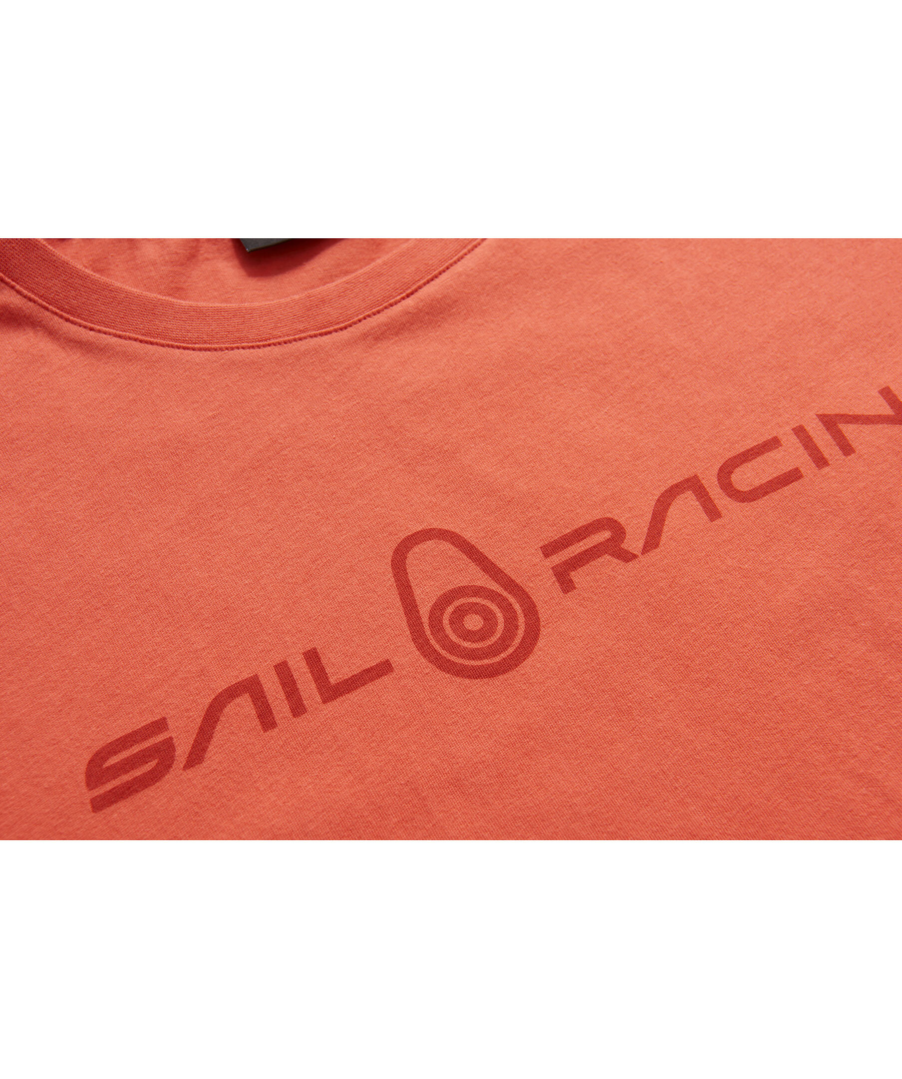 Korallröd t-shirt från Sail Racing med stor tryckt logotyp på bröstet och en blocklogga i nacken. Rundad halsringning och normal passform. Tillverkad i bomull.