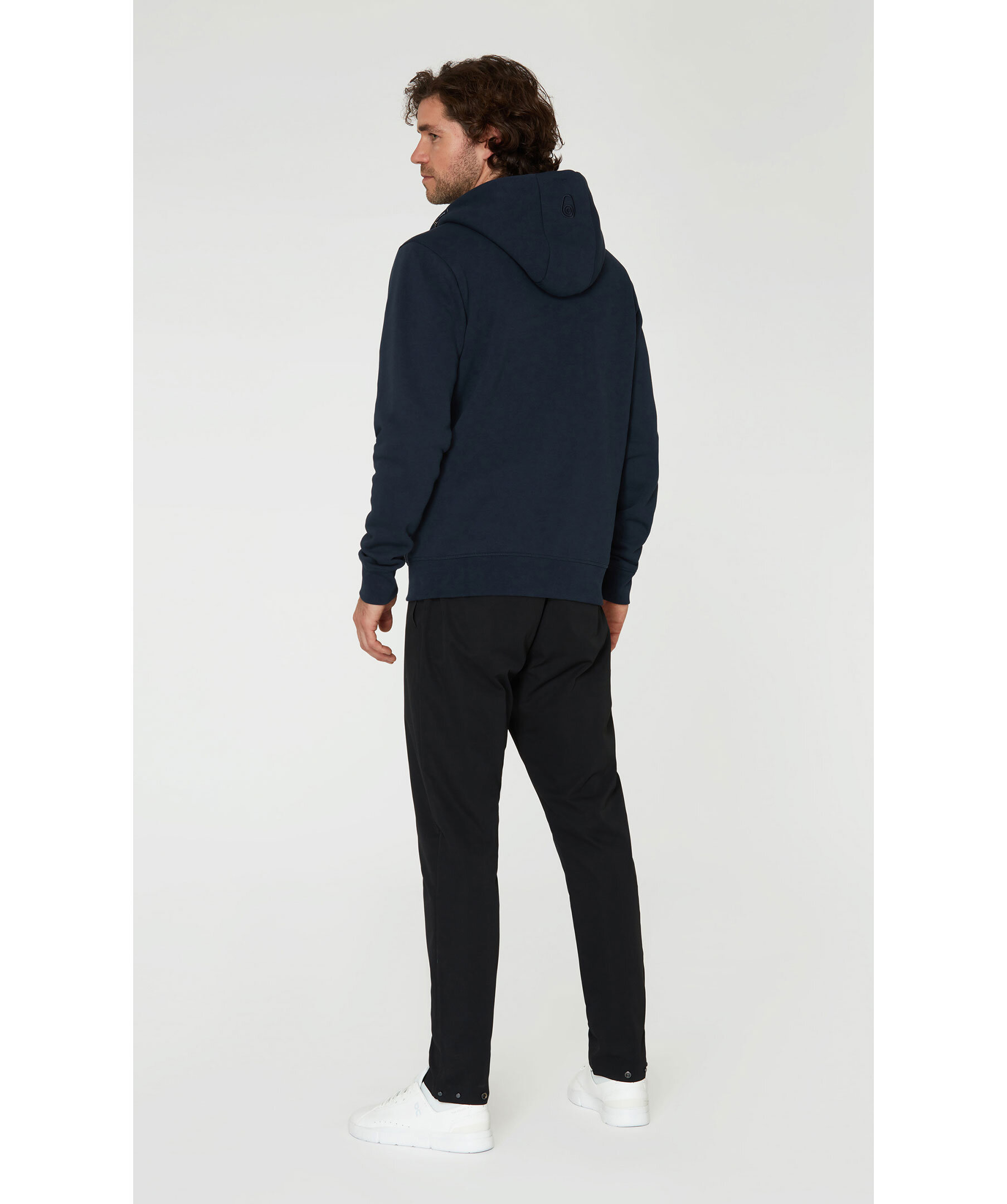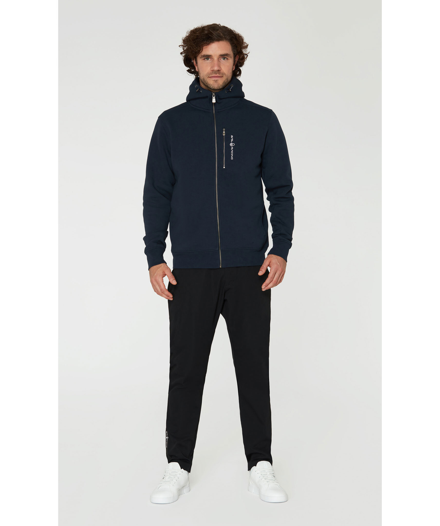 Marinblå hoodie med dragkedja hela vägen fram från Sail Racing. Ficka med dragkedja och logotyp på bröstet ovanpå fickan och på luvan, fickor i sidorna och muddar i ärmslut och plaggslut. Dragsko i luvan och fickor i sidorna.