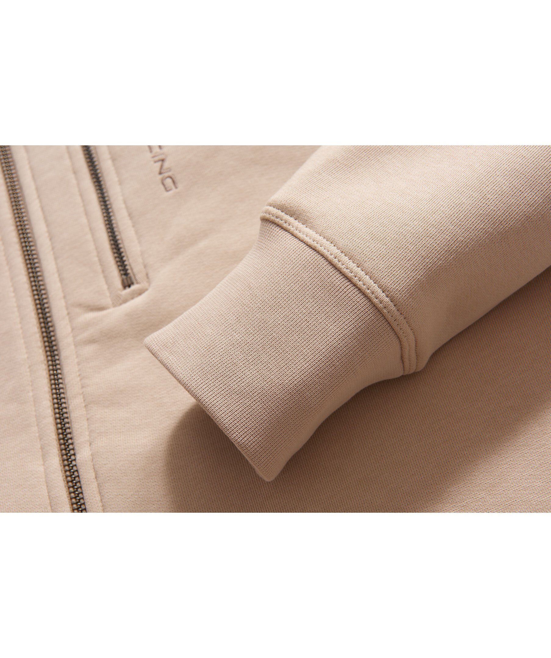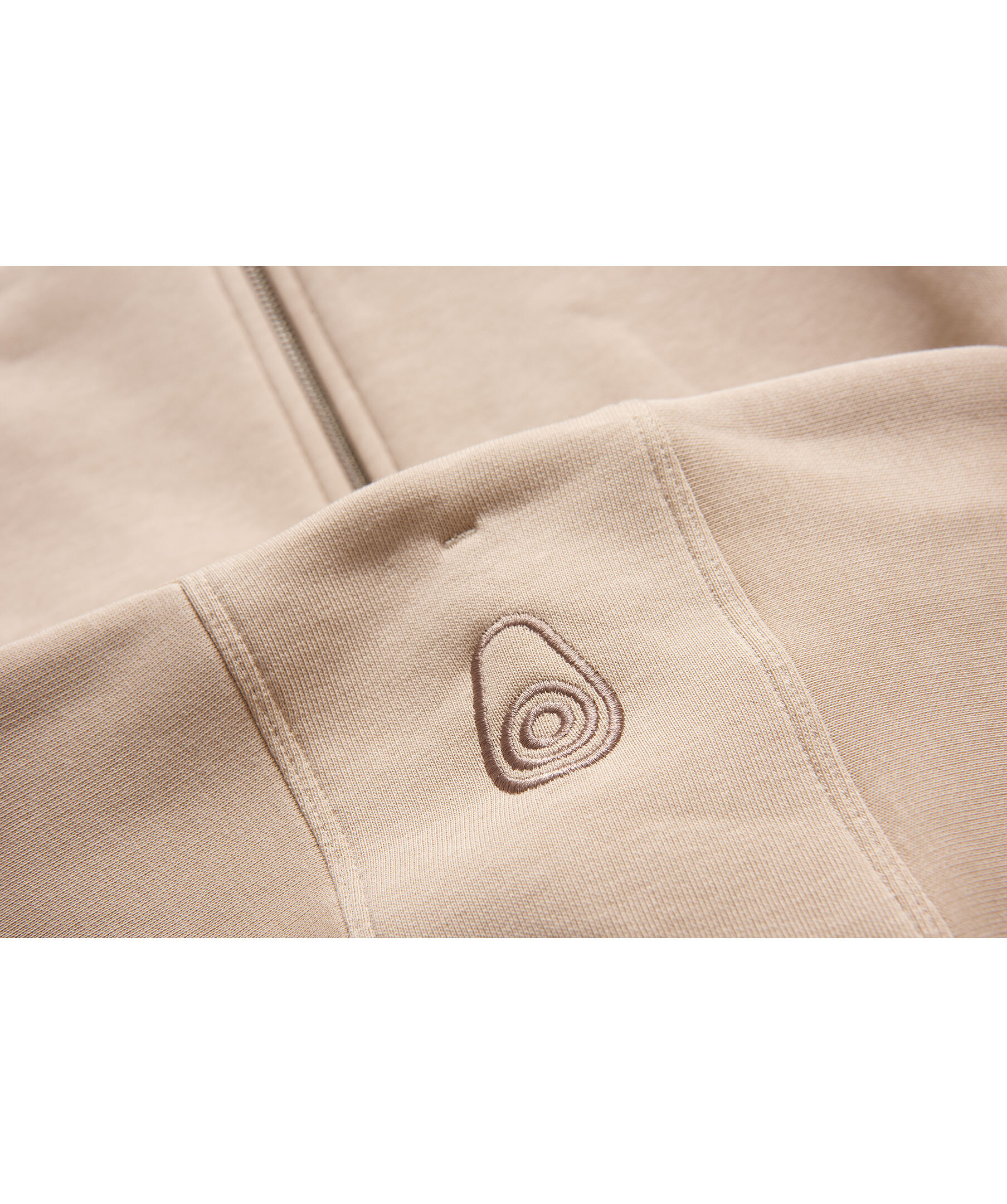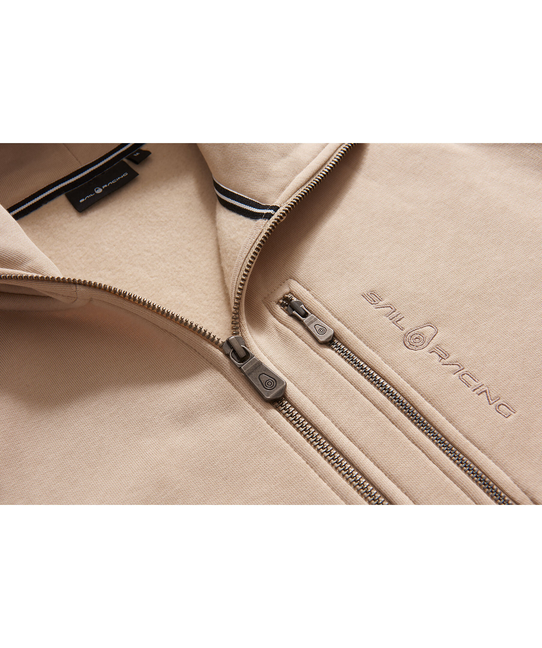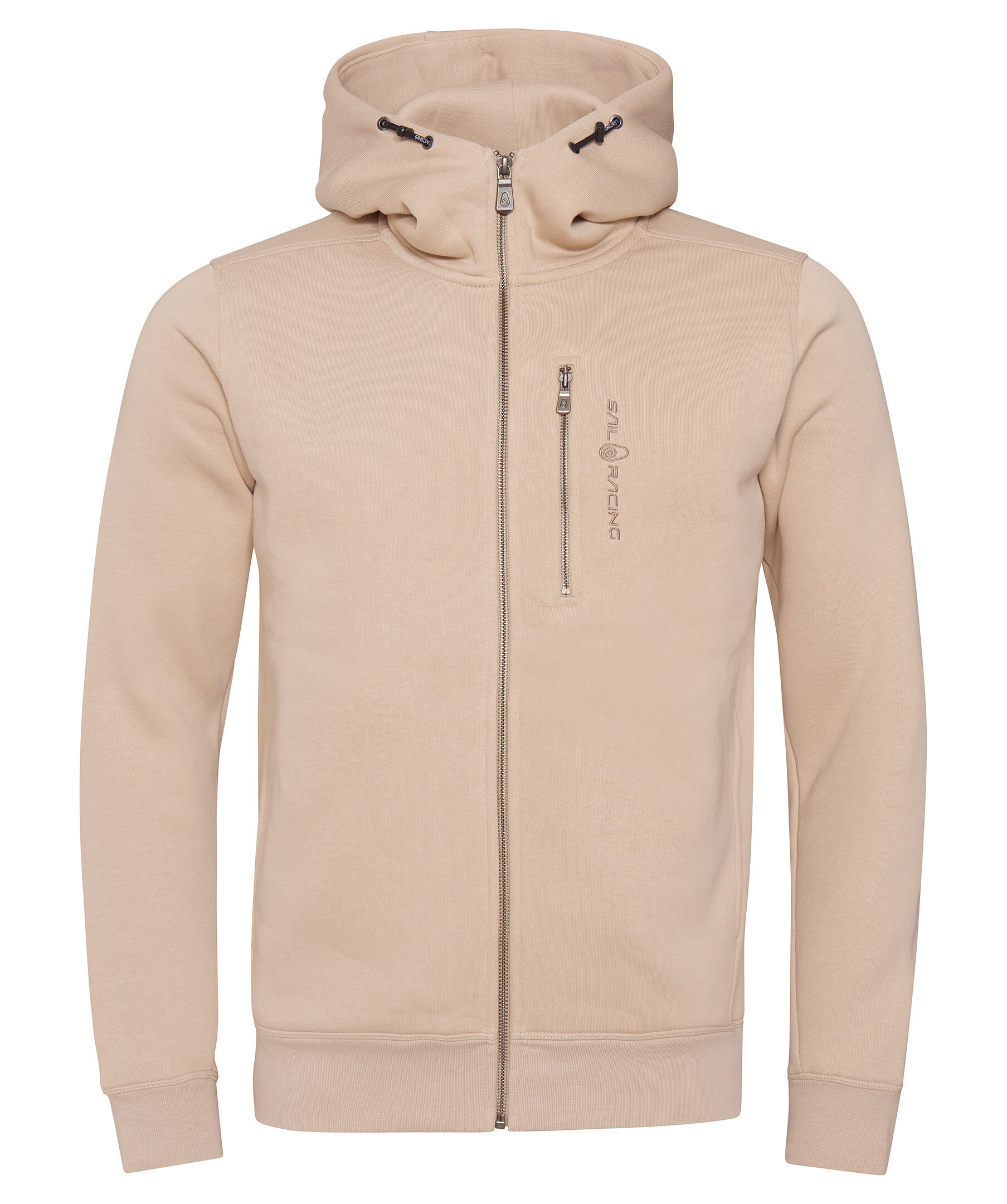 Ljusbeige hoodie med dragkedja från Sail Racing. Ficka med dragkedja och logotyp på bröstet, fickor i sidorna och muddar i ärmslut och plaggslut. Dragsko i luvan och hög krage.