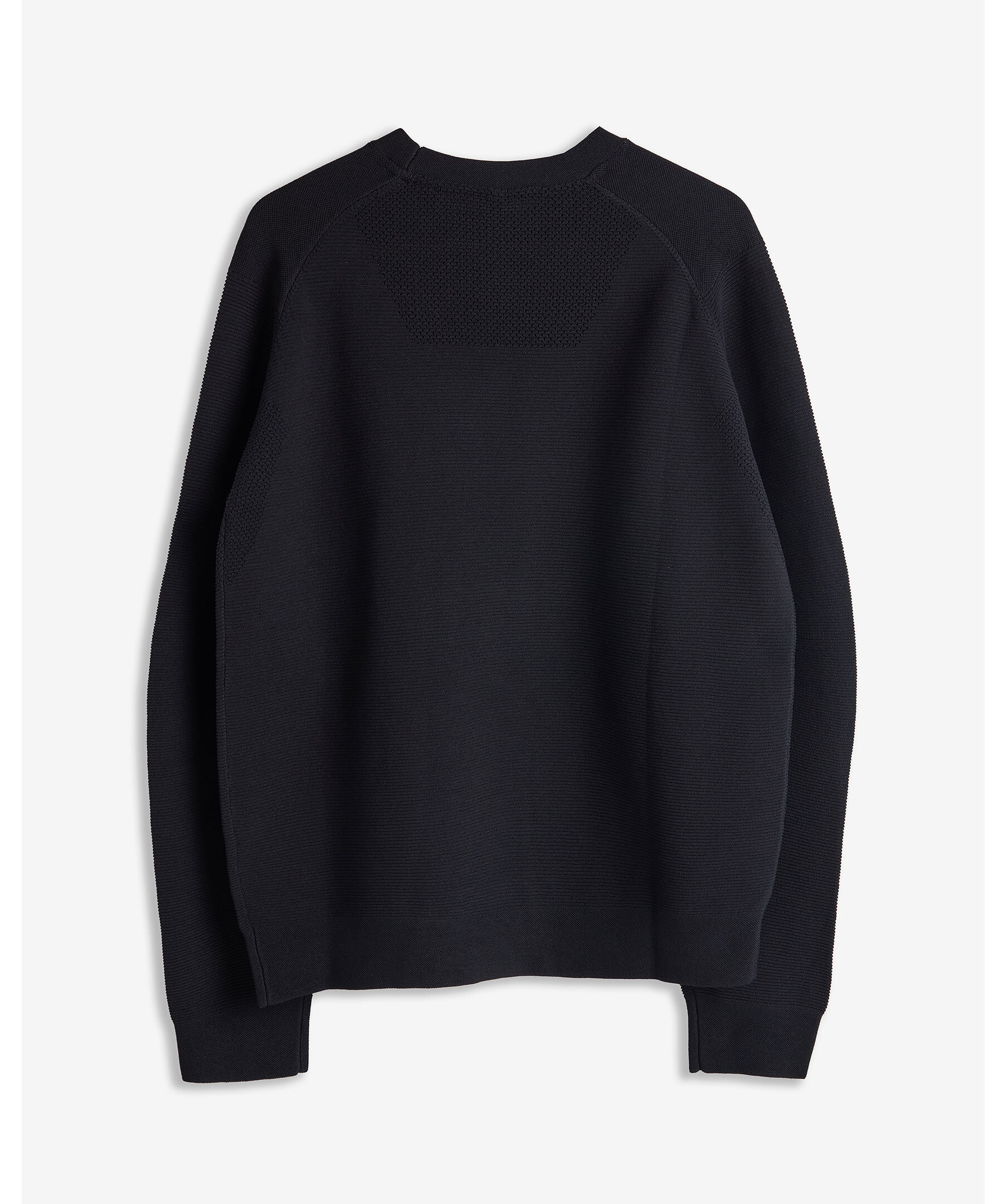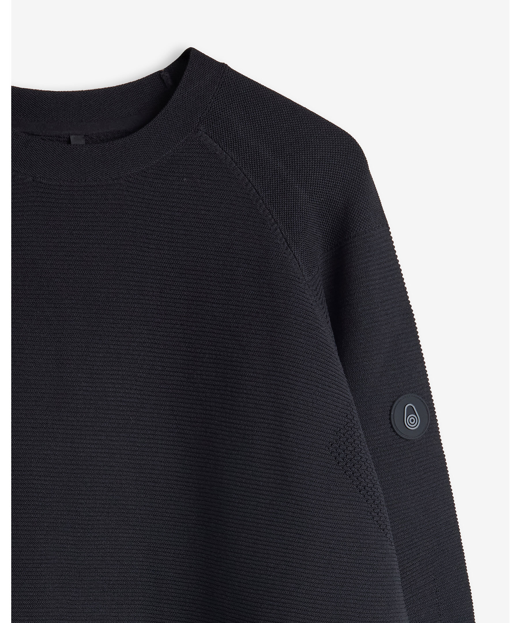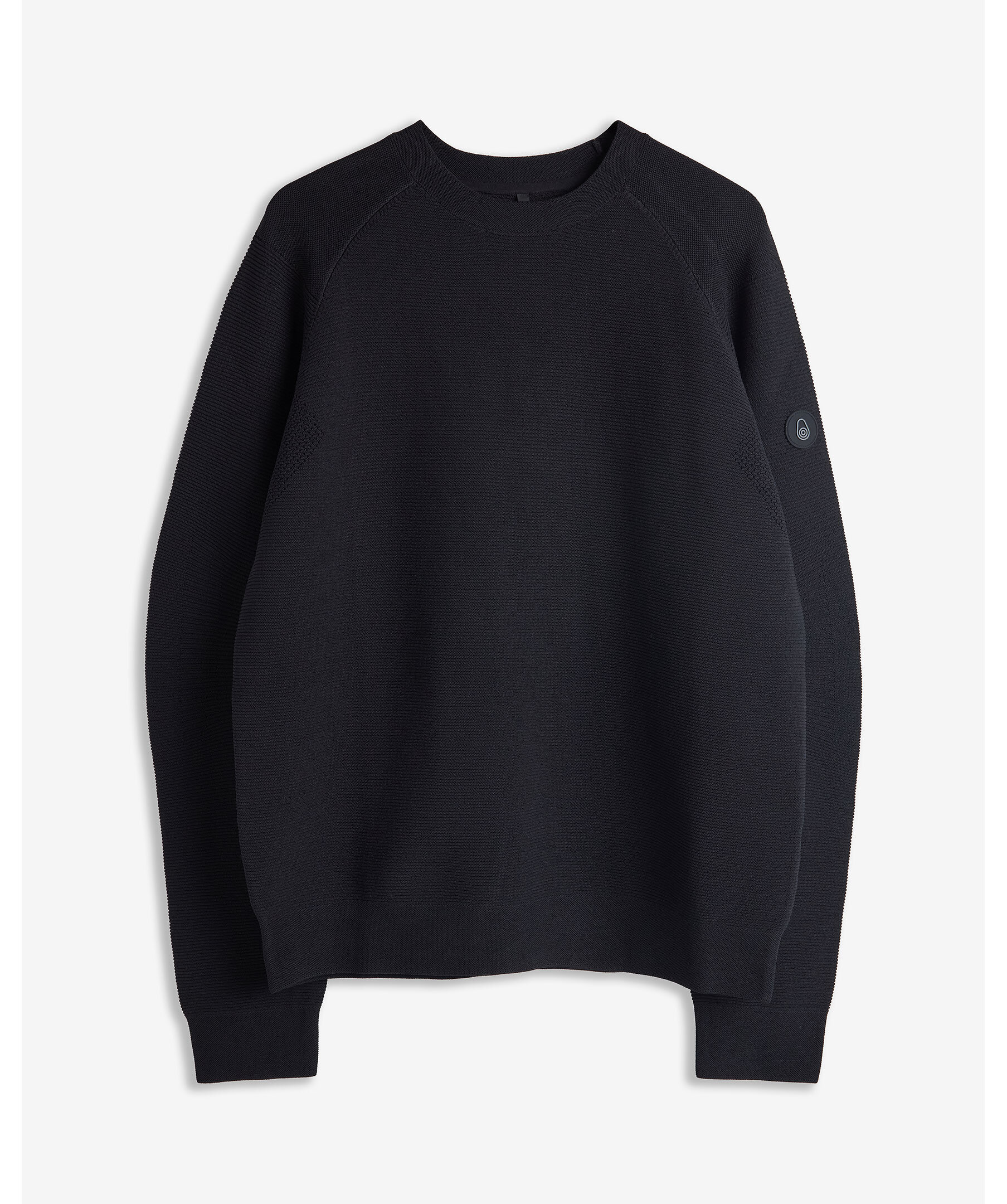 Svart, stickad crewneck från Sail Racing. Tröjan har rund halsringning, Sail Racing block-logotyp på vänster ärm samt är designad med flera olika stickningsstrukturer på ärmar, axlar och rygg. Tillverkad i polyester.