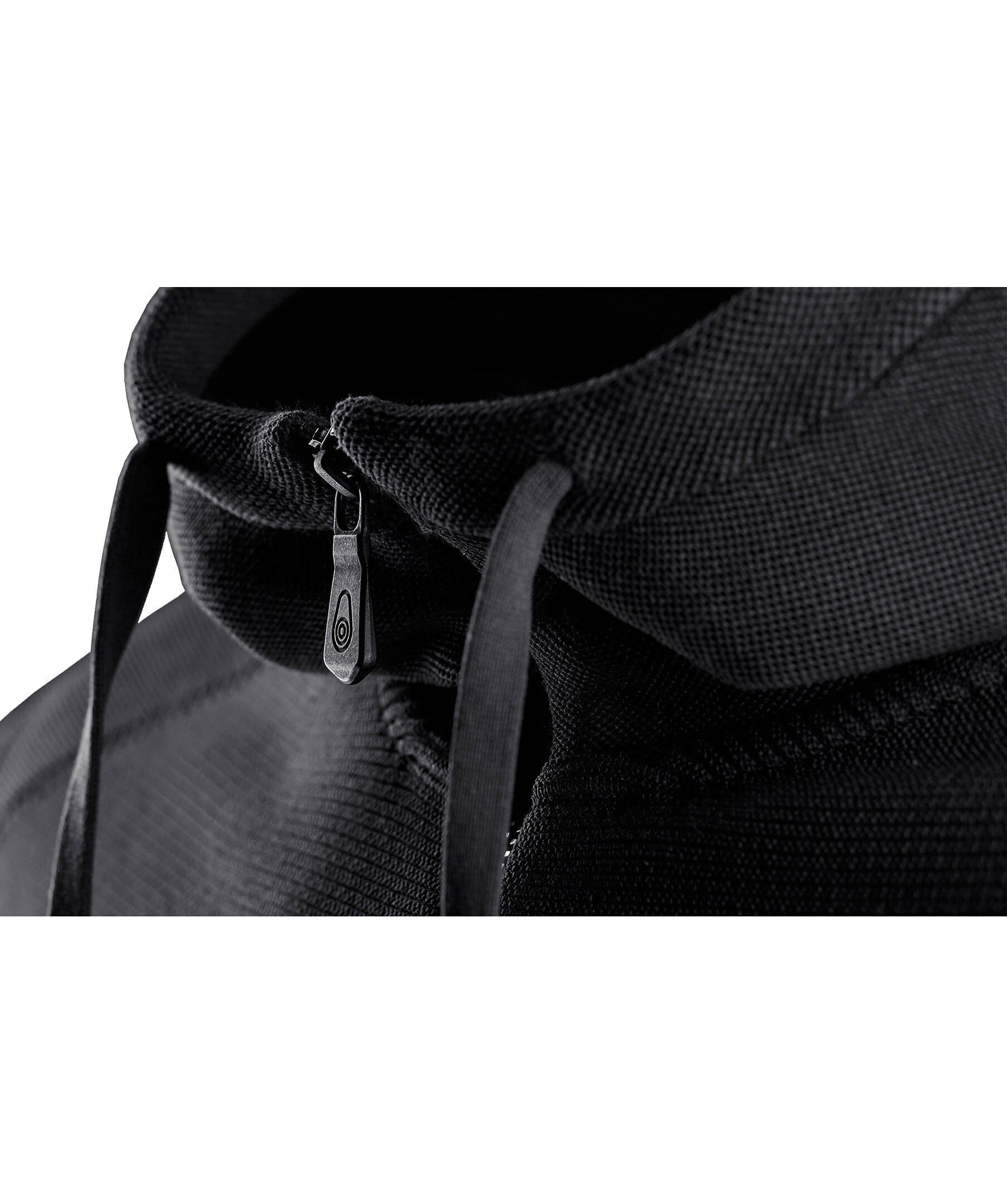 Svart, stickad zip-up tröja från Sail Racing. Tröjan stängs med dragkedja och har huva med dragsko, Sail Racing block-logotyp på vänster ärm samt är designad med flera olika stickningsstrukturer på ärmar, axlar och rygg. Tillverkad i polyester.