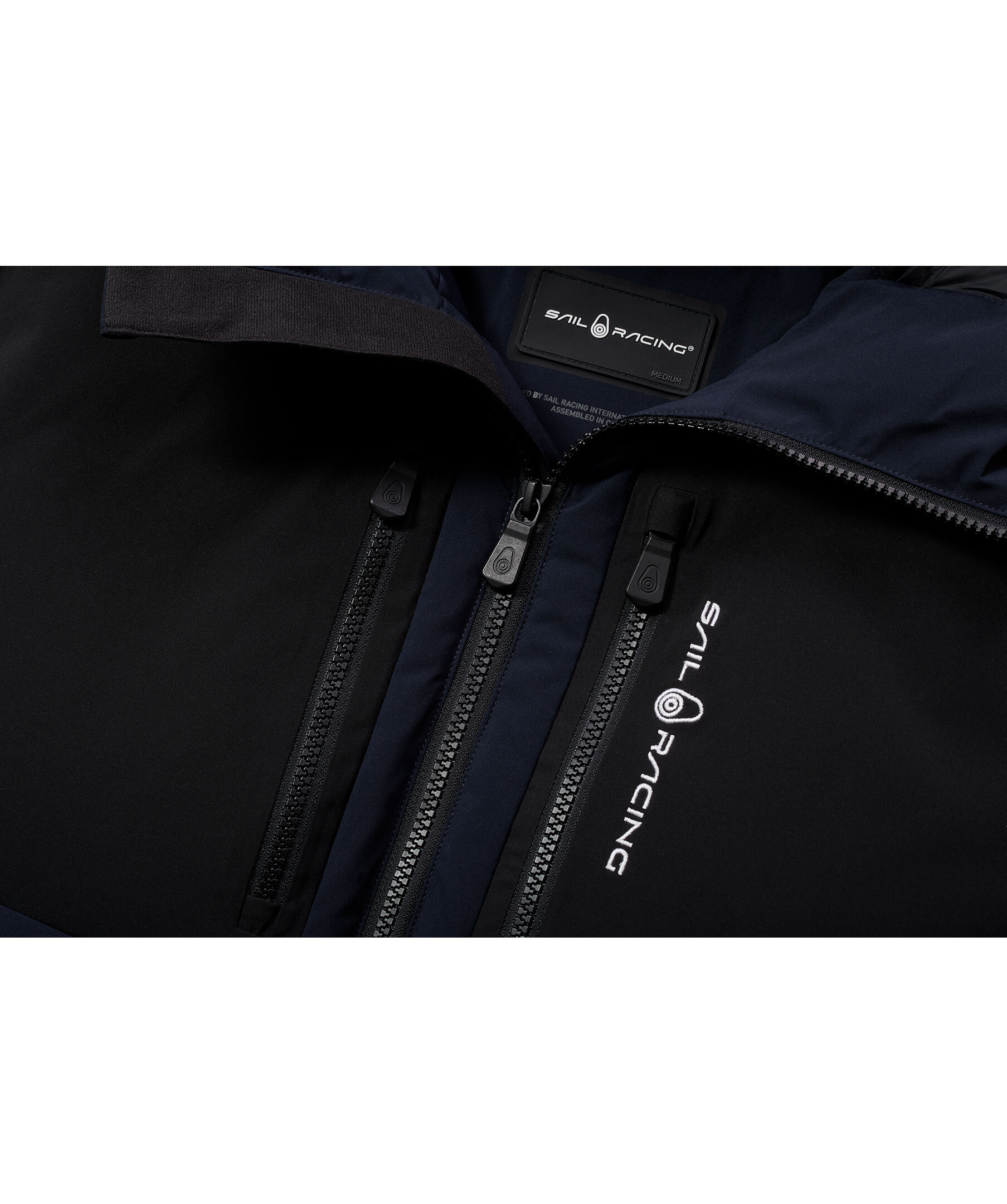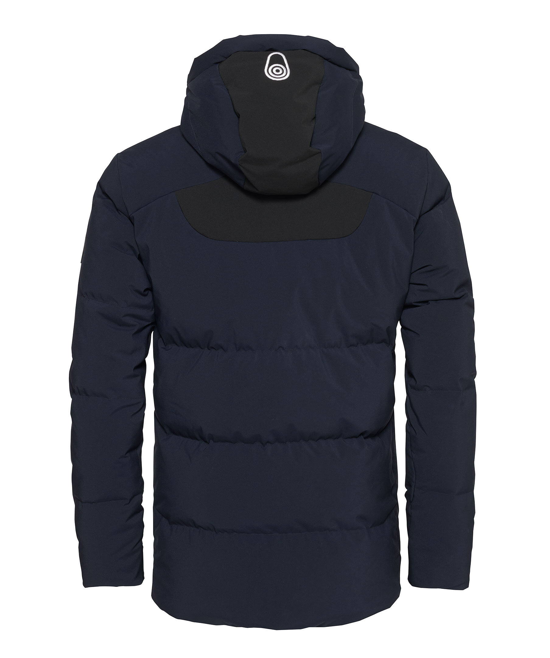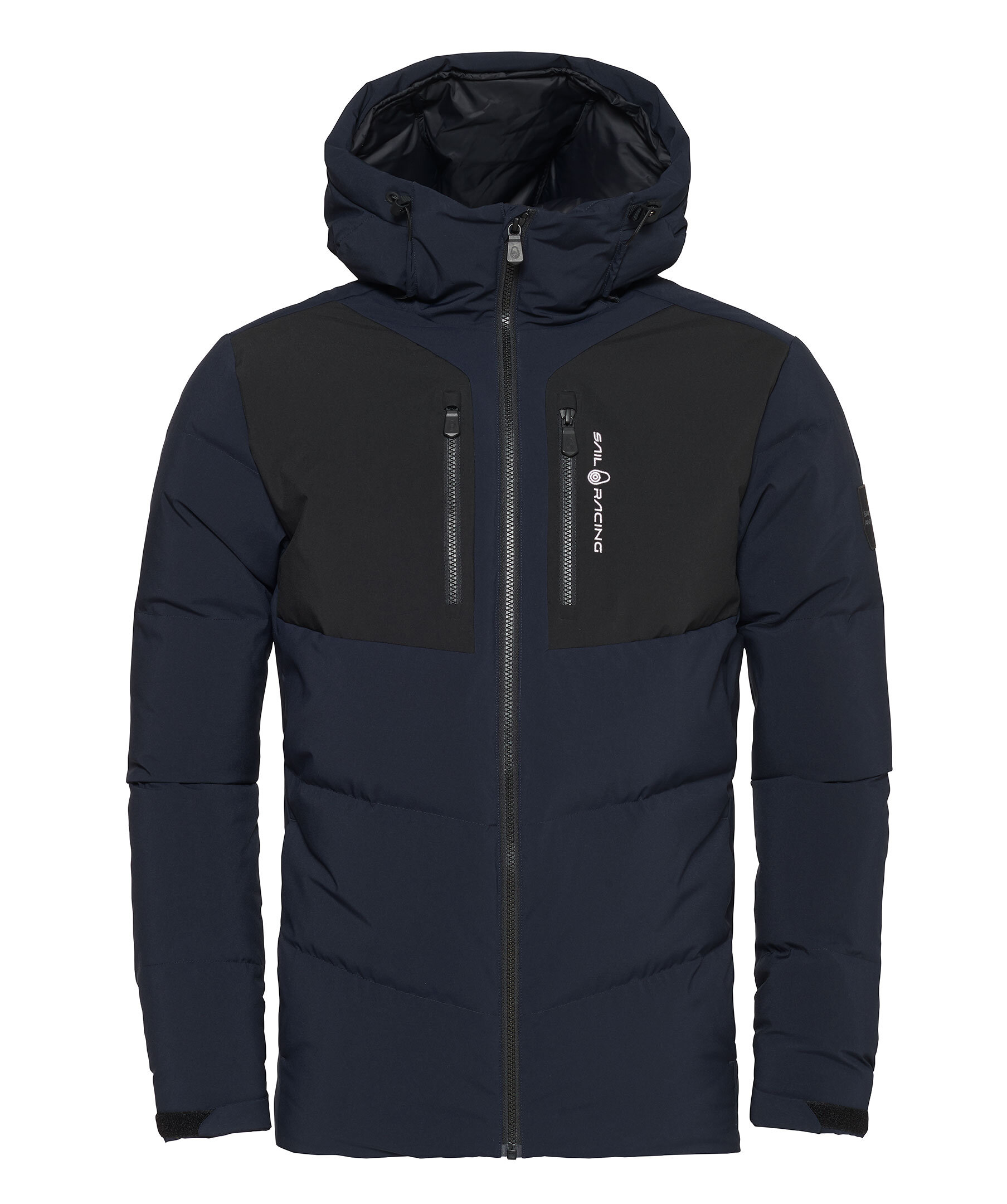 Marinblå dunjacka med svarta paneler fram och bak från Sail Racing. Grått foder. Två fickor på bröstet, broderad logotyp fram och på luvan, gummerad logga på vänster ärm. Vatten- och vindresistent.
