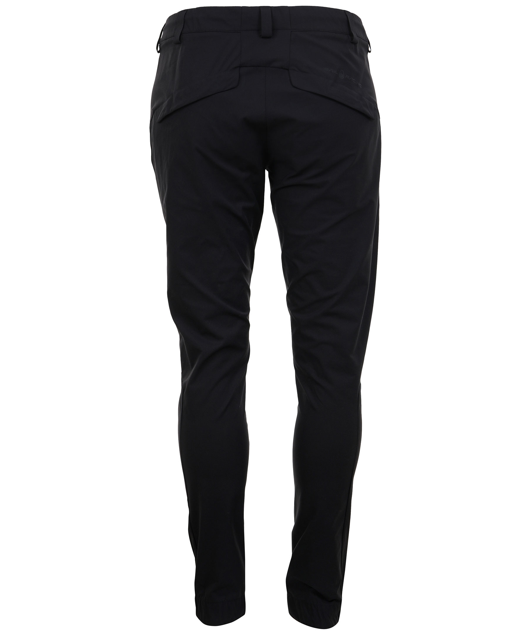 Svarta funktionsbyxor med mudd i midja och benslut från Sail Racing. Två snedställda framfickor och två bakfickor med ficklapp som stängs med kardborre. Grövre snörning i midjan, hällor för bälte samt mudd på benslut. Gylf med dragkedja och knapp. Logotyp som är ton i ton ovanför bakfickan. Tillverkade i tunnare material av polyester.