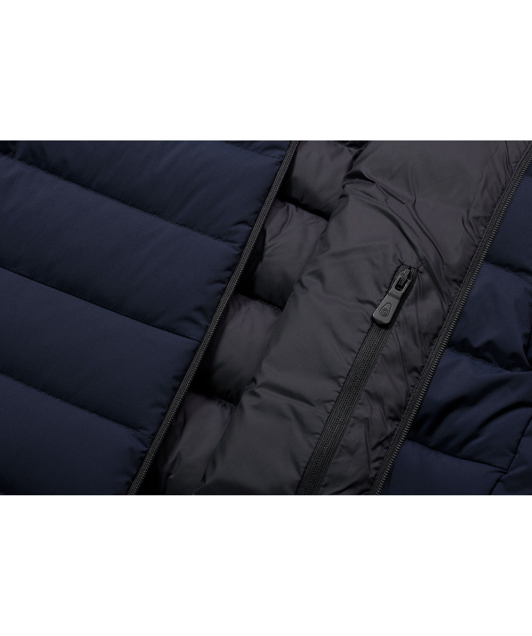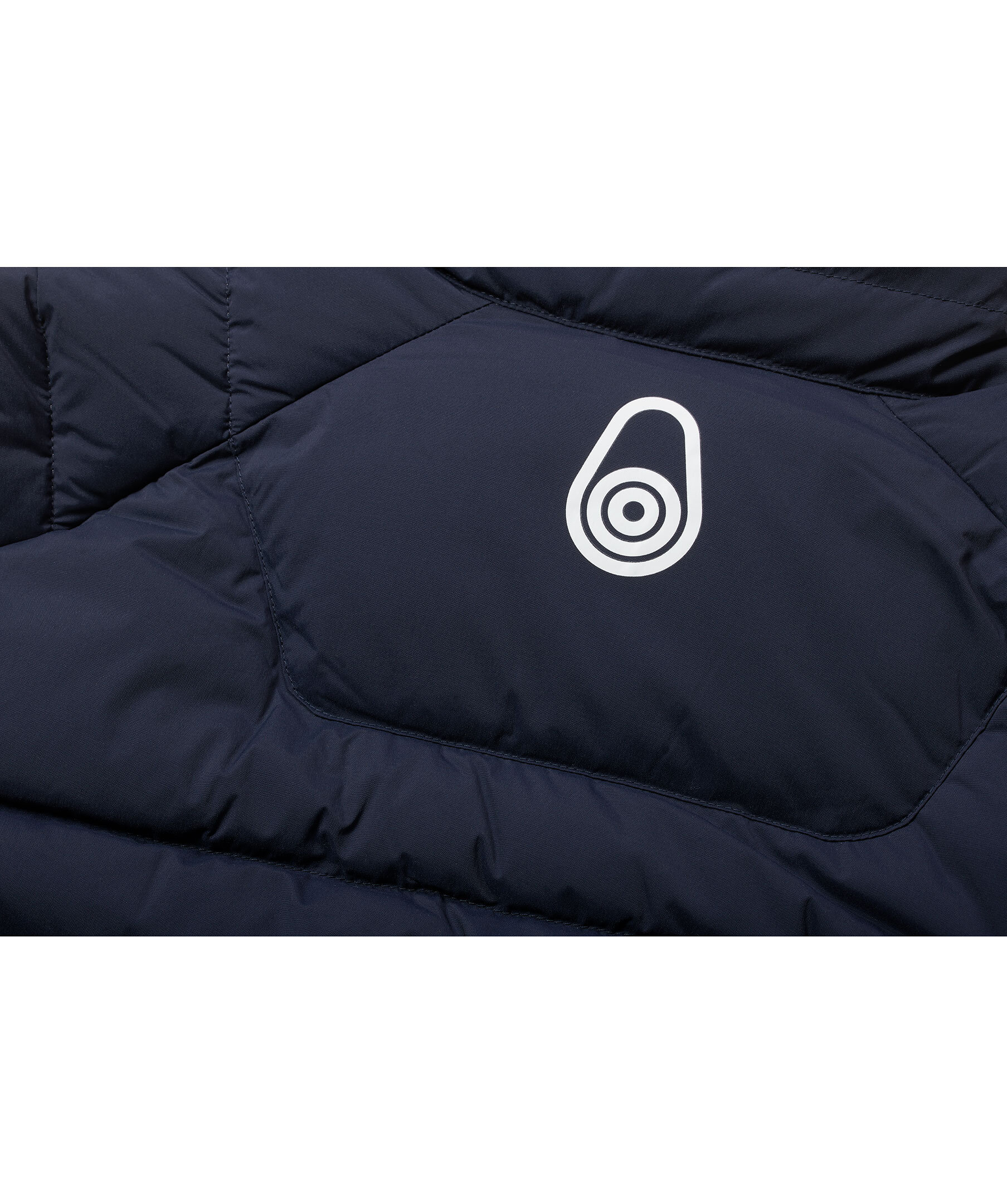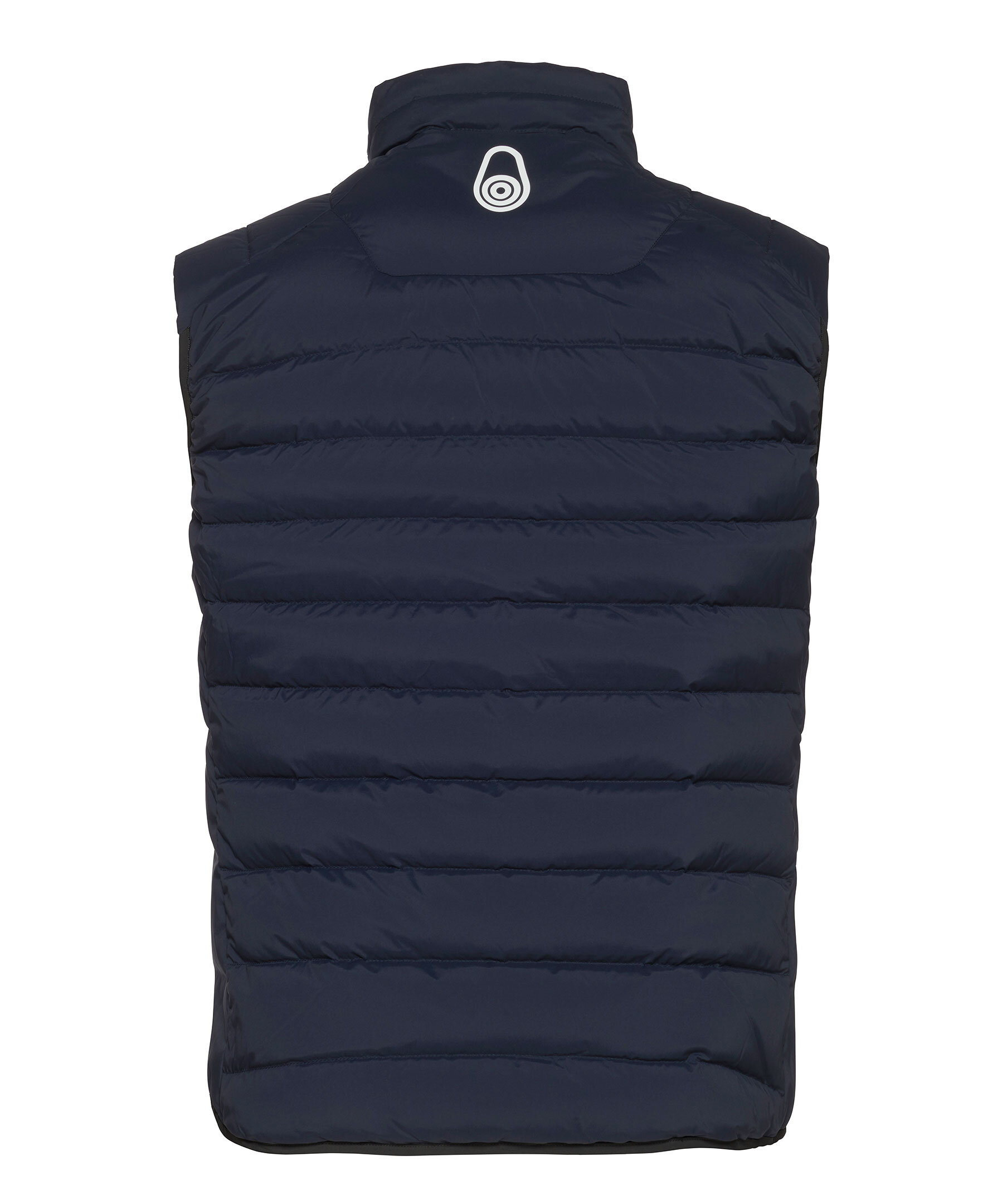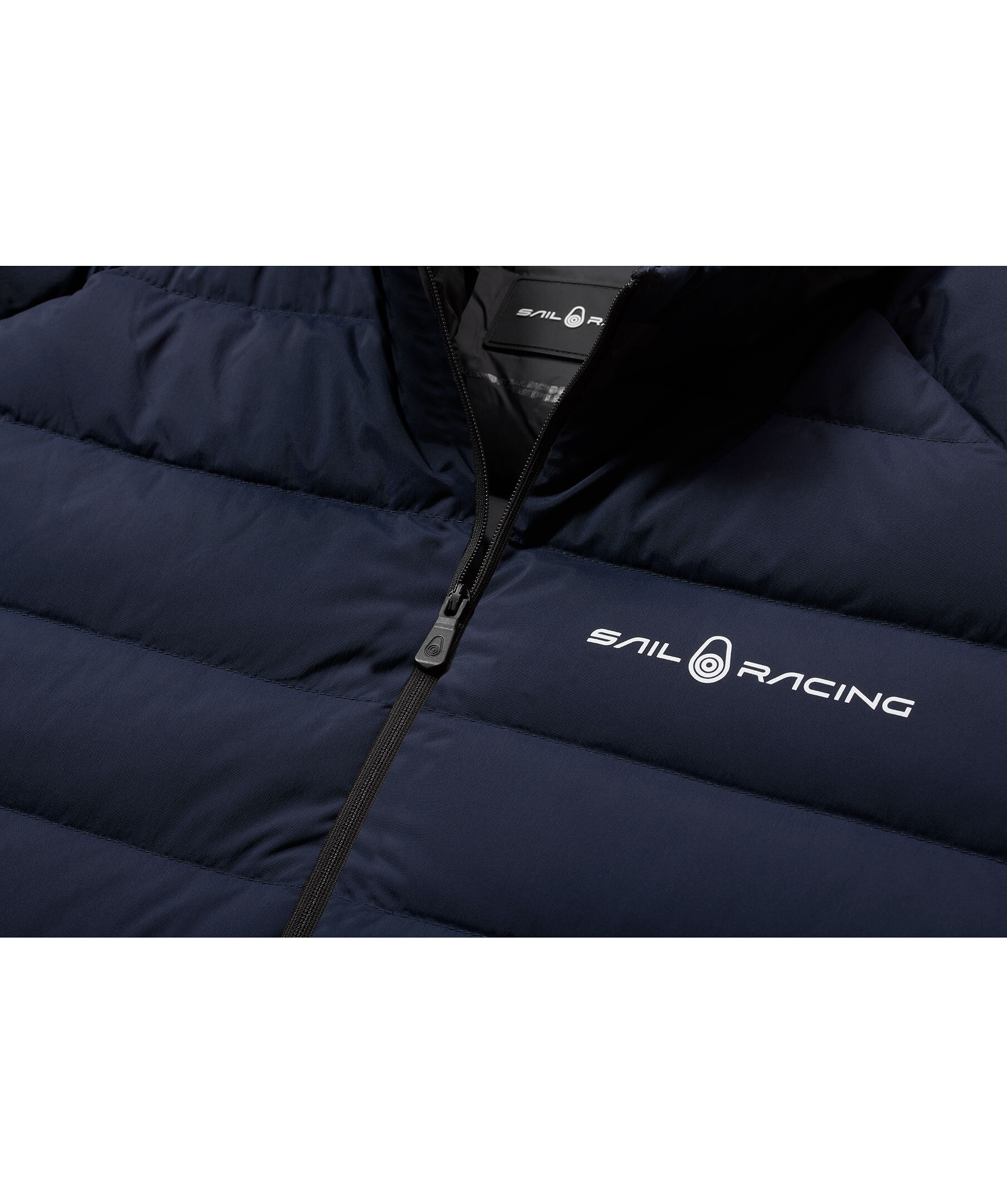 Mörkblå dunväst från Sail Racing. Logotyp tryckt på bröstet och i nacken, två fleecefodrade framfickor med dragkedja och en innerficka. Stängs med dragkedja fram. Västen är vind- och vattenavvisande.