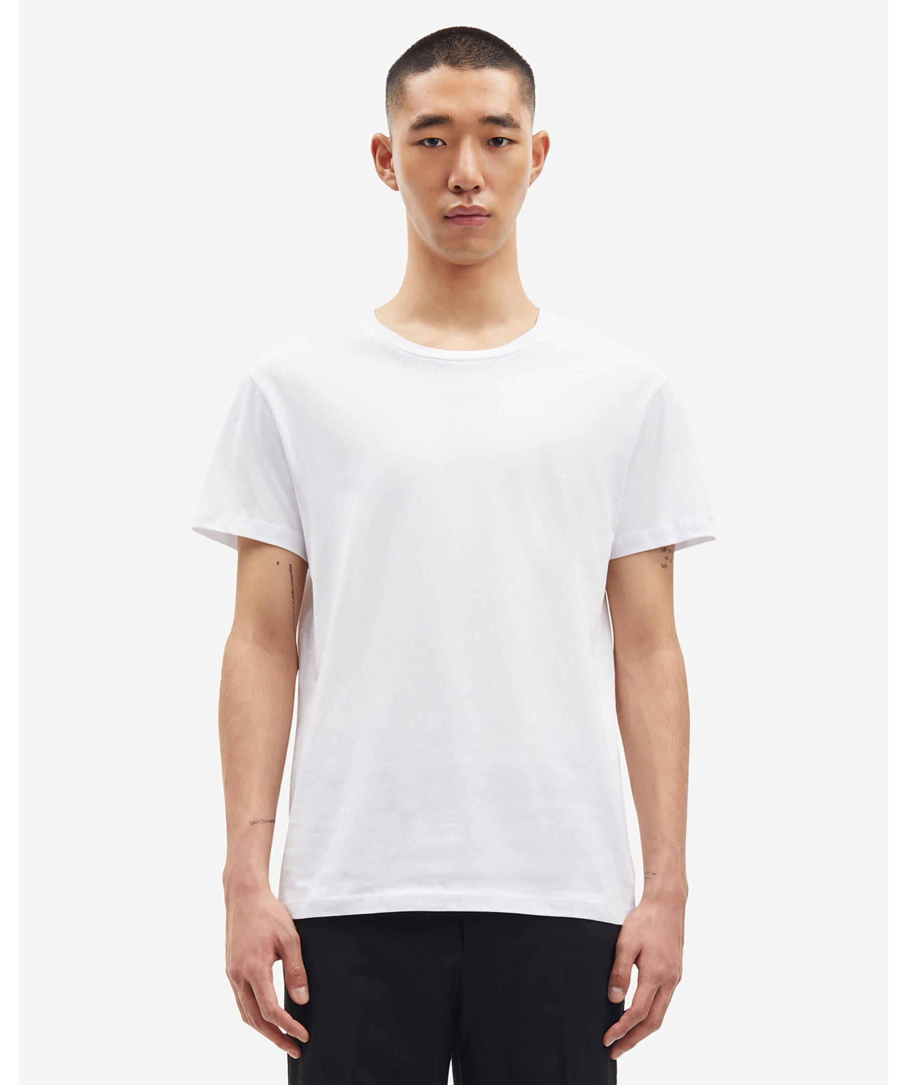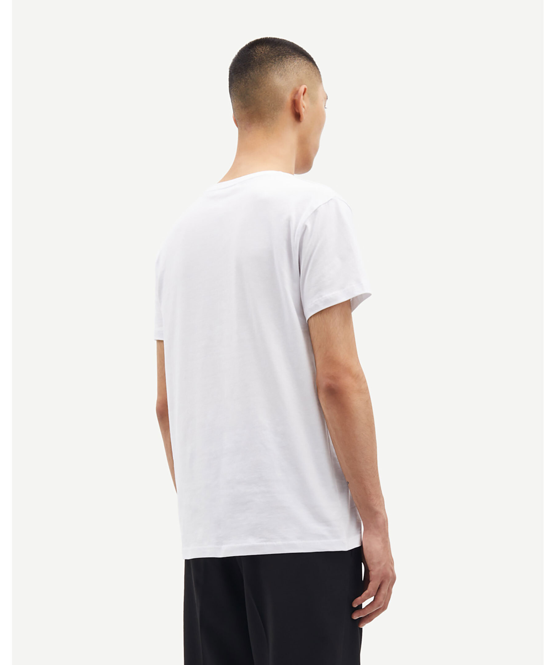 Vit t-shirt från Samsoe Samsoe. Rundhalsad och tillverkad av 100% ekologisk bomull. T-shirten har en avslappnad passform med korta ärmar och en finrandig design.