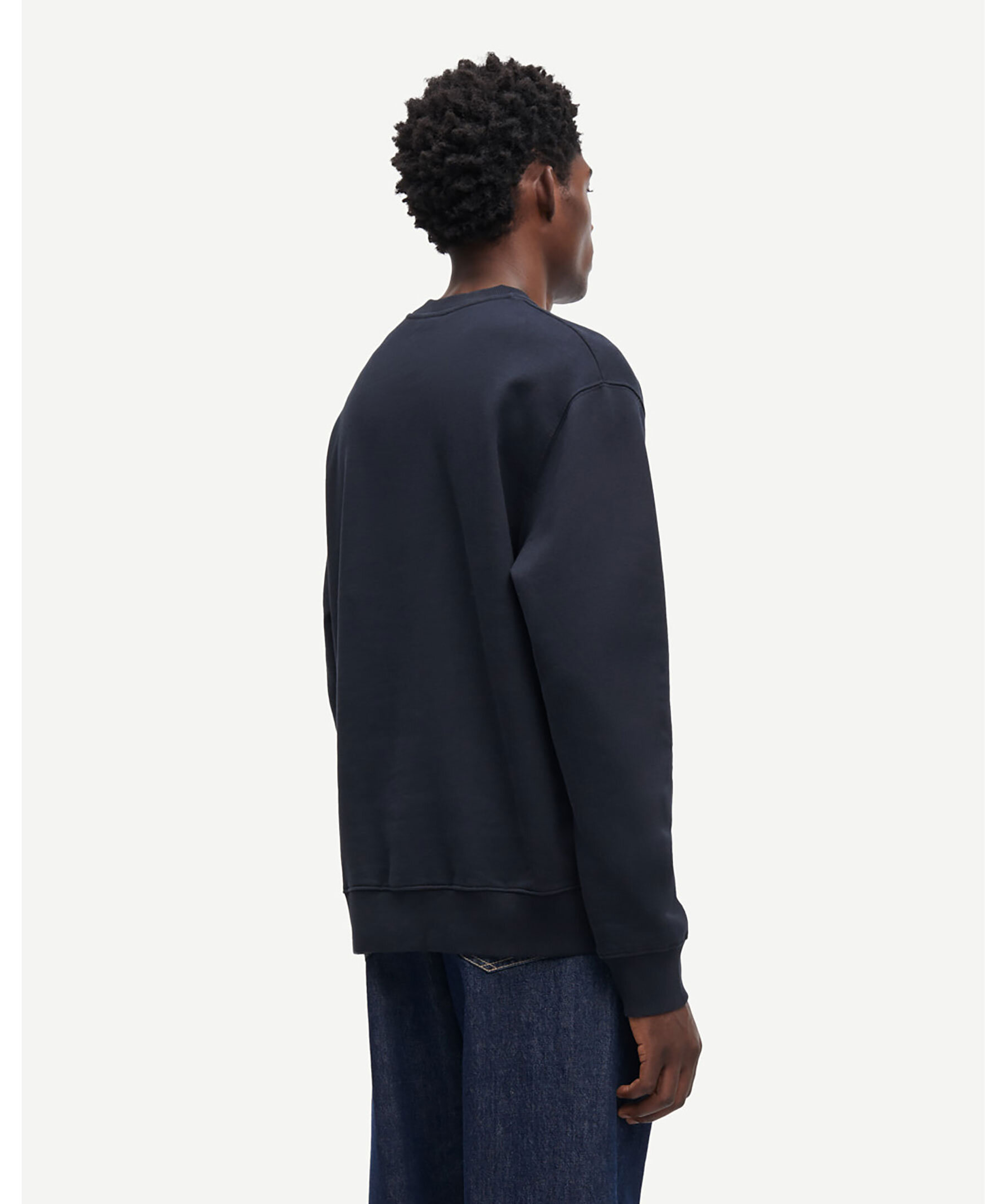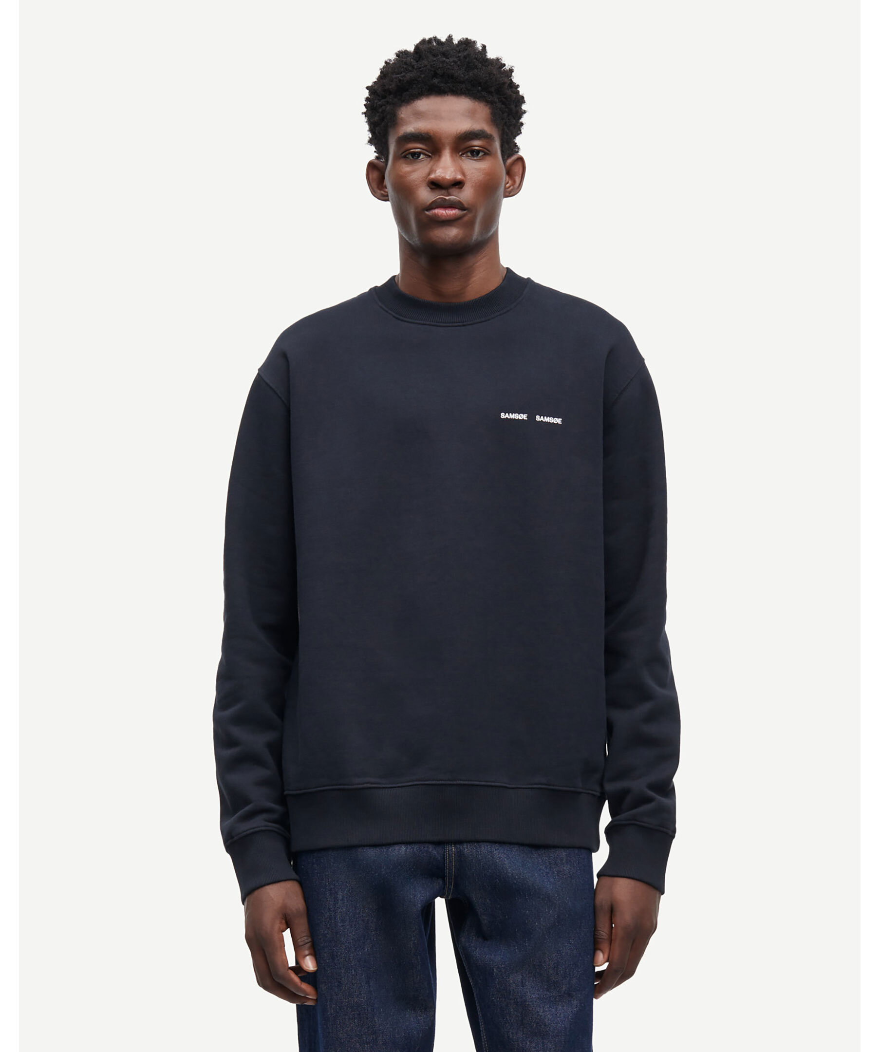 Mörkblå sweatshirt från Samsoe Samsoe. Tryckt logotyp i vitt på vänster bröst. Rundad halsringning, med ribbstickad mudd, ribbstickade muddar vid ärm- och plaggslut. Borstad insida.