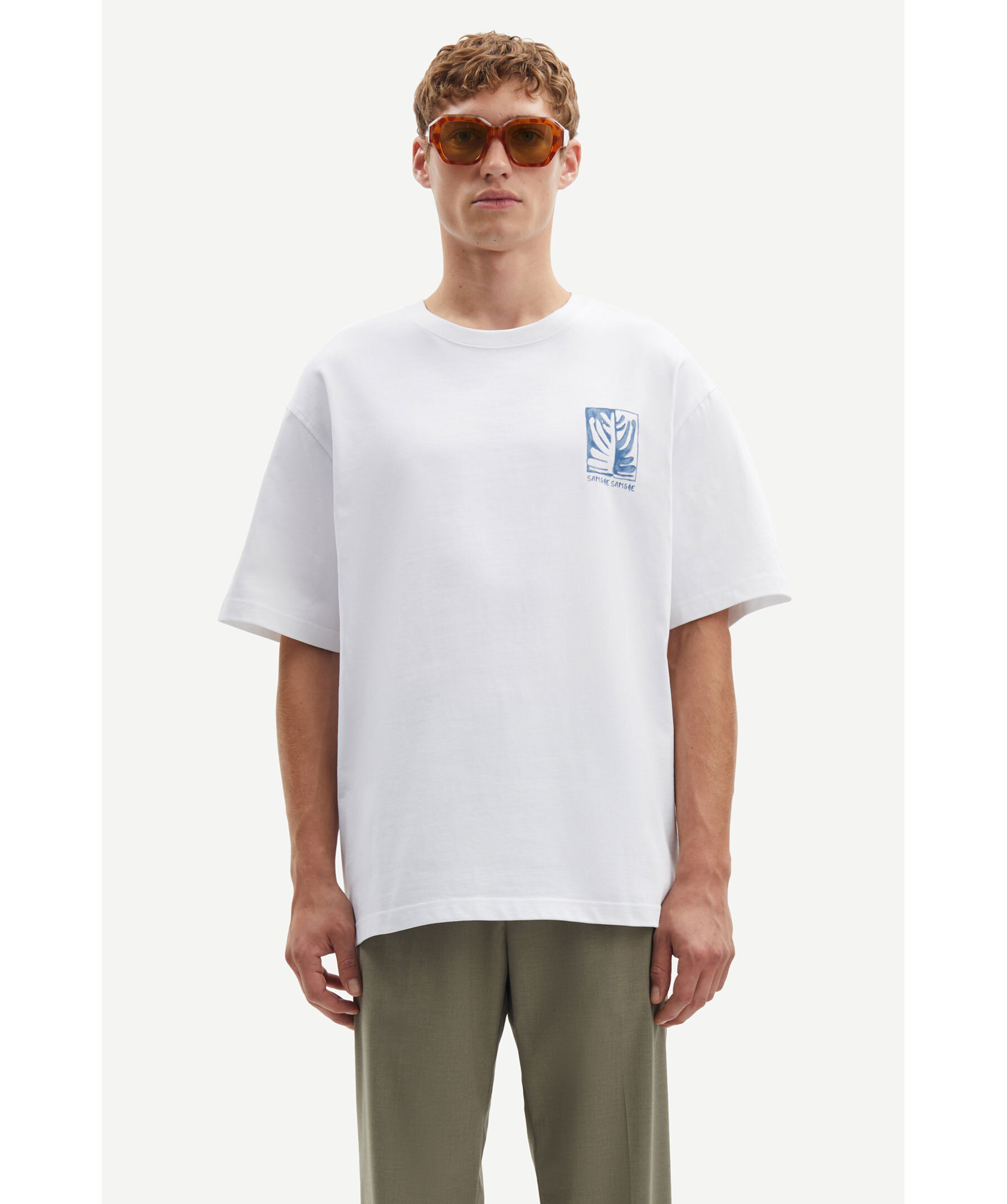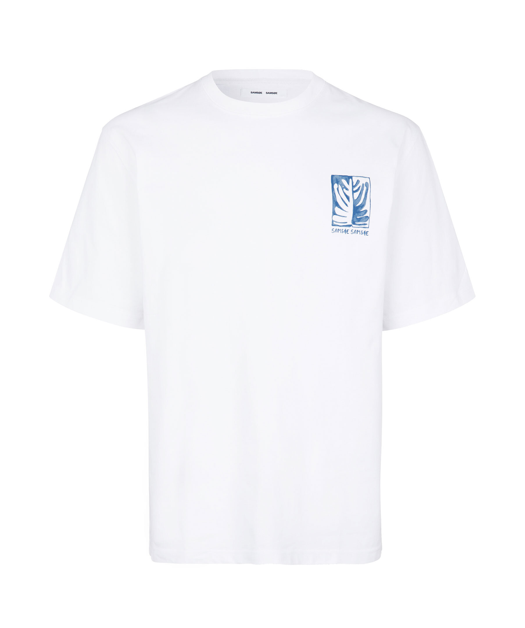 Vit t-shirt med blått tryck från Samsoe Samsoe. Litet tryck med logotyp på framsidan samt stort tryck på ryggen. Crewneck med ribbstickad krage. Lös passform med tappade axlar. Tillverkad i bomull.