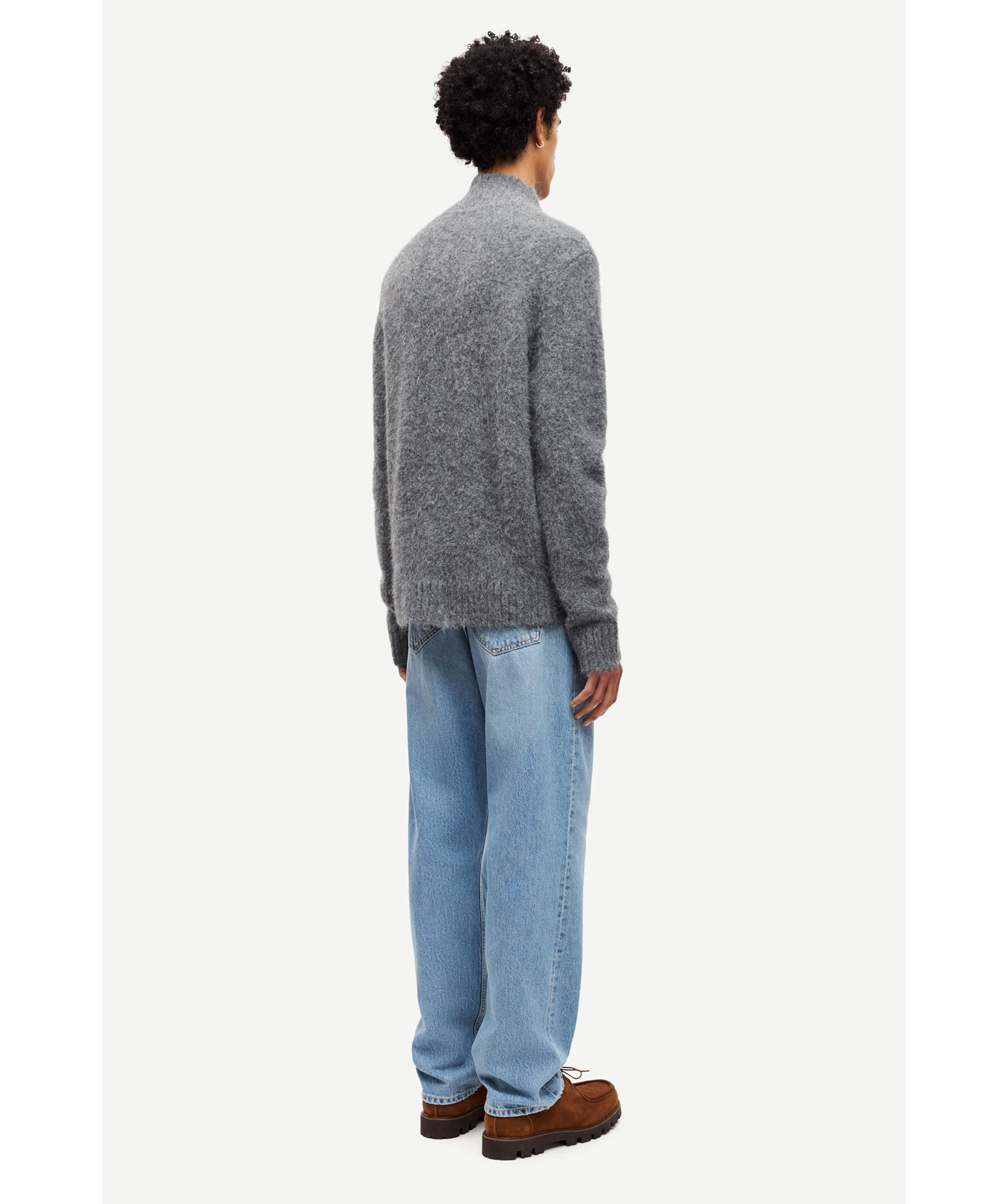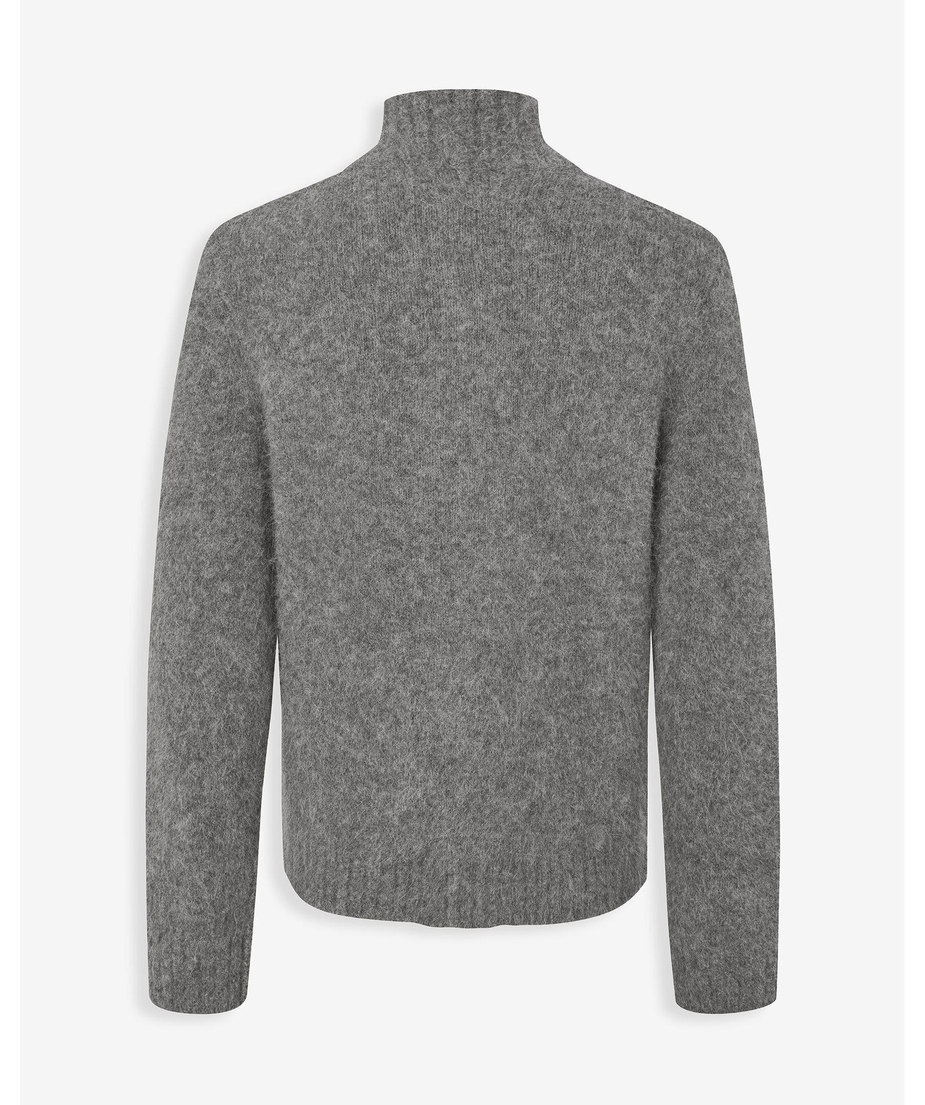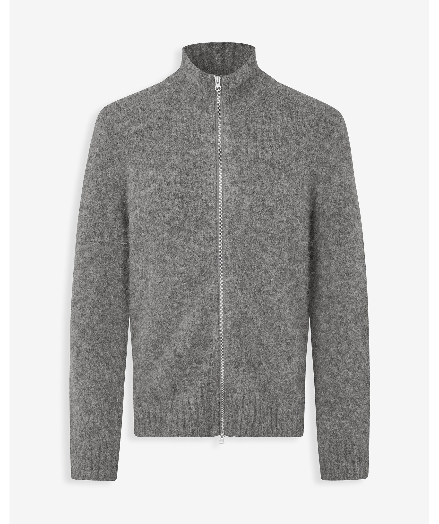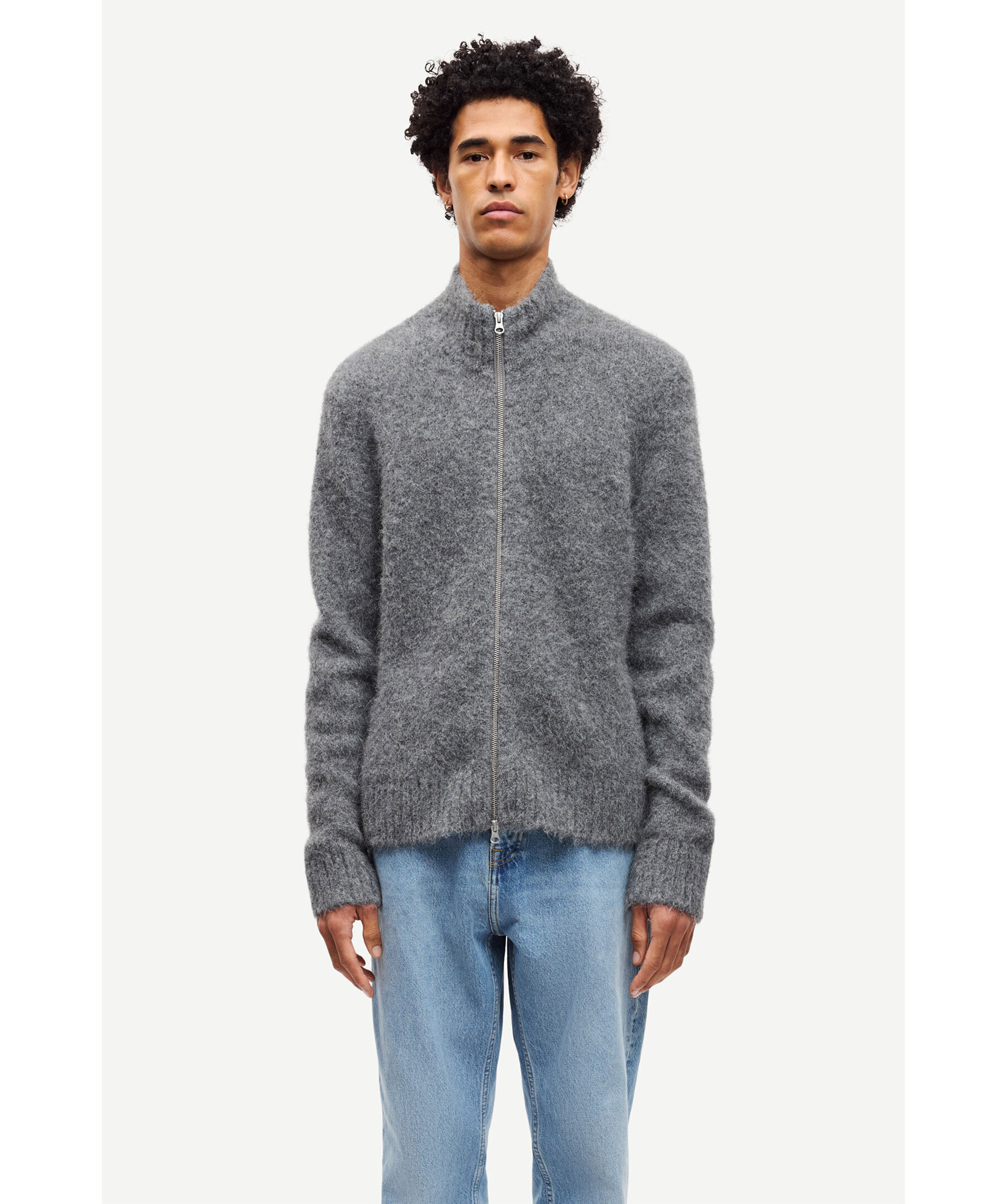 Grå, stickad kofta i en borstad look från Samsoe Samsoe. Koftan stängs med tvåvägsdragkedja framtill och har ribbstickad krage, ärmslut och fåll samt hög hals. Huvudmaterial tillverkat av en elastisk blandning med alpackaull.