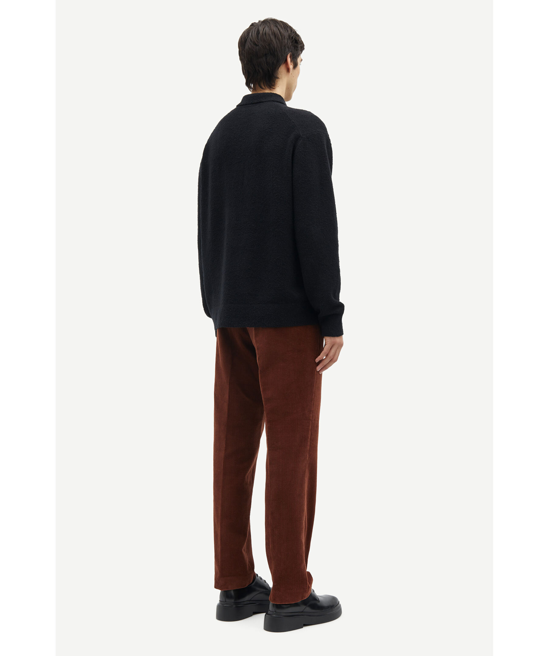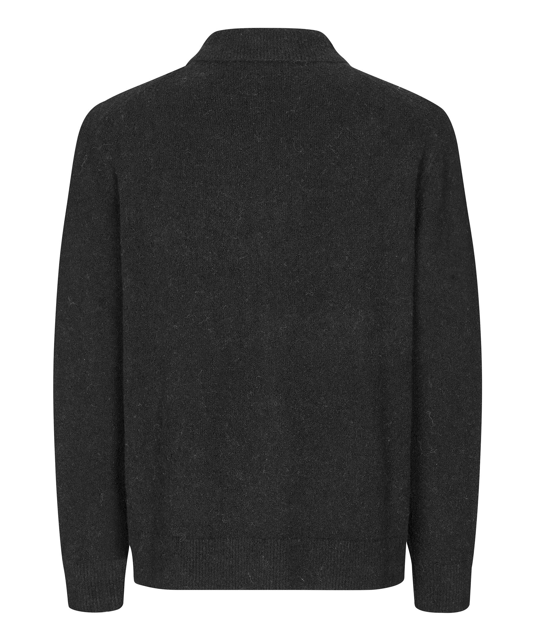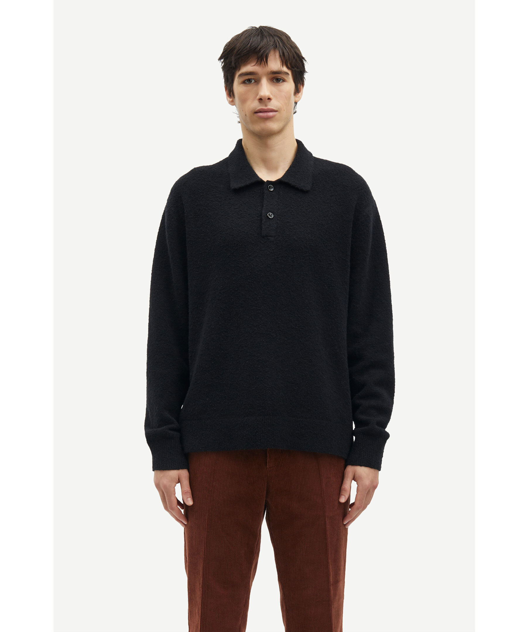 Svart, stickad och långärmad pikétröja från Samsoe Samsoe. Tröjan har två knappar framtill och ribbstickade muddar vid ärm- och plaggslut. Tillverkad i en bomull- och ullblandning.