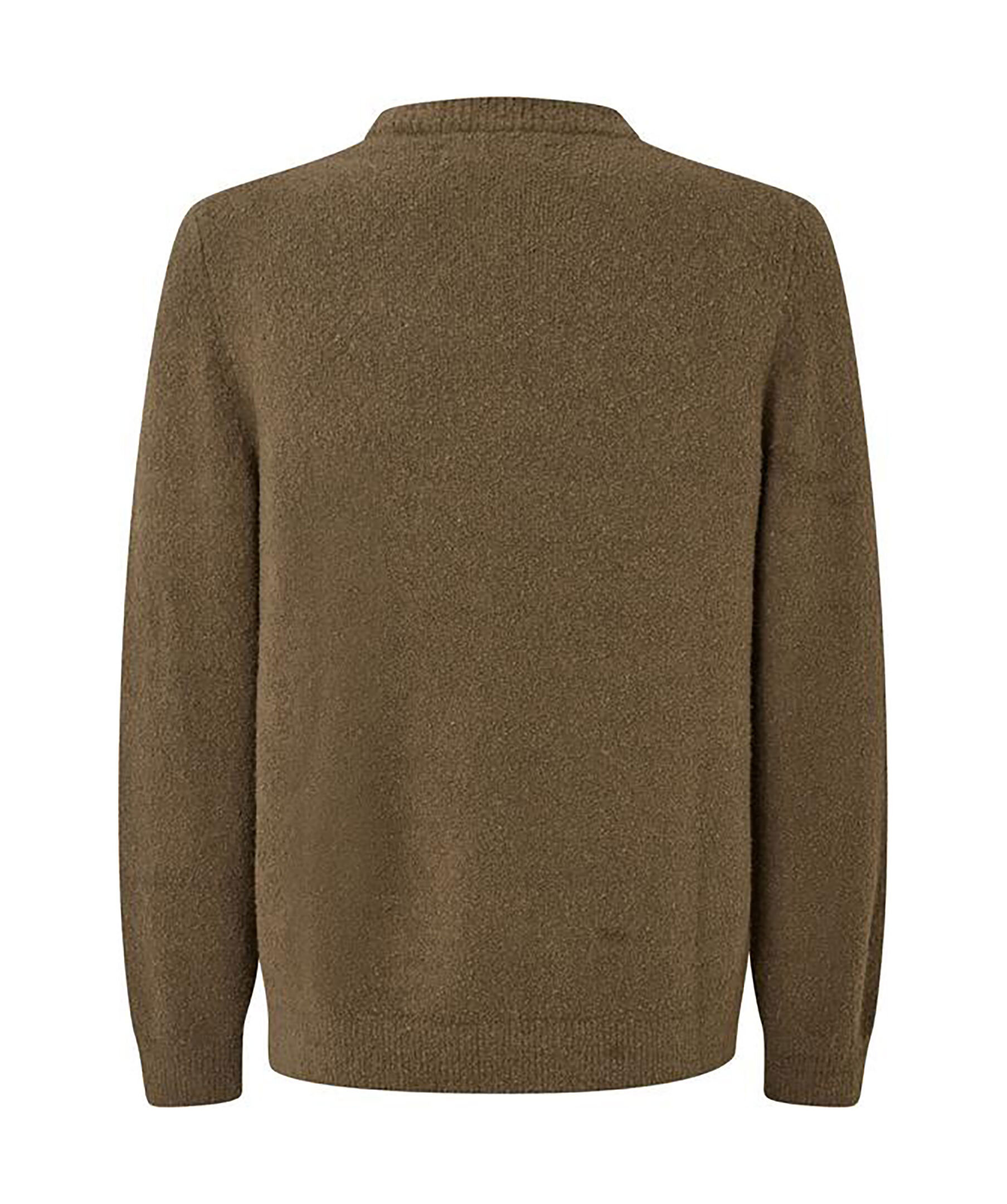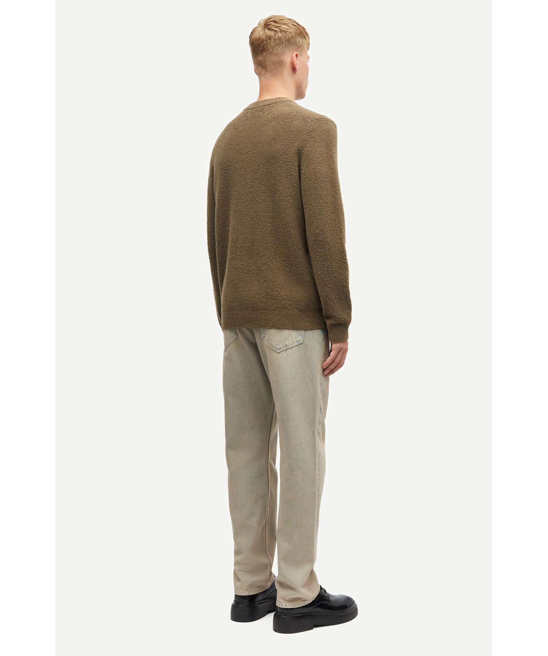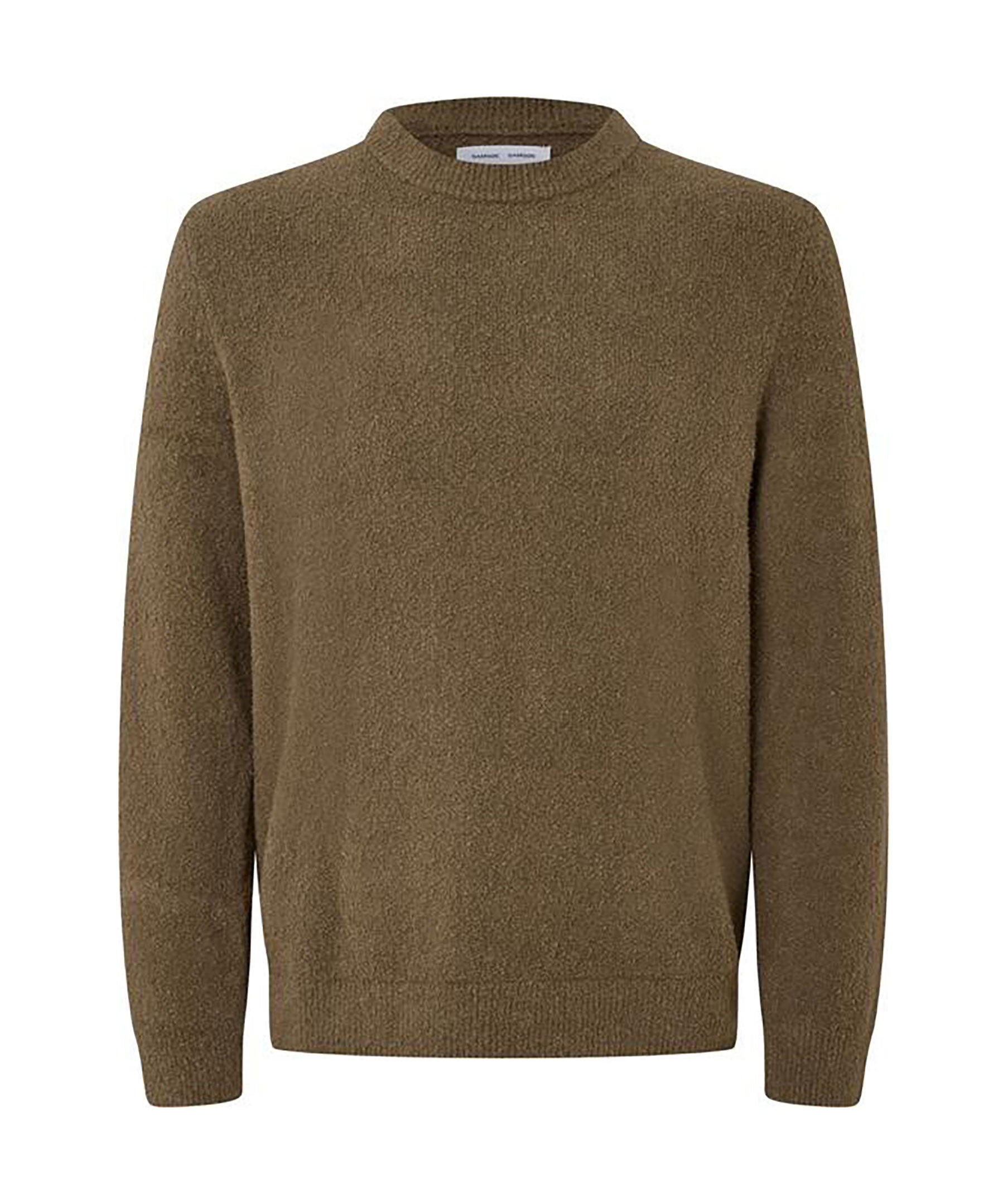 Brun tröja från Samsoe Samsoe. Tröjan har rinnstickad rund krage och ribbstickade ärm- och tröjslut. En elastisk tröja tillverkad av en bomullsblandning.