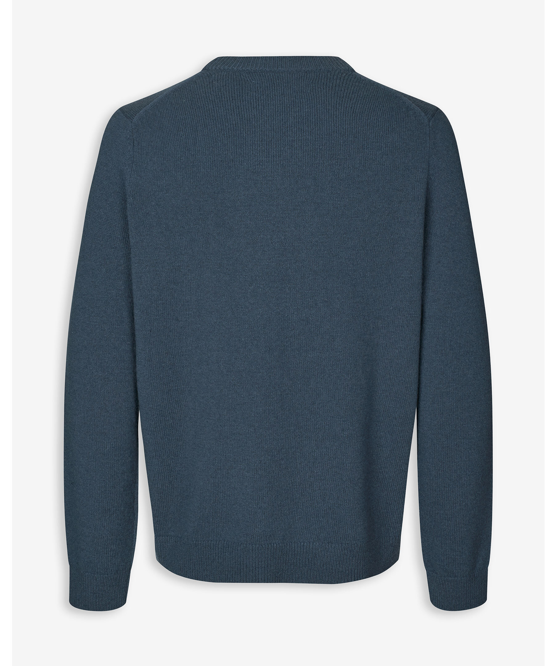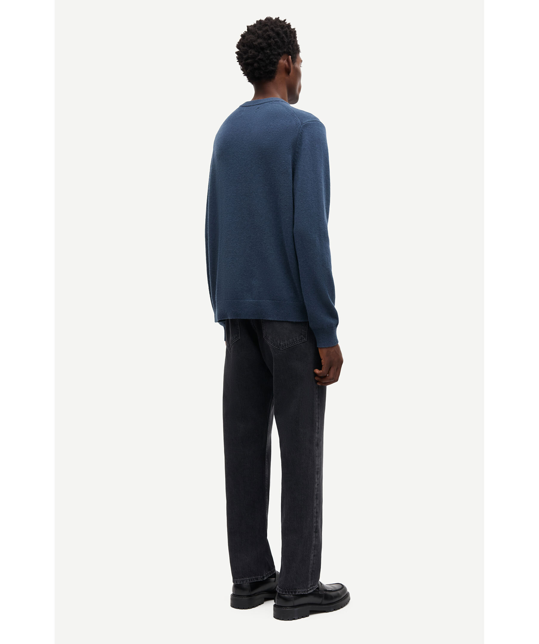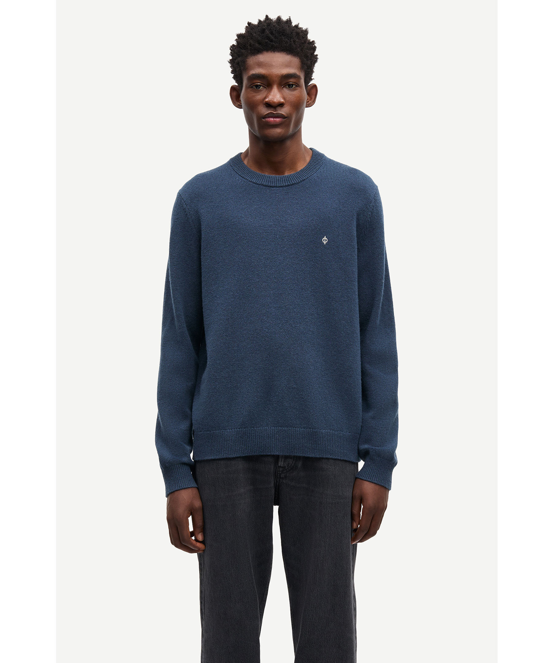 Stilren stickad pullover i blått från Samsøe Samsøe. Tröjan är gjord i en mjuk ullblandning och har en normal passform. Ribbstickad rund halsringning, ärmslut och nederkant. Diskret broderad logotyp på bröstet.
