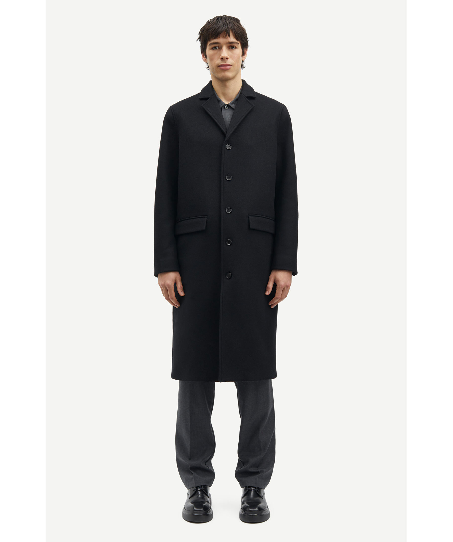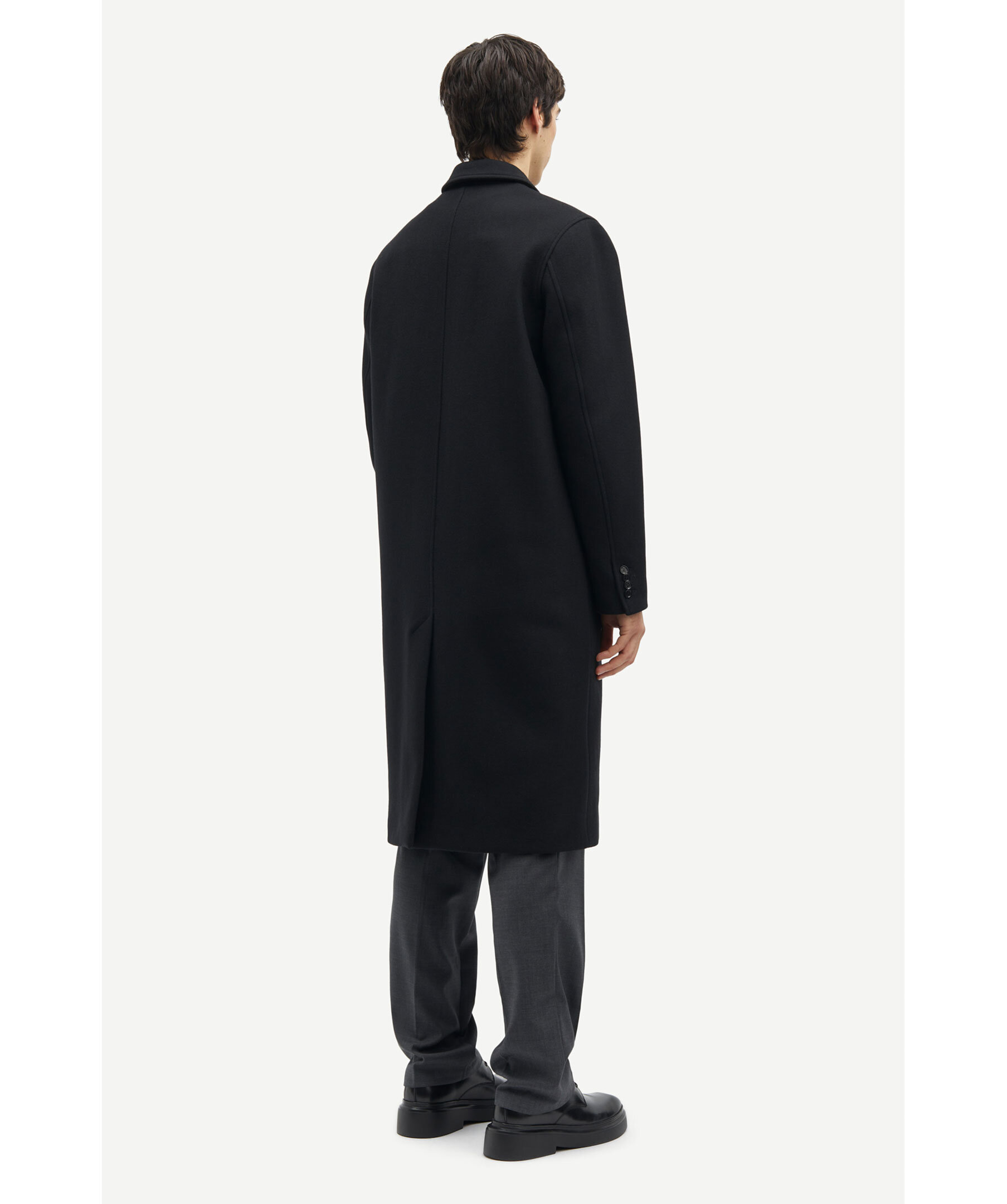 Svart ullrock från Samsoe Samsoe. Rocken är enkelknäppt framtill och har ärmslut med knäppning, två weltfickor med lock och en passpoalficka på insidan. Den är helfodrad och har sprund baktill. Tillverkad i en ullblandning.